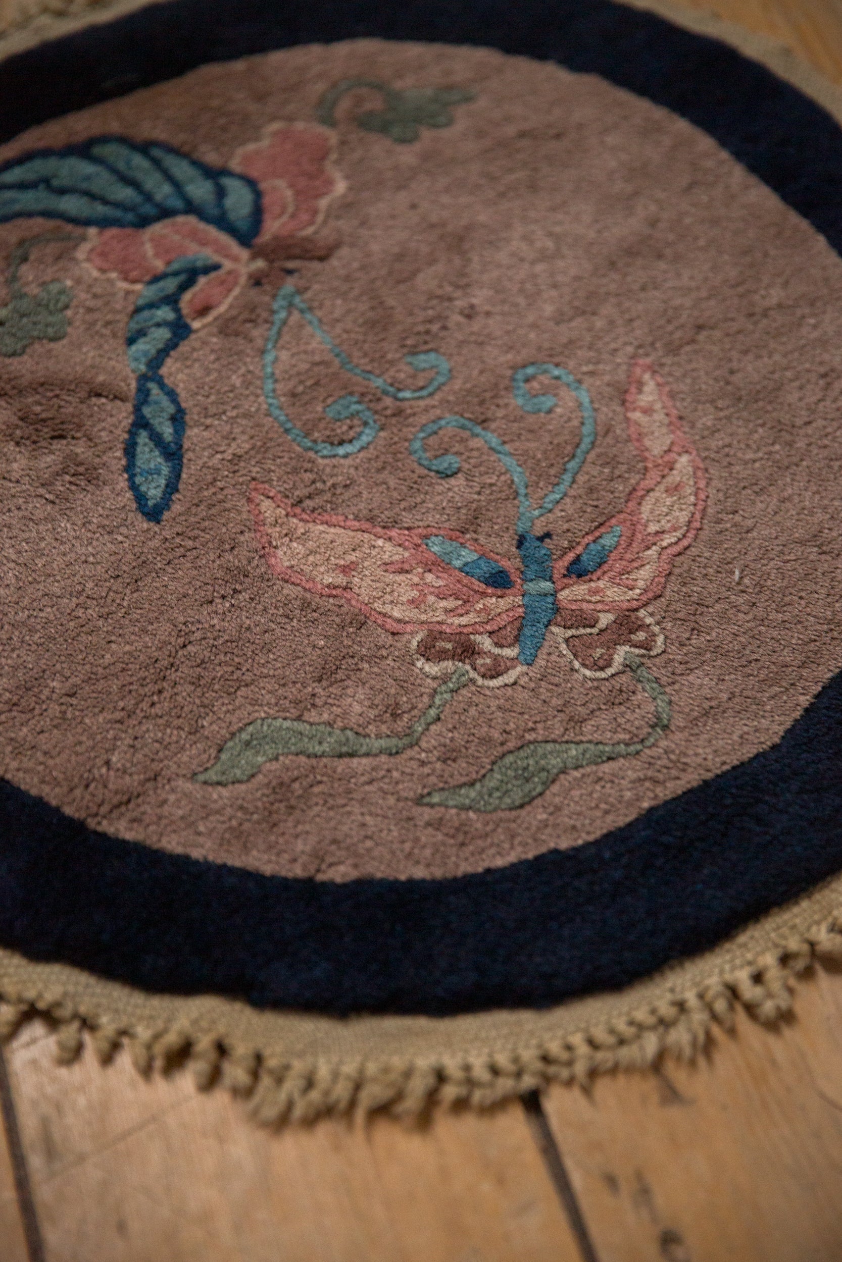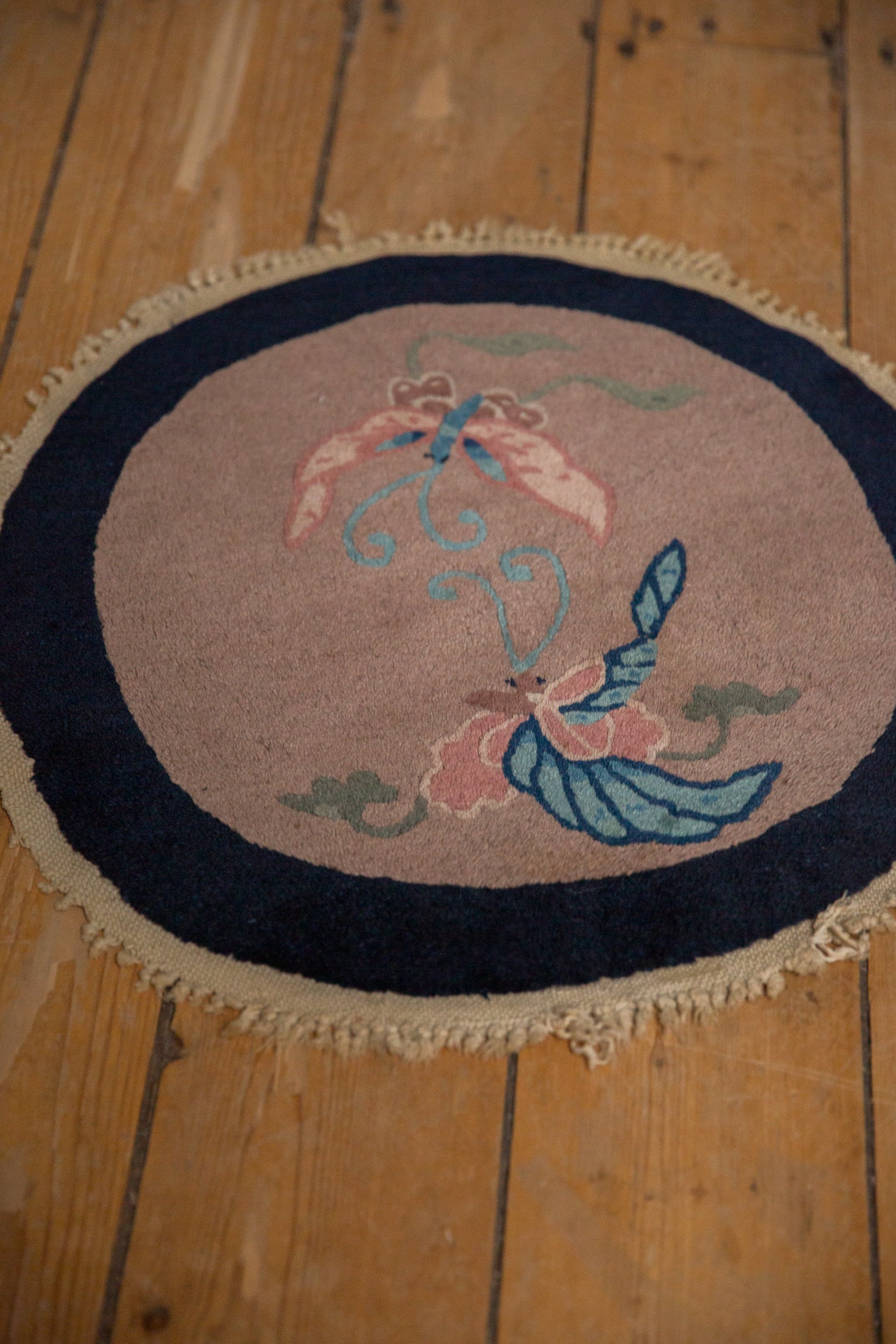 :: Two butterflies flying within an open field wrapped by a wide banded solid colored main border. Colors and shades include: Oxidized silver, navy blue, cobalt blue, powder blue, jade green, ivory, blush, pale coffee brown, and more. Condition notes: Mostly even short pile across. Most of the original side cord selvages are intact or restored. Fully secured sides and ends. Recently professionally cleaned ready for in-home use! Many years of enjoyment to come with this hand knotted Chinese Art Deco round rug mat made in China circa 1920's vintage. Size measures 1'6" x 1'6".