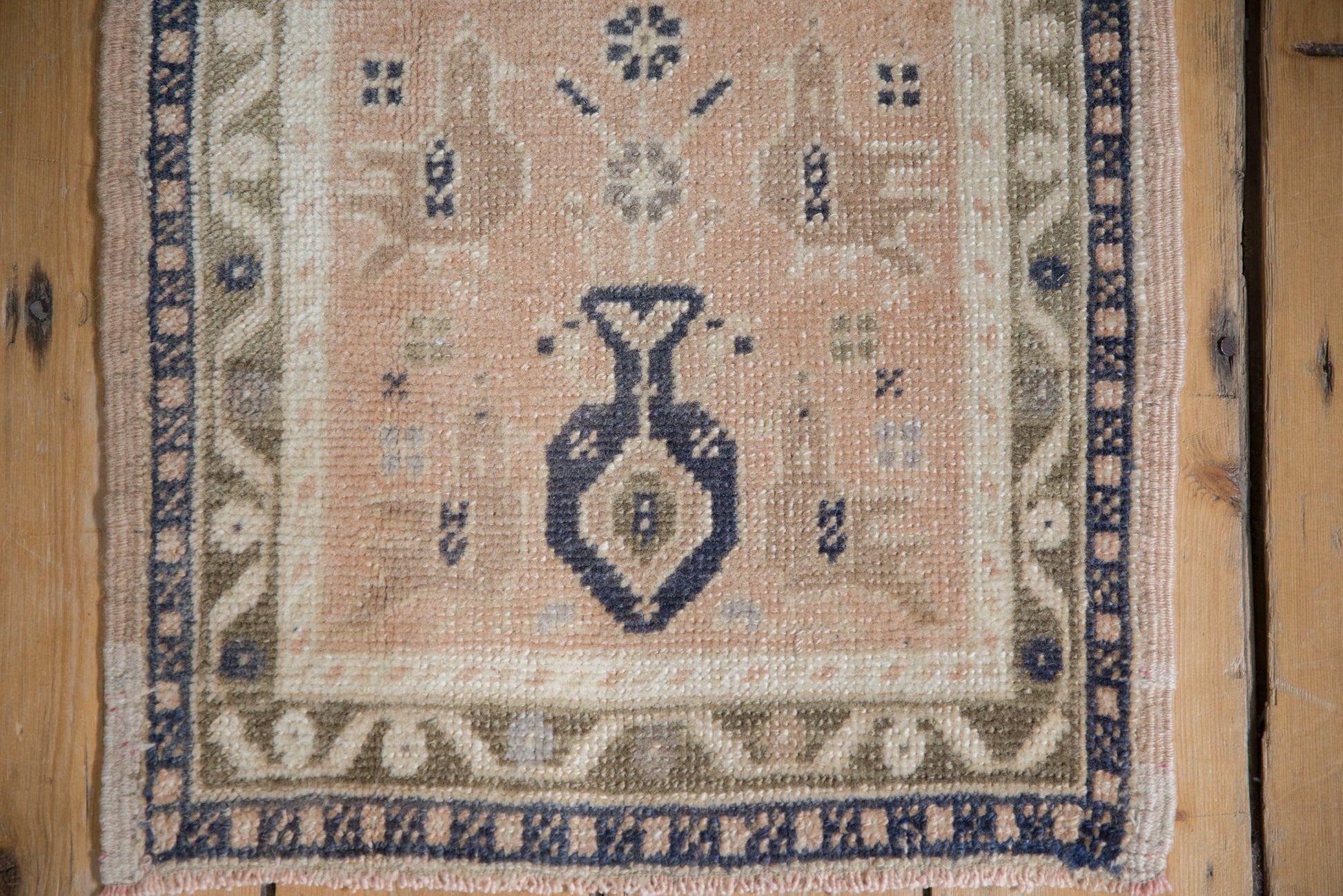 :: Tree of life design motif in a potted plant with meandering vine main border. Colors and shades include: Ivory, beige, dusty bronze, pale peach and more. Condition notes: Even wear across to knot heads. Most of the original side cord selvages are intact or restored. Fully secured sides and ends. For processing purposes, this and other rugs of the type may have painted numbers on the reverse side. Recently professionally cleaned ready for in-home use! Many years of enjoyment to come with this hand knotted Turkish Oushak square rug mat made in Turkey circa 1980's vintage. Size measures 1'7" x 1'7".