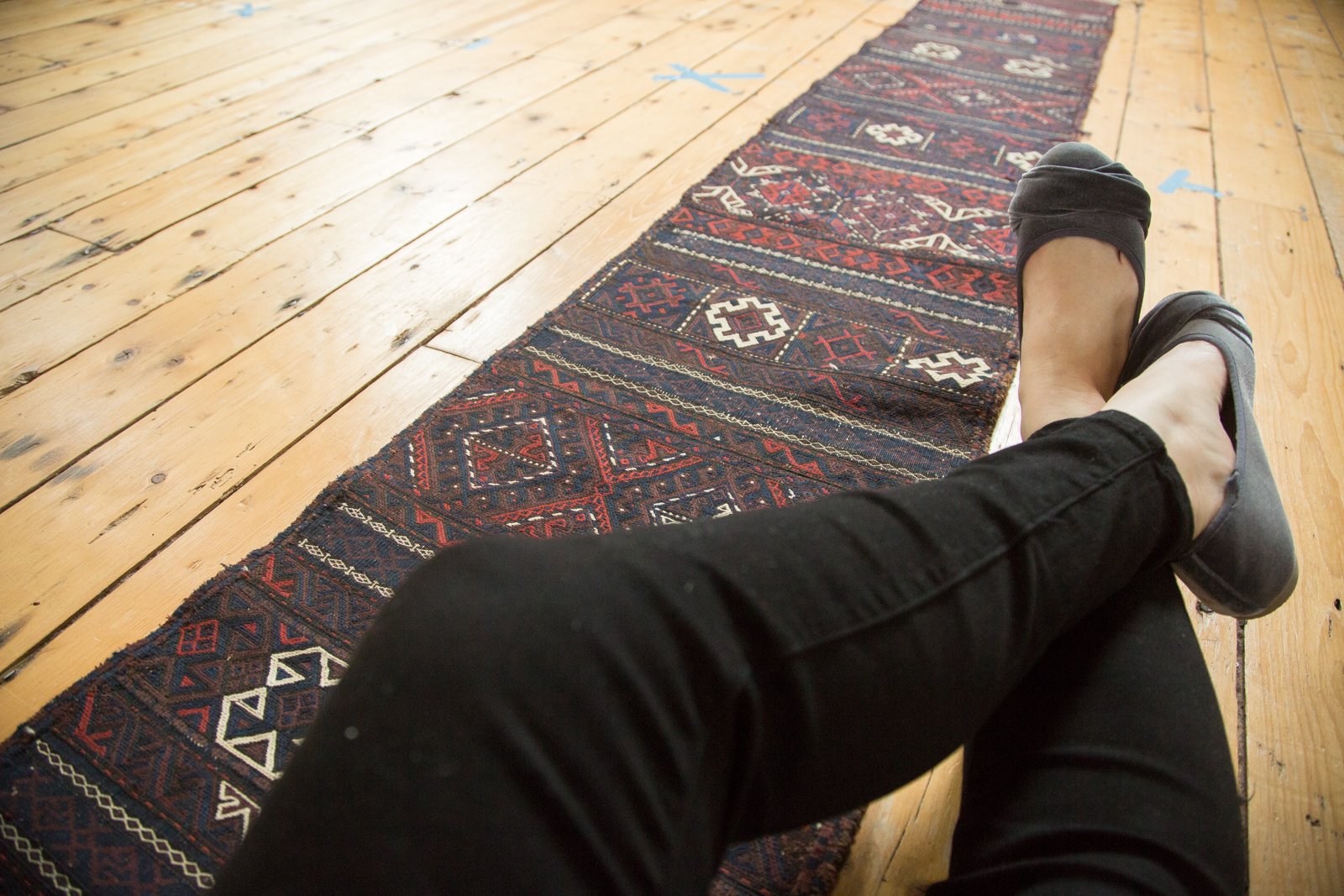 :: Unusually narrow and long belouch soumac with flat weave soumac and kilim. Fantastic contrast. Excellent classic traditional tones and finely woven.Colors and shades include: Dark brick red, charcoal brown black, coffee brown, bright ivory, and aubergine with a hint of wine red. Condition notes: Exhibiting minor signs of wear and use, mainly isolated to the ends. Recently professionally cleaned ready for in-home use! Many years of enjoyment to come with this hand woven Persian Belouch Soumac rug runner made in Persia circa 1920's vintage. Size measures 1'7" x 10'4".
