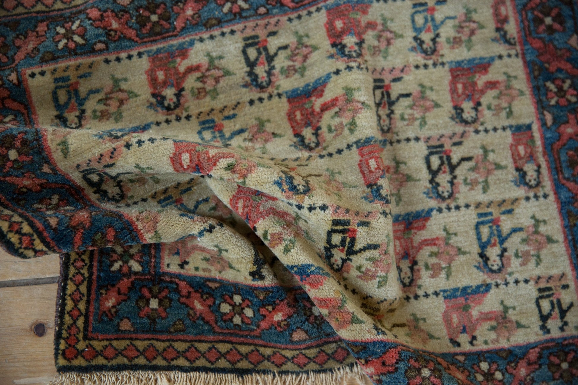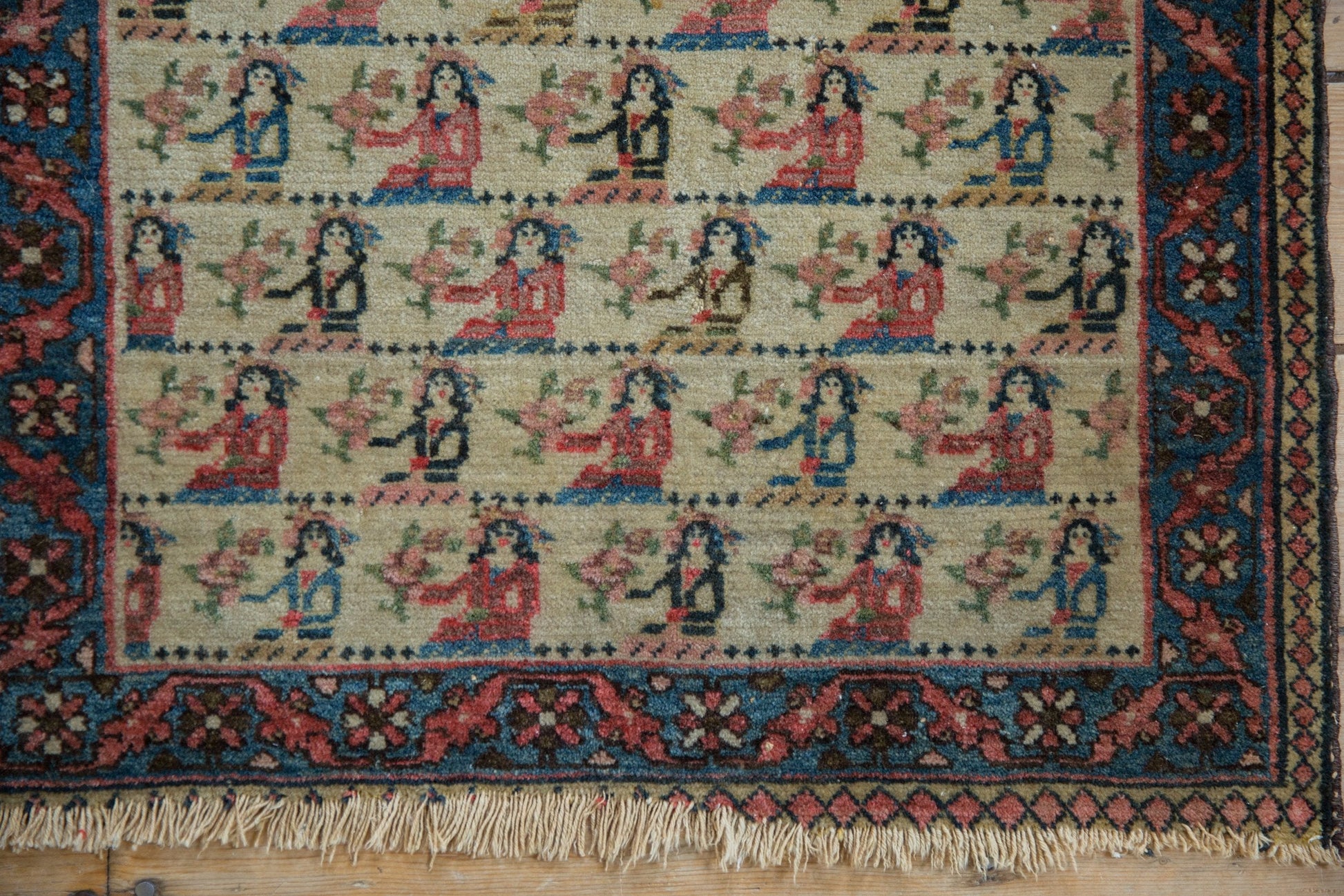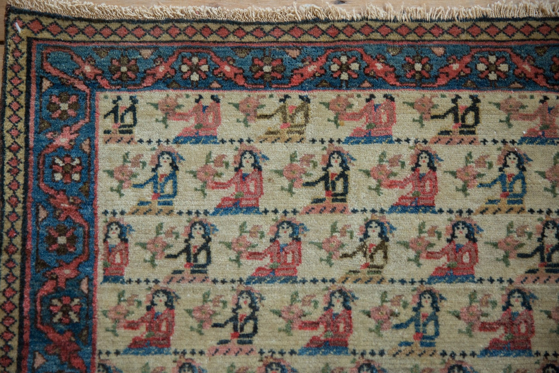 :: Covered repeating field in human pictorial design motif with top row of lovers and all subsequent in females presenting floral arrangements wrapped by a beautifully detailed continuous vine and floral main border.. Colors and shades include: Antique ivory, indigo blue, pale cochineal red, pale dusty gold, charcoal brown, and more. Condition notes: Fully secured sides, tatter to ends. This rug is wider than it is long, and sizes have been inverted from our normal convention to ensure presence in our size range search filter. Recently professionally cleaned ready for in-home use! Many years of enjoyment to come with this hand knotted Persian Northwest Persian rug mat made in Persia circa 1920's vintage. Size measures 1'9" x 2'4".