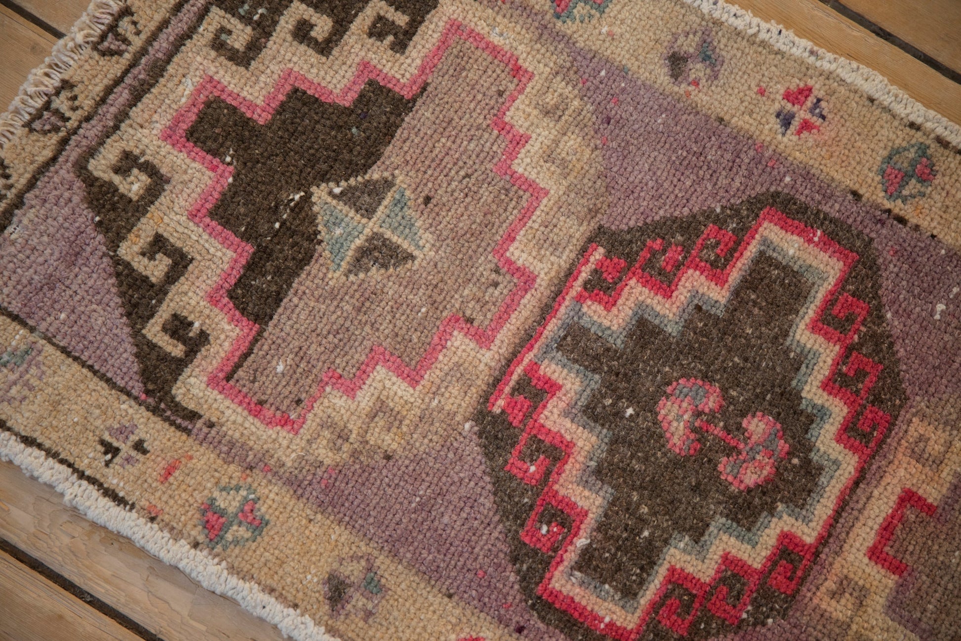 :: Triple center medallion with hook and latch stepped contour wrapped by side borders of geometric pinwheel floral blossoms with unique artistic merit in drawing. Colors and shades include: Mauve, sand, chocolate brown, dusty cherry red, oxidized silver, beige, and more. Condition notes: Mostly even wear across to knot heads with small isolated areas of foundation showing through. Most of the original side cord selvages are intact or restored. Fully secured sides and ends. One end outer minor border reduced, opposing end several rows of knots removed. Kindly note rugs of this type, age and size are not intended to be perfect - they are often woven in informal settings, on small wooden looms, which renders charming character and slightly irregular shape. For processing purposes, this and other rugs of the type may have painted numbers on the reverse side. Recently professionally cleaned ready for in-home use! Many years of enjoyment to come with this hand knotted Turkish Kars rug mat made in Turkey circa 1970's vintage. Size measures 1'7" x 2'7".