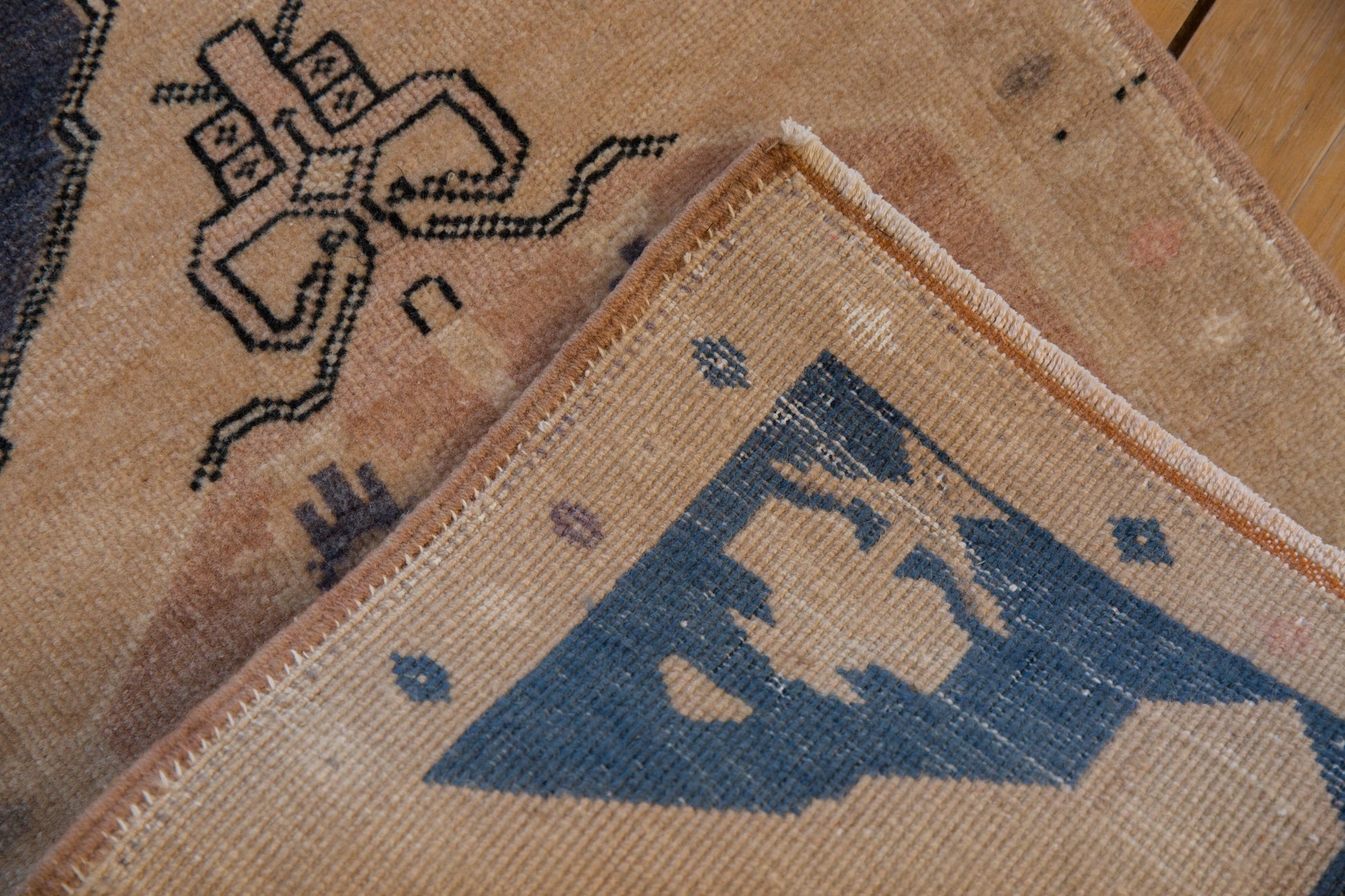 :: Oversized center medallion with simplistic long stemmed blossom palmettes and large scale finials atop an open field with inwardly directed blossomed germinating plants in each corner spandrel. Color change and abrashes throughout adding to great dynamic and charming character. Colors and shades include: Ivory, cream, beige, dusty dark denim blue, charcoal, dusty sandalwood and more. Condition notes: Even, short pile height across. Original side cord selvages intact. Fully secured sides and ends. For processing purposes, this and other rugs of the type may have painted numbers on the reverse side. Recently professionally cleaned ready for in-home use! Many years of enjoyment to come with this hand knotted Turkish Oushak rug mat made in Turkey circa 1980's vintage. Size measures 1'9" x 2'8".