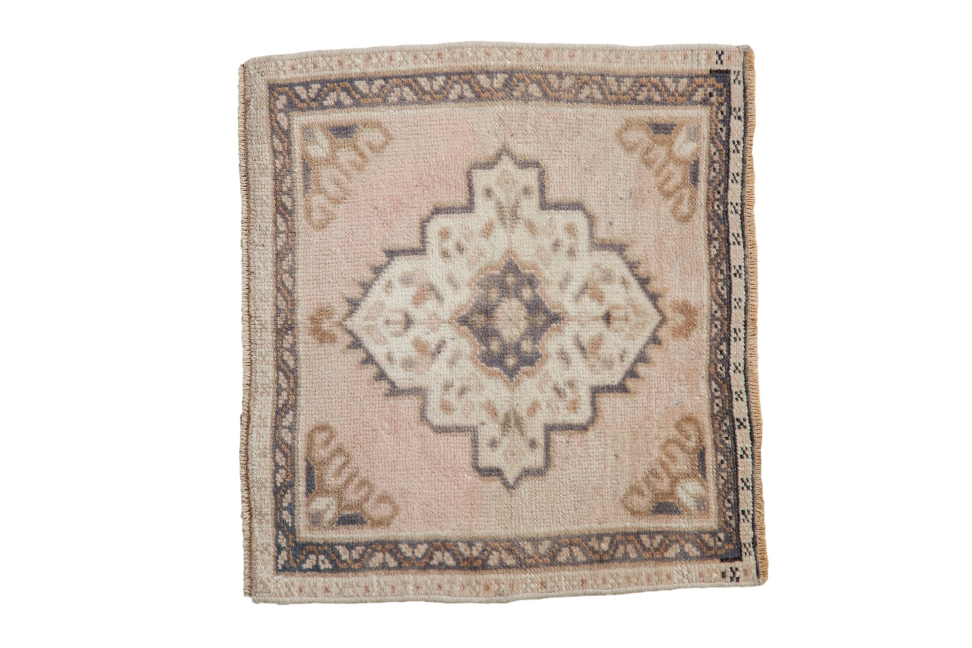 :: Center medallion with interior floral blossoms wrapped by meandering vine and checker borders. Colors and shades include: Dusty rose, dusty teal blue, ivory, dusty pale pink, and more. Condition notes: Mostly even wear across to knot heads. Fully secured sides and ends. Machine bound sides and ends. This rug is wider than it is long, and sizes have been inverted from our normal convention to ensure presence in our size range search filter. For processing purposes, this and other rugs of the type may have painted numbers on the reverse side. Recently professionally cleaned ready for in-home use! Many years of enjoyment to come with this hand knotted Turkish Oushak square rug mat made in Turkey circa 1980's vintage. Size measures 1'9" x 1'11".