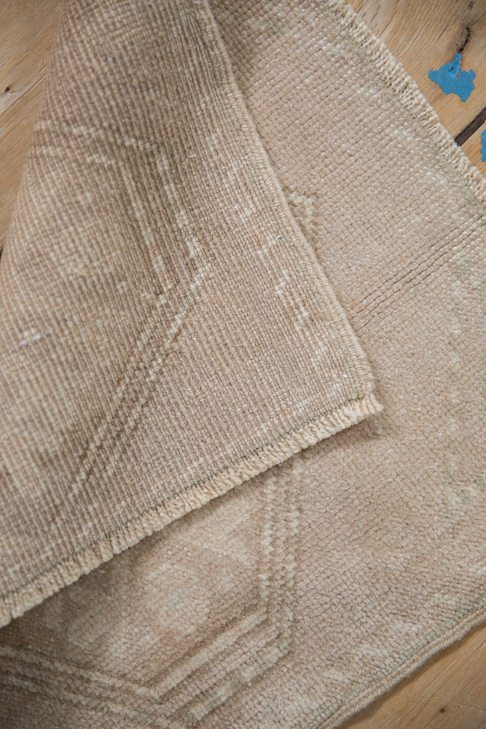 :: Offset oversized center gul floral medallion in geometric contour atop a partially open field and narrow banded meandering vine main border bearing ribboned color fills across all enveloping details. Colors and shades include: Ivory, beige, cream, pale coffee brown and more. Condition notes: Even wear across to knot heads. Most of the original side cord selvages are intact or restored. Fully secured sides and ends. This rug is wider than it is long, and sizes have been inverted from our normal convention to ensure presence in our size range search filter. For processing purposes, this and other rugs of the type may have painted numbers on the reverse side. Recently professionally cleaned ready for in-home use! Many years of enjoyment to come with this hand knotted Turkish Oushak square rug mat made in Turkey circa 1980's vintage. Size measures 1'5" x 1'9".