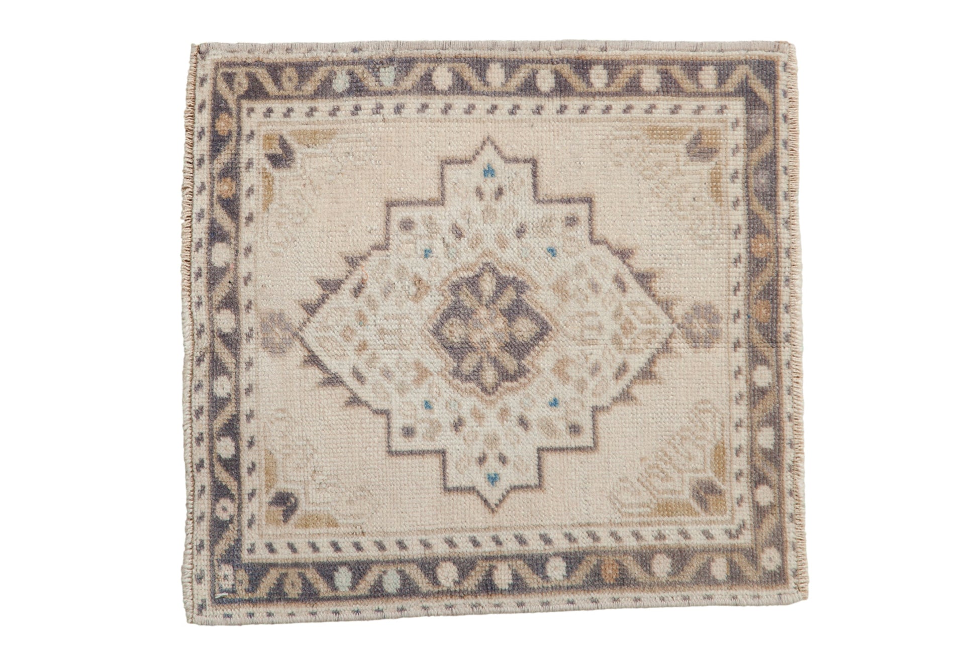 :: Oversized center medallion with geometric finned blossoms wrapped by meandering vine and pearl seed main border. Colors and shades include: Cream, ivory, oxidized silver, beige, coffee brown, and more. Condition notes: Even wear across to knot heads. Fully secured sides and ends. Machine bound sides and ends. For processing purposes, this and other rugs of the type may have painted numbers on the reverse side. Recently professionally cleaned ready for in-home use! Many years of enjoyment to come with this hand knotted Turkish Oushak square rug mat made in Turkey circa 1980's vintage. Size measures 1'8" x 1'9".