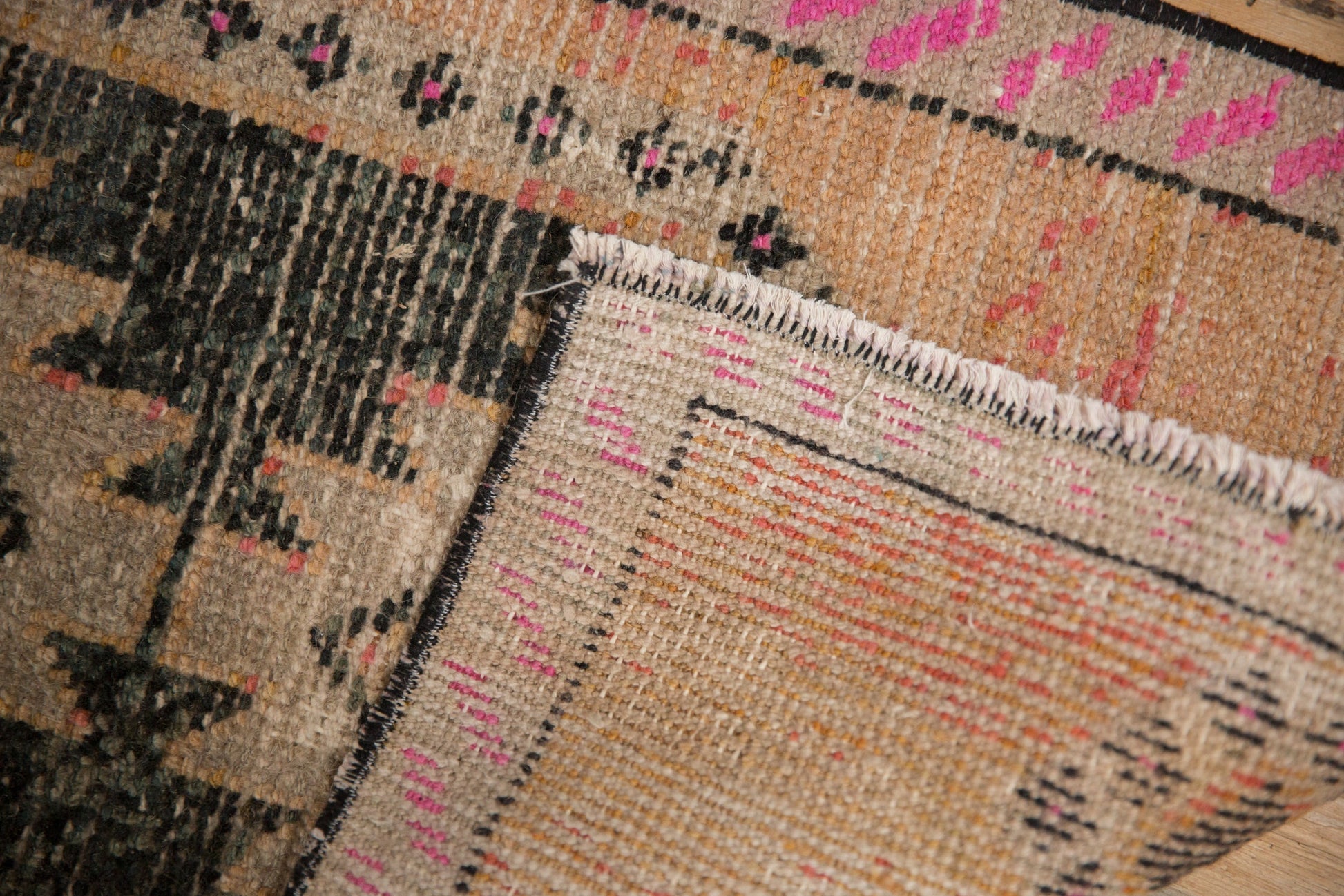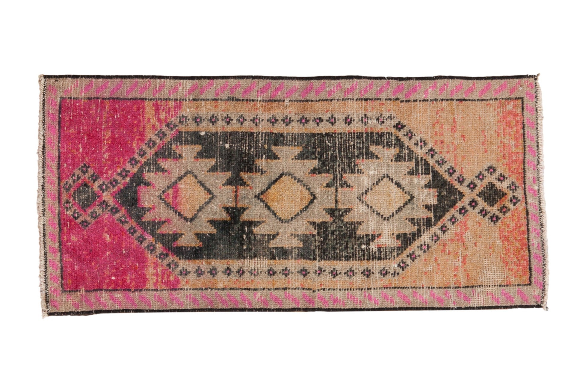 :: Triple center medallions in lightening serrated contour within a larger cartouche delineated medallion defined by a seeded enveloping design element. Heavy abrashes across. Colors and shades include: Dusty melon, charcoal, magenta, fuchsia, silver, and more. Condition notes: Mostly even wear across to knot heads with small isolated areas of foundation showing through. Secure sides, fully secured ends. Machine bound sides and ends. For processing purposes, this and other rugs of the type may have painted numbers on the reverse side. Recently professionally cleaned ready for in-home use! Many years of enjoyment to come with this hand knotted Turkish Kars rug mat runner made in Turkey circa 1970's vintage. Size measures 1'8" x 3'4".