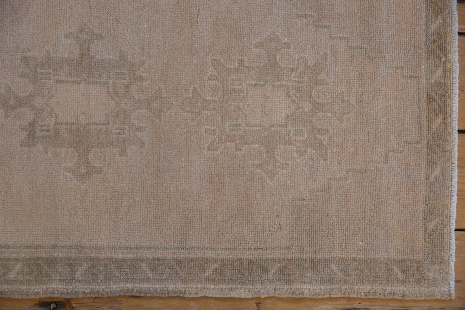 :: Triple center medallion in dramatic relief atop an open field wrapped by stepped end corner spandrels and meandering vine main border. Colors and shades include: Antique ivory, beige, sand, cream and more. Condition notes: Even wear across to knot heads. Original side cord selvages intact. Fully secured sides and ends. For processing purposes, this and other rugs of the type may have painted numbers on the reverse side. Recently professionally cleaned ready for in-home use! Many years of enjoyment to come with this hand knotted Turkish Oushak rug mat runner made in Turkey circa 1980's vintage. Size measures 1'9" x 3'4".
