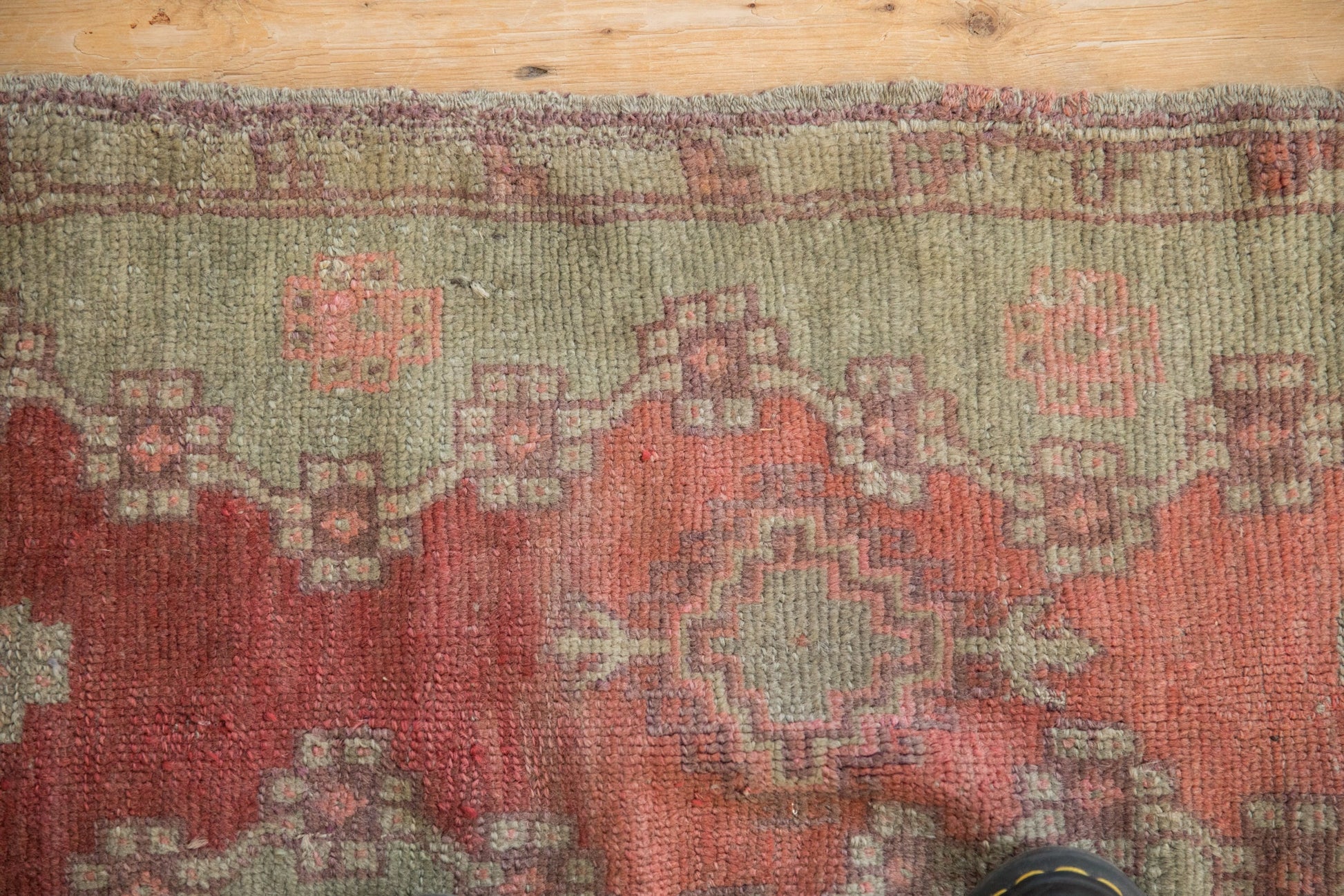:: Center diamond shaped medallion with hook and latch motif adorned at either end by minor germinating finials. Scattered field overlays of floral top views interconnected by vines. Outer border in a simplistic meandering vine and three petal flower design motif. Colors and shades include: Ruby red grapefruit, seafoam green, mauve, dusty pale aubergine, dusty rose, and more. Condition notes: Even wear across to knot heads with faint foundation showing through. Most of the original side cord selvages are intact or restored. Fully secured sides and ends. Loss and tatter to the ends and perimeter. Recently professionally cleaned ready for in-home use! Many years of enjoyment to come with this hand knotted Turkish Oushak rug mat made in Turkey circa 1920's vintage. Size measures 1'6" x 2'10".