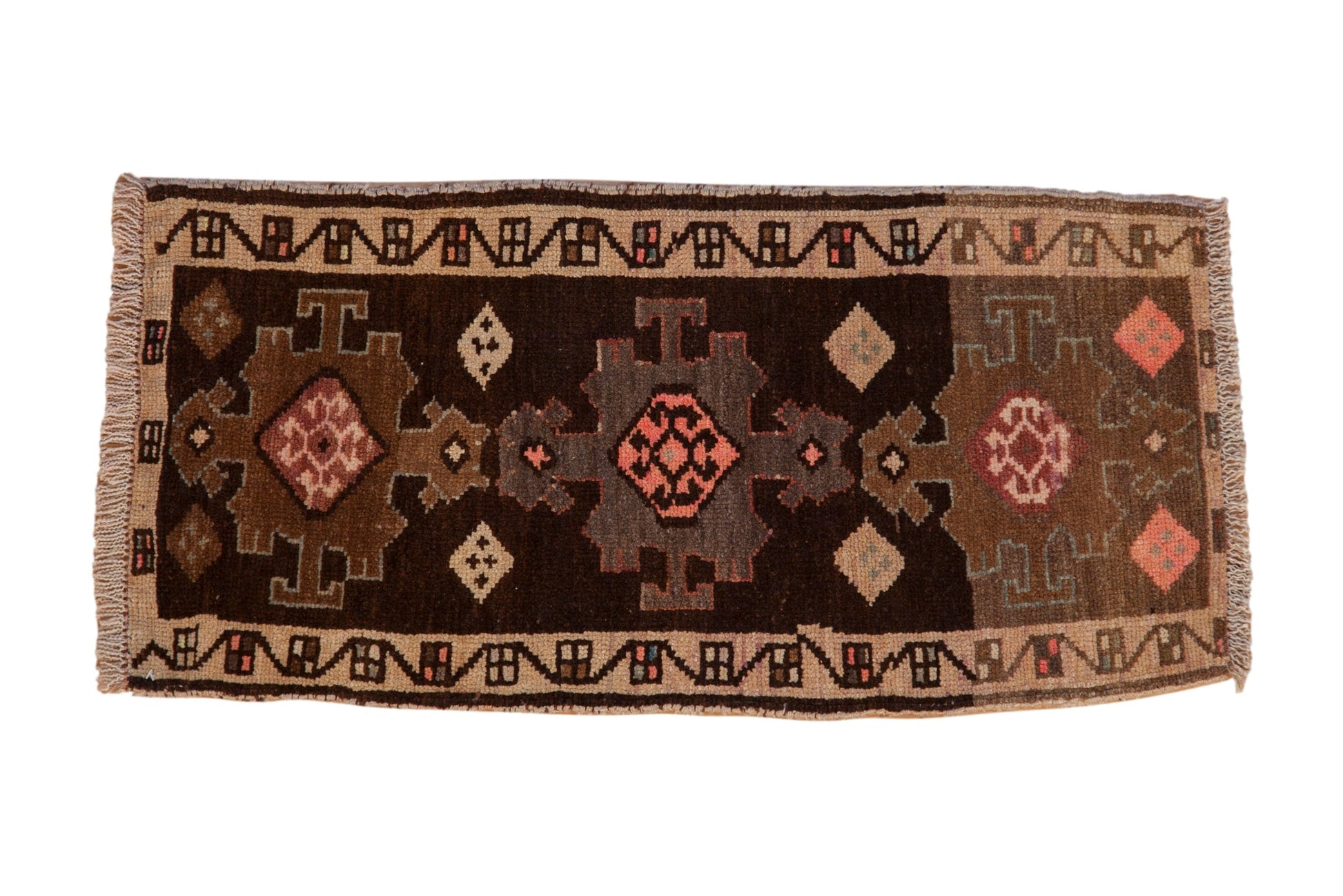 :: Triple center medallion with side minor border meandering vine with geometric blossoms. Abrashes throughout with great charm, character, and unique nuanced detailing! Colors and shades include: Dark chocolate brown, coffee brown, bronze, oxidized silver, pink, blush, sand, and more. Condition notes: Areas of pile and knot heads. Most of the original side cord selvages are intact or restored. Fully secured sides and ends. Moderate reduction to both ends. Kindly note rugs of this type, age and size are not intended to be perfect - they are often woven in informal settings, on small wooden looms, which renders charming character and slightly irregular shape. For processing purposes, this and other rugs of the type may have painted numbers on the reverse side. Recently professionally cleaned ready for in-home use! Many years of enjoyment to come with this hand knotted Turkish Kars rug mat made in Turkey circa 1970's vintage. Size measures 1'7" x 3'2".