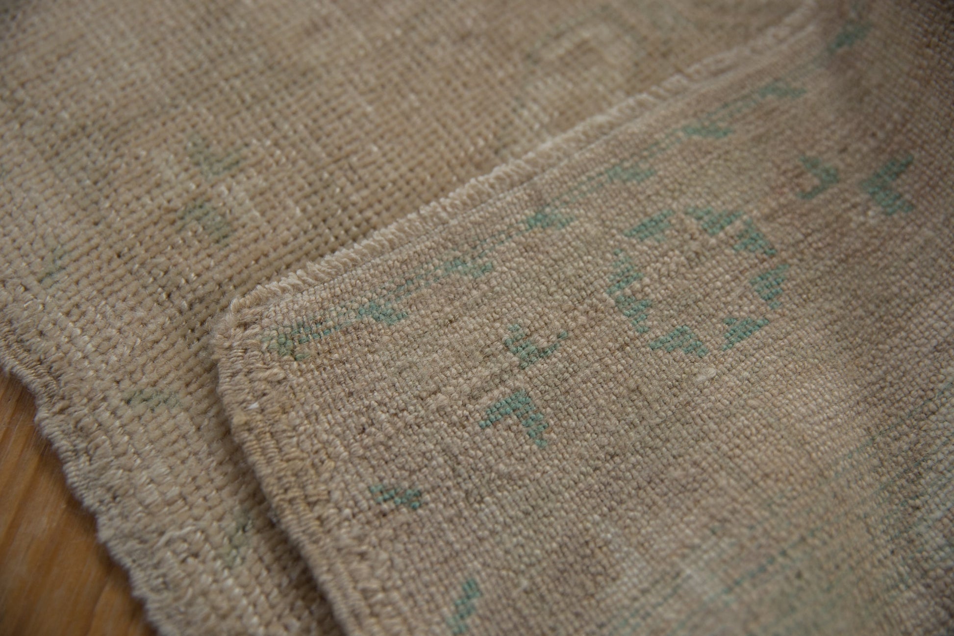 :: Triple floral gul center medallion each within paneled cartouches surrounded by starburst pinwheel floral design elements reminiscent of pomegranates. Colors and shades include: Antique ivory, beige, faded seafoam green, oxidized silver, pale teal, and more. Condition notes: Even wear across to knot heads. Original side cord selvages intact. Fully secured sides and ends. For processing purposes, this and other rugs of the type may have painted numbers on the reverse side. Recently professionally cleaned ready for in-home use! Many years of enjoyment to come with this hand knotted Turkish Oushak rug mat made in Turkey circa 1980's vintage. Size measures 1'8" x 3'.