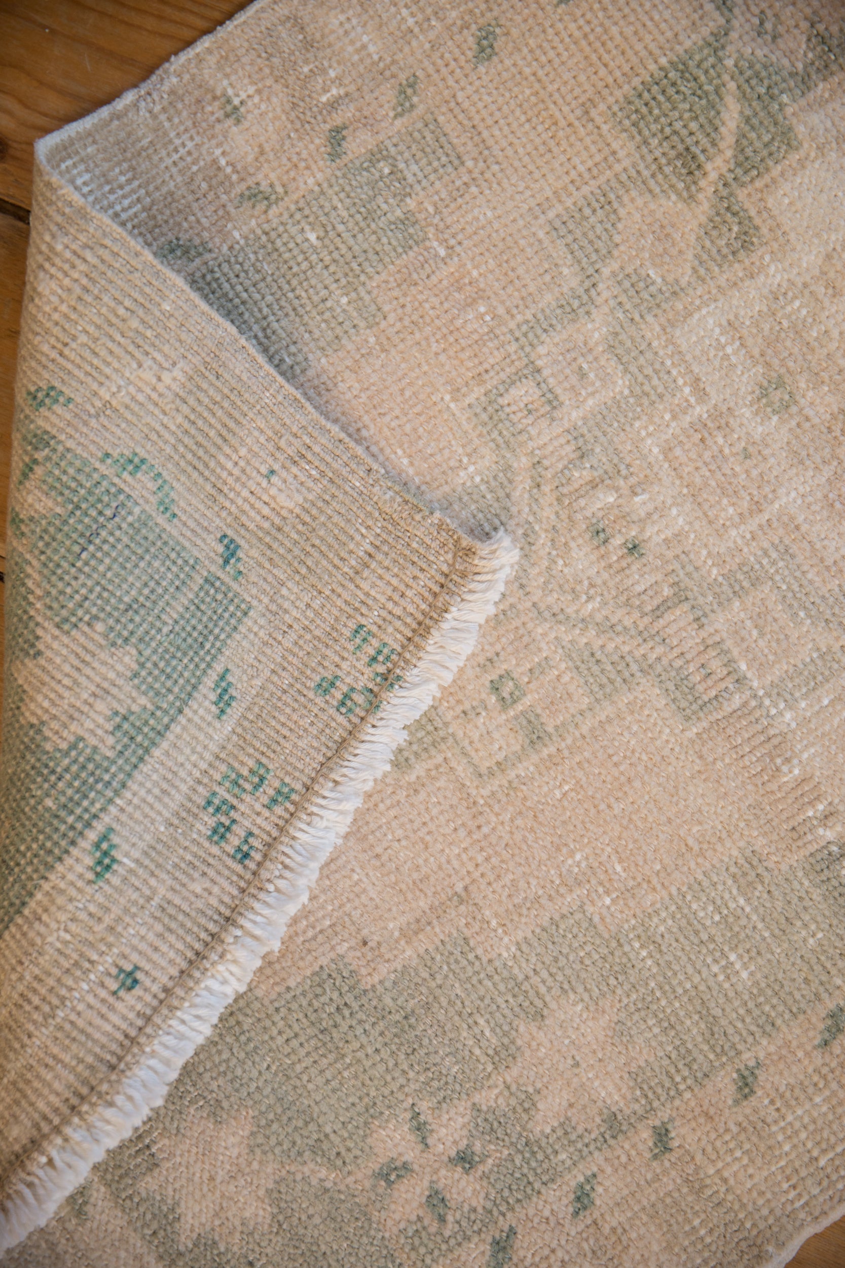 :: Concentric stepped center medallions with interior blossom design motif interconnected with vinery. Corner spandrel overlays reciprocate the contour of the main medallion with starburst pinwheel floral blossoms. Colors and shades include: Cream, dusty pale seafoam green, beige, sand and more. Condition notes: Even wear across to knot heads. Original side cord selvages intact. Fully secured sides and ends. For processing purposes, this and other rugs of the type may have painted numbers on the reverse side. Recently professionally cleaned ready for in-home use! Many years of enjoyment to come with this hand knotted Turkish Oushak rug mat runner made in Turkey circa 1980's vintage. Size measures 1'9" x 3'11".