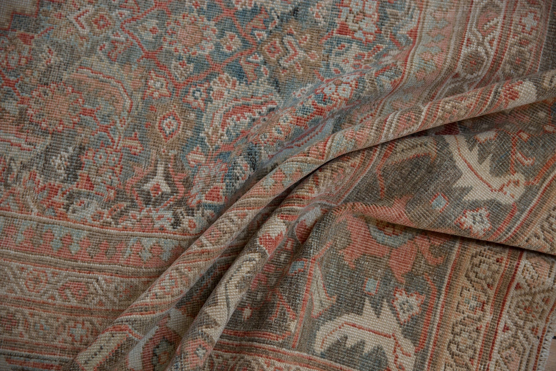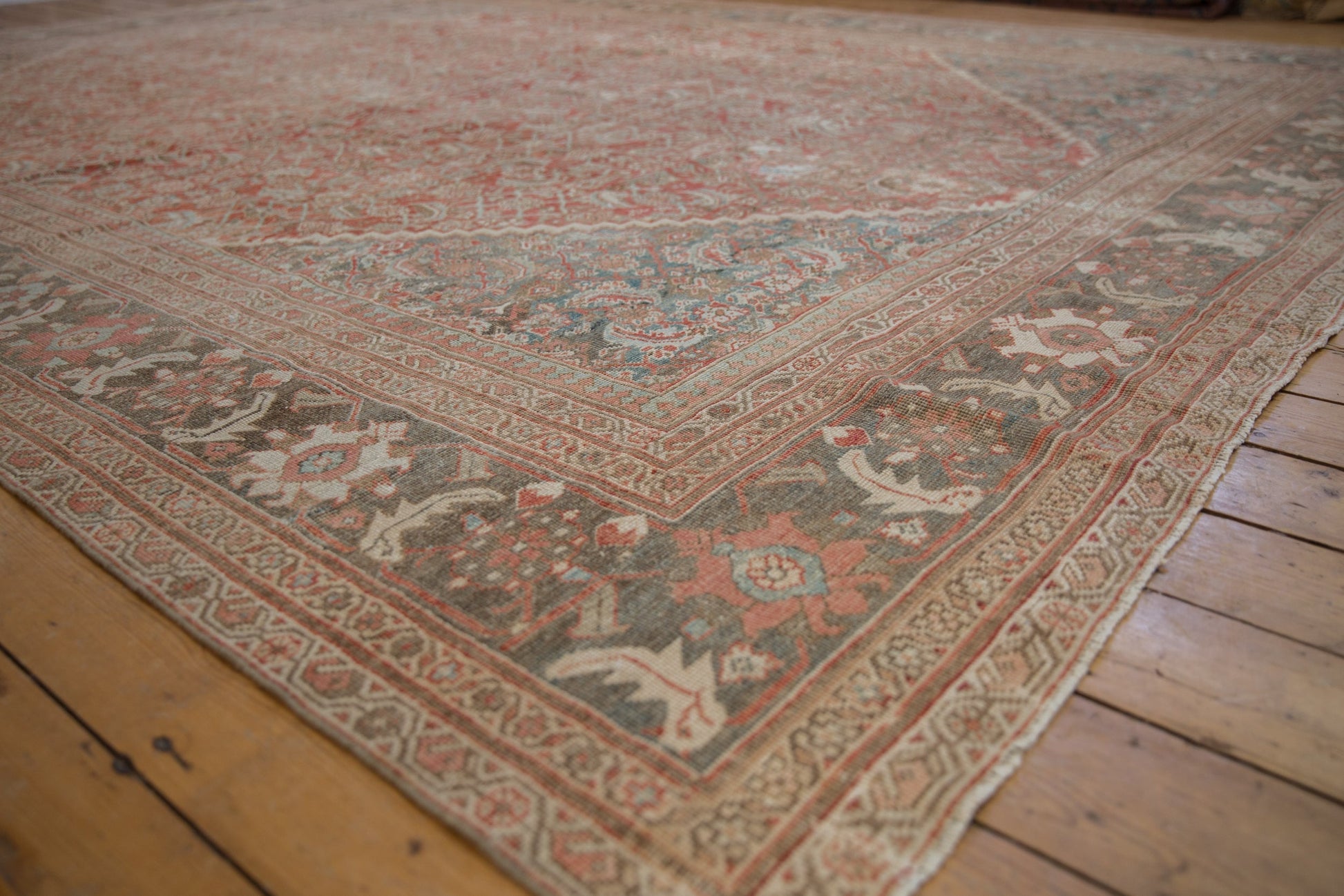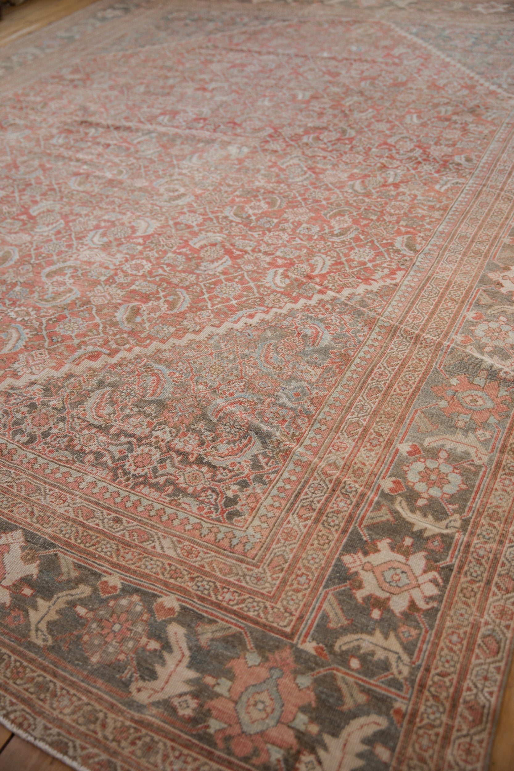 :: Allover covered field in a mahi-mahi Herati design motif with clear detailing in the scrolled fish wrapped by stepped corner spandrels in inverted coloration. Inner minor border in a reciprocating pawn design motif and main border in a palmette meandering vine and pomegranate top view. Colors and shades include: Dusty brick red, deep terracotta, slate blue, oxidized silver, dusty teal, sky blue, powder blue, beige, sand, silver, and more. Condition notes: Mostly even wear across to knot heads with hard isolated areas of foundation showing through. Most of the original side cord selvages are intact or restored. Fully secured sides and ends. Localized areas of professional restoration in the spirit of the distressed process. Recently professionally cleaned ready for in-home use! Many years of enjoyment to come with this hand knotted Persian Mahal carpet made in Persia circa 1920's vintage. Size measures 10'5" x 12'11".