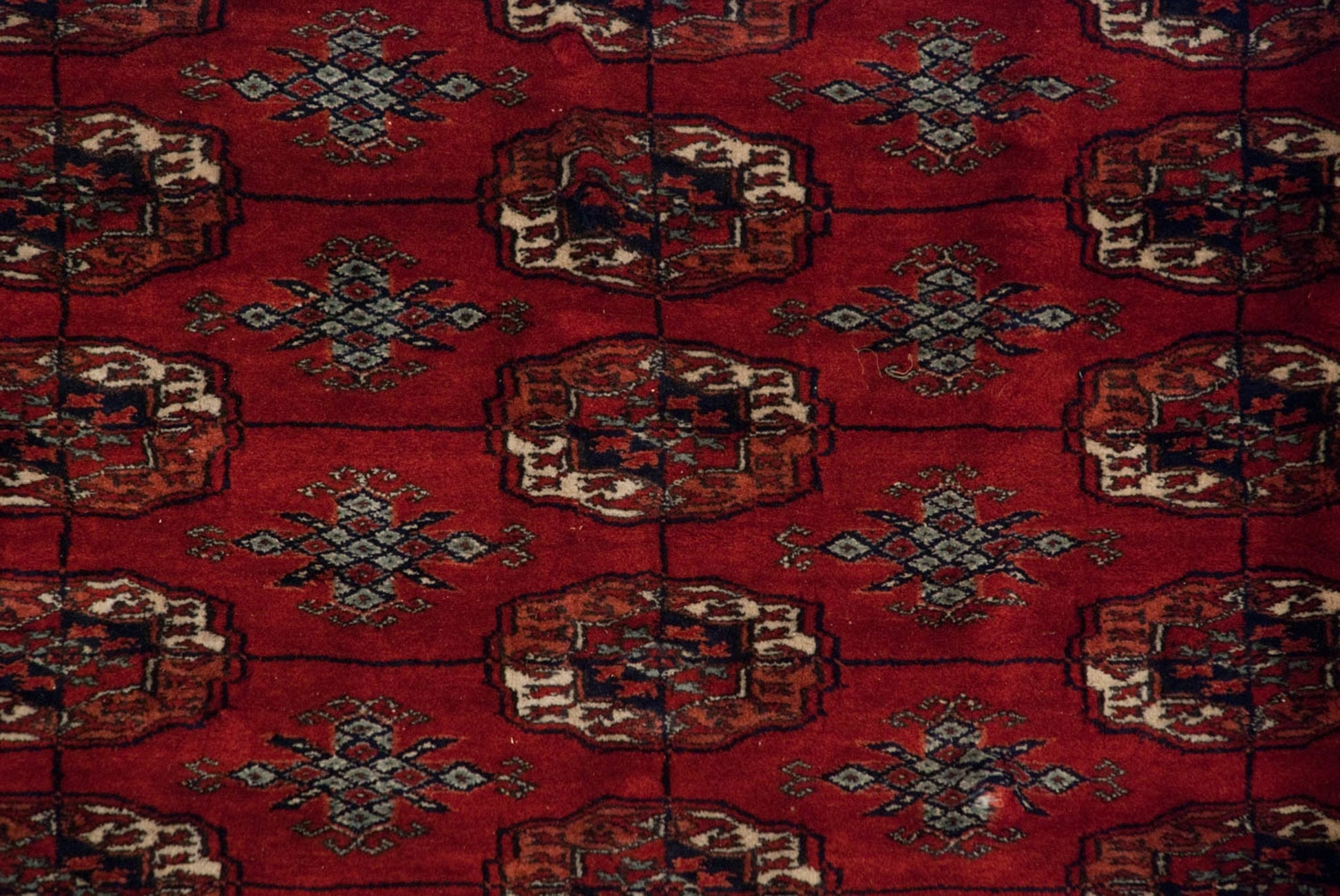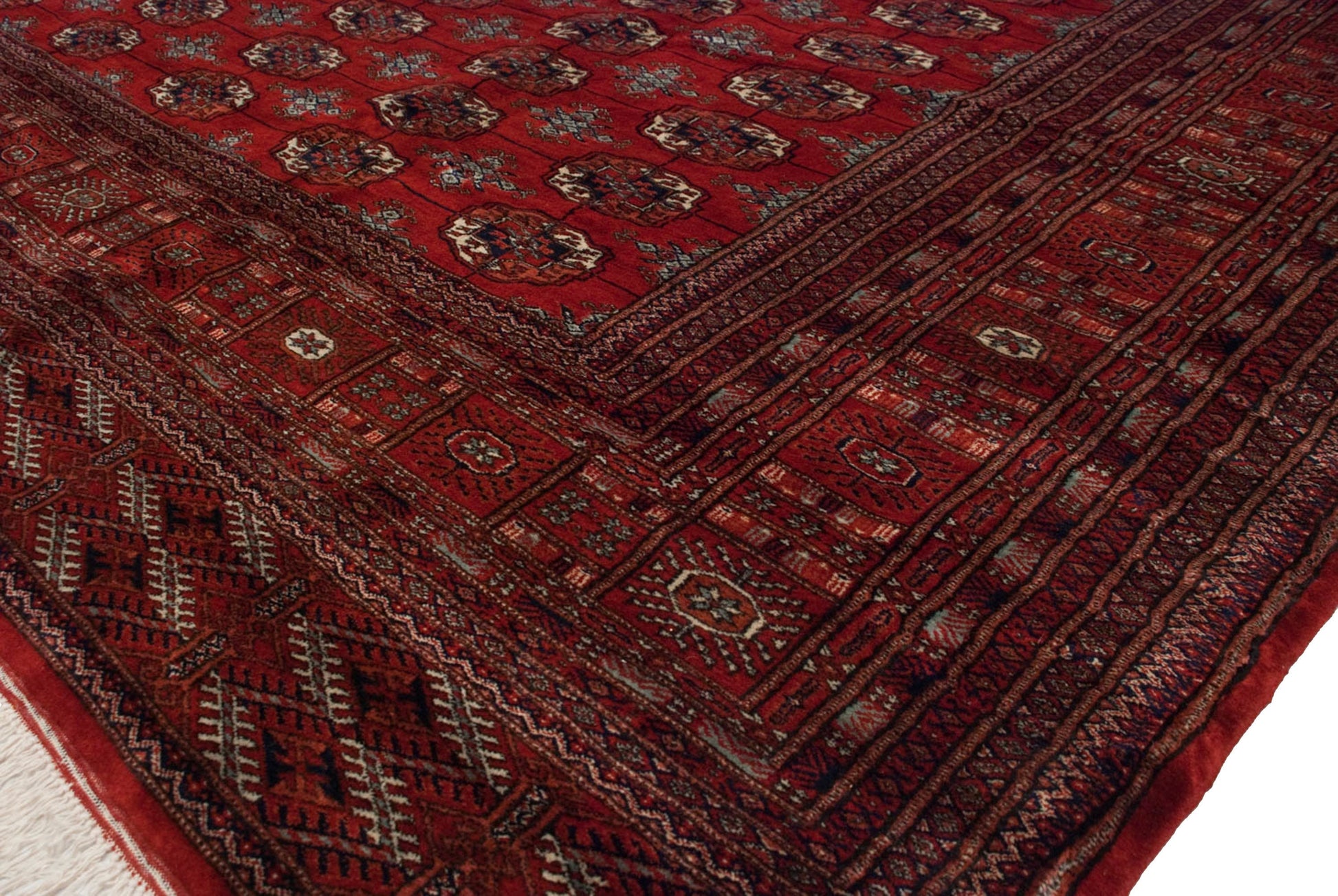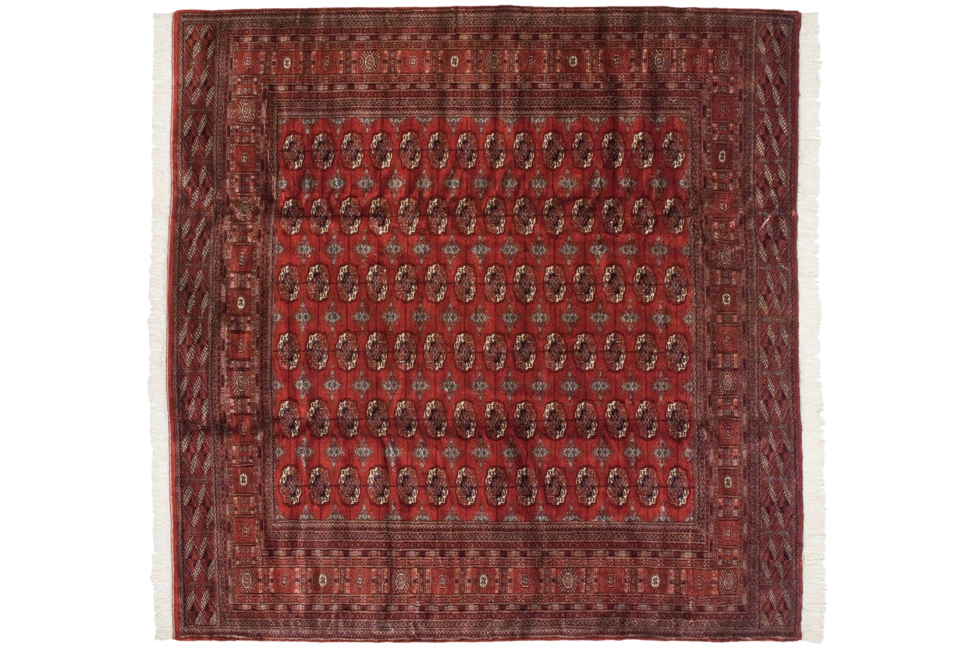 :: Extremely detailed repeating multi-column and row gul medallions in a tight and fine weave. Amazing splendor in the design execution, known as the 'Bokhara' motif or 'elephant footprint' design (actually geometric floral designs) in the spirit yesteryear Tekke carpets. Plush, soft, silk-like pile. Superb quality, long-stapled wool with high sheen and luster adding to great dynamic and contrast from light and dark sides. Colors and shades include: Cherry red, navy blue, ivory, silver, seafoam green and more. Condition notes: Like-new, original full pile height even across. Original side cord selvages intact. Fully secured sides and ends. This rug may be wider than it is long, and sizes may have been inverted from our normal convention to ensure presence in our size range search filter. Recently professionally cleaned ready for in-home use! Many years of enjoyment to come with this hand knotted Pakistani Bokhara square carpet made in Pakistan circa 1980's vintage. Size measures 10'3" x 10'.