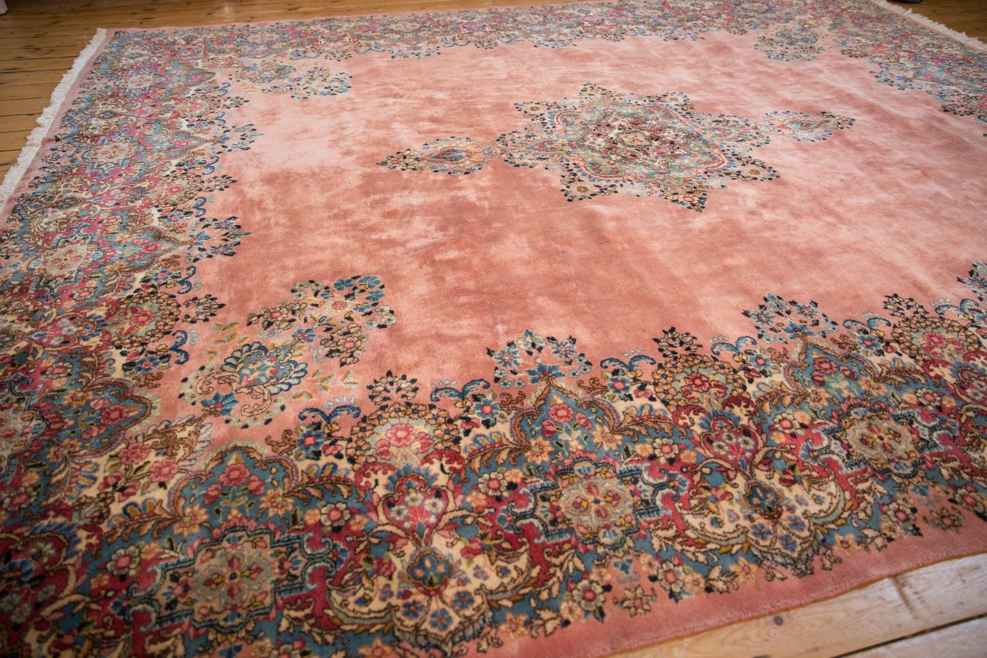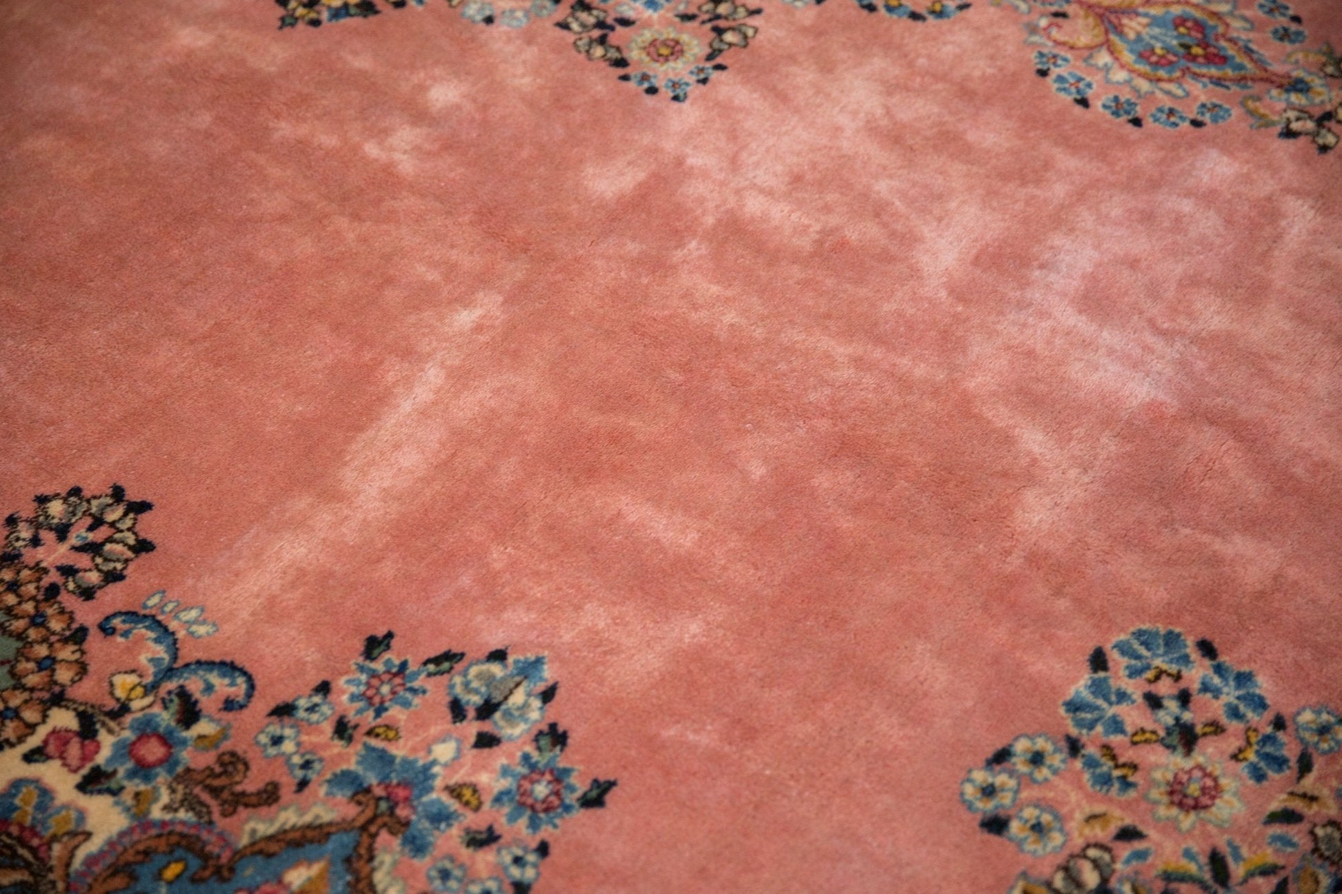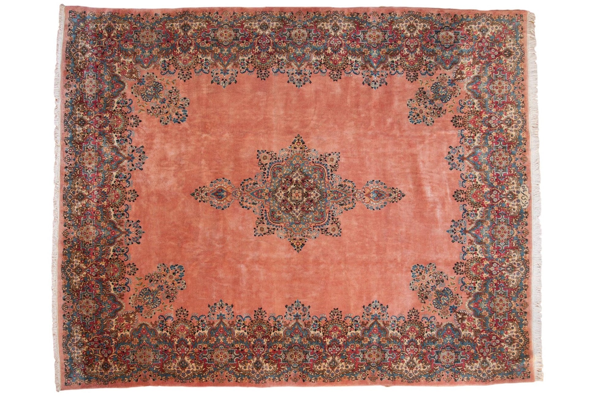 :: Quatrefoil drawn central medallion inner fill with dramatic trefoil finials wrapped by a densely ornamented floral bouquet and end finials atop a sprawling, open, main field. Corner fills and floating main border in similarly intricate millefleur thousand flower design motif bearing amazing detail and color range. Weaver signature top and center. Colors and shades include: Dusty rose, ivory, sapphire blue, cochineal red, beige, gold, sand, sky blue, pale seafoam, blush, wine red, coffee brown, and more. Condition notes: Like-new, original full pile height even across. Original side cord selvages intact. Fully secured sides and ends. Recently professionally cleaned ready for in-home use! Many years of enjoyment to come with this hand knotted Persian Kerman carpet made in Persia circa 1950's vintage. Size measures 9'10" x 12'1".