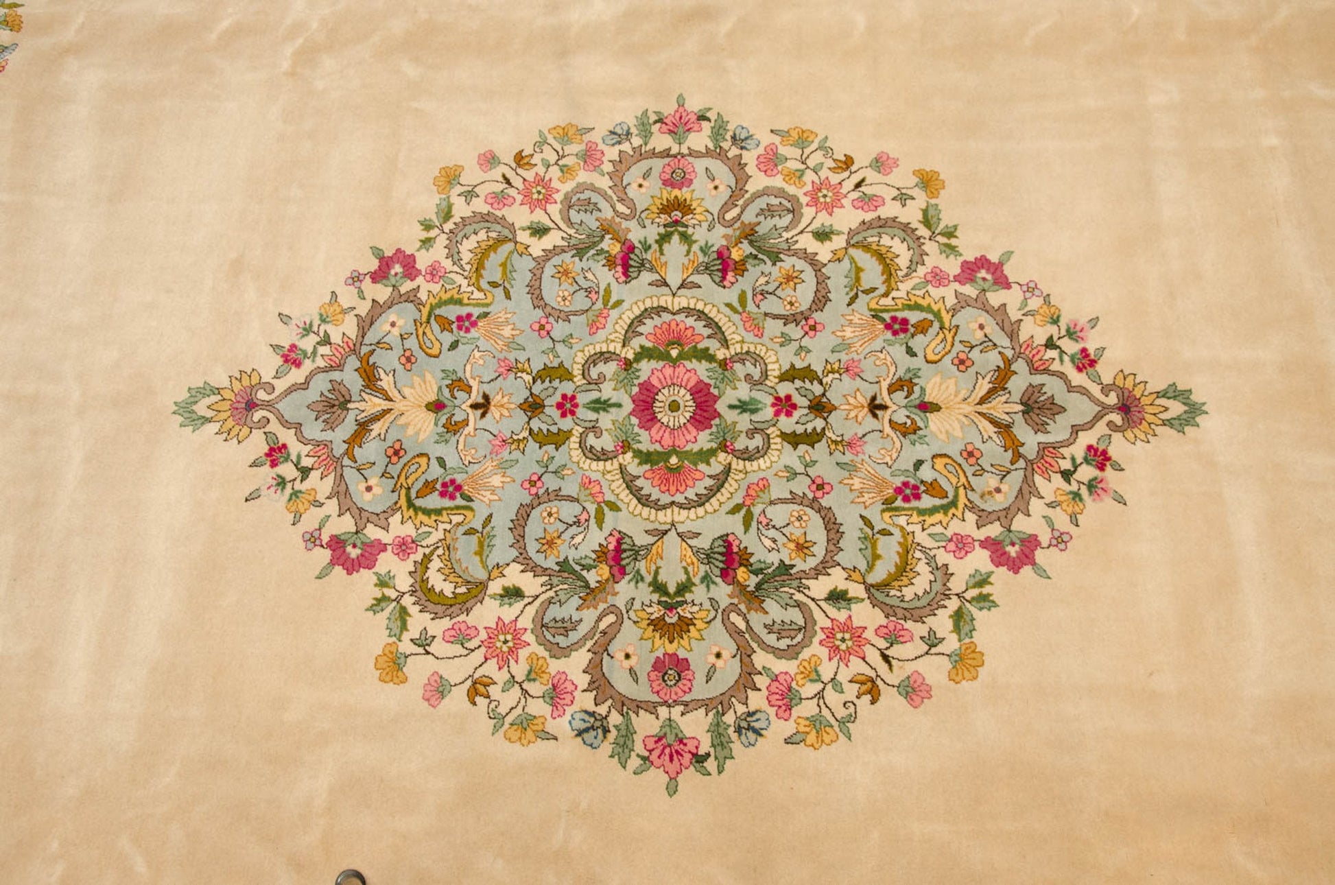 :: Center medallion with ornate densely ornamented enveloped floral buds and blossoms atop an open field with corner spandrel floral sprays inwardly reconciled. Wrapped by a floating inner field overlay in Rococo stylized ribboned and scrolling leaves. Exceptional quality wool in a tight weave and unique type and variety. Colors and shades include: Ivory, powder blue, saffron yellow, beige, sand, gold, cochineal red, pink, pale coffee brown, and more. Condition notes: Like-new, original full pile height even across. Original side cord selvages intact. Fully secured sides and ends. Recently professionally cleaned ready for in-home use! Many years of enjoyment to come with this hand knotted Bulgarian Kerman design carpet made in Bulgaria circa 1950's vintage. Size measures 10' x 13'1".