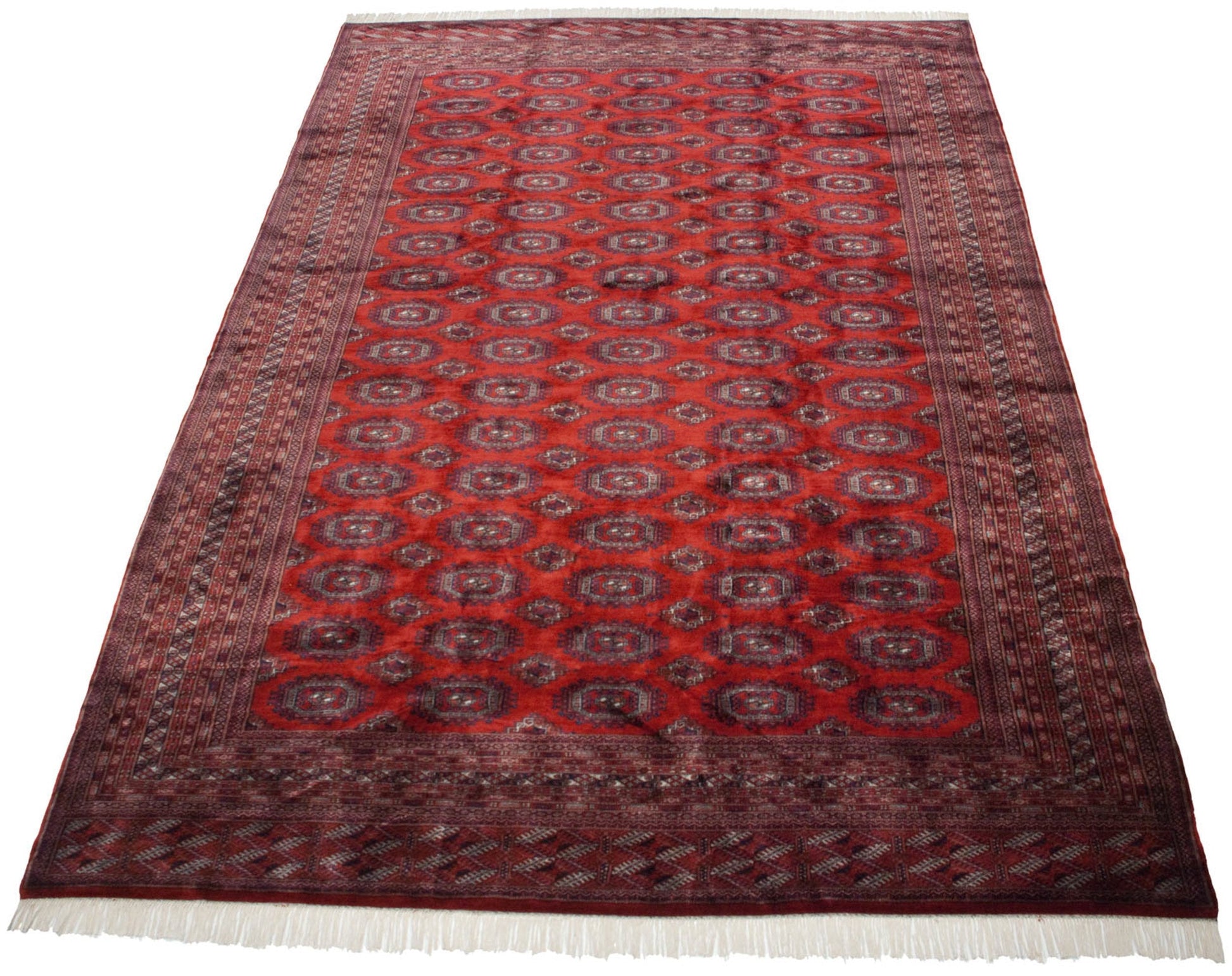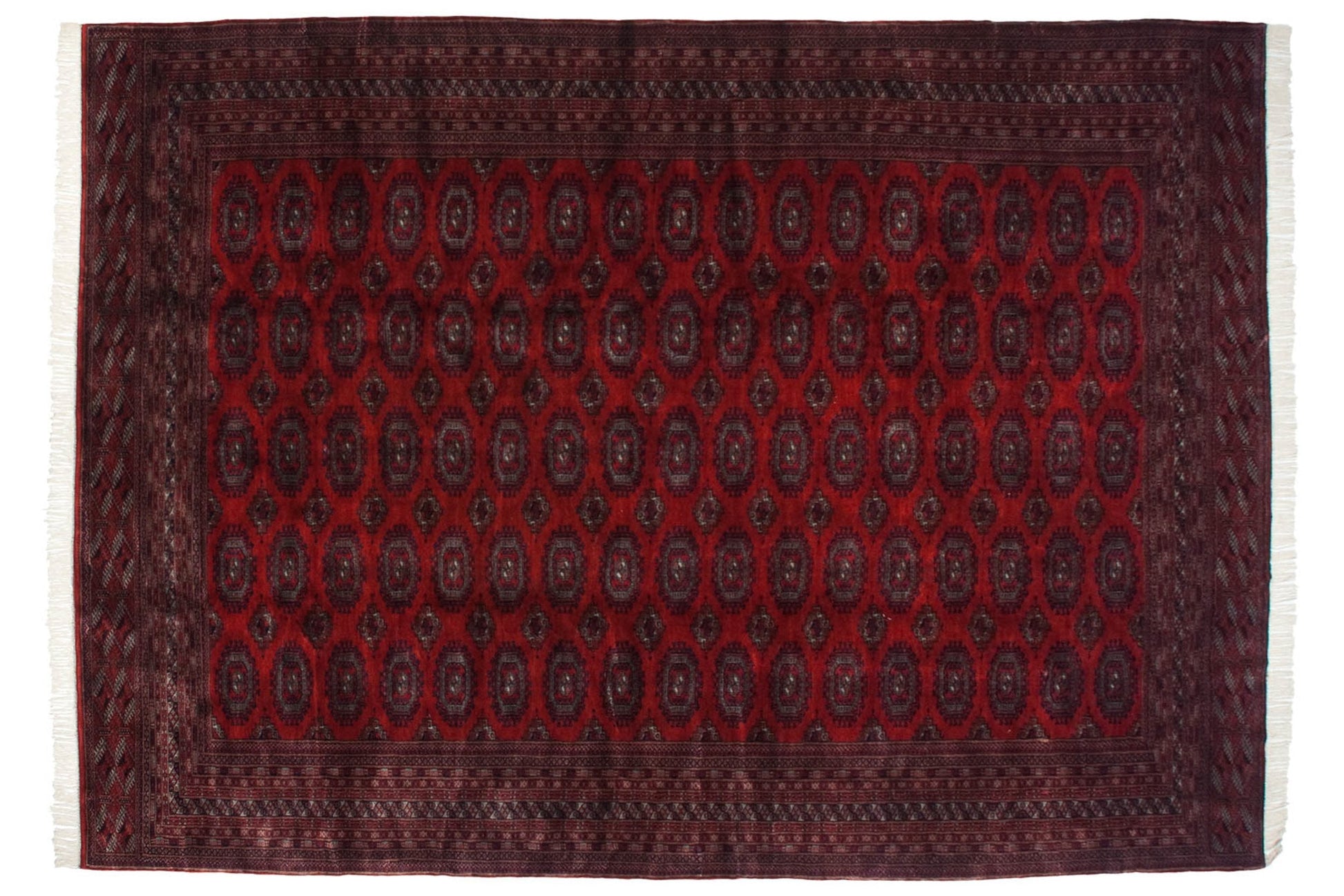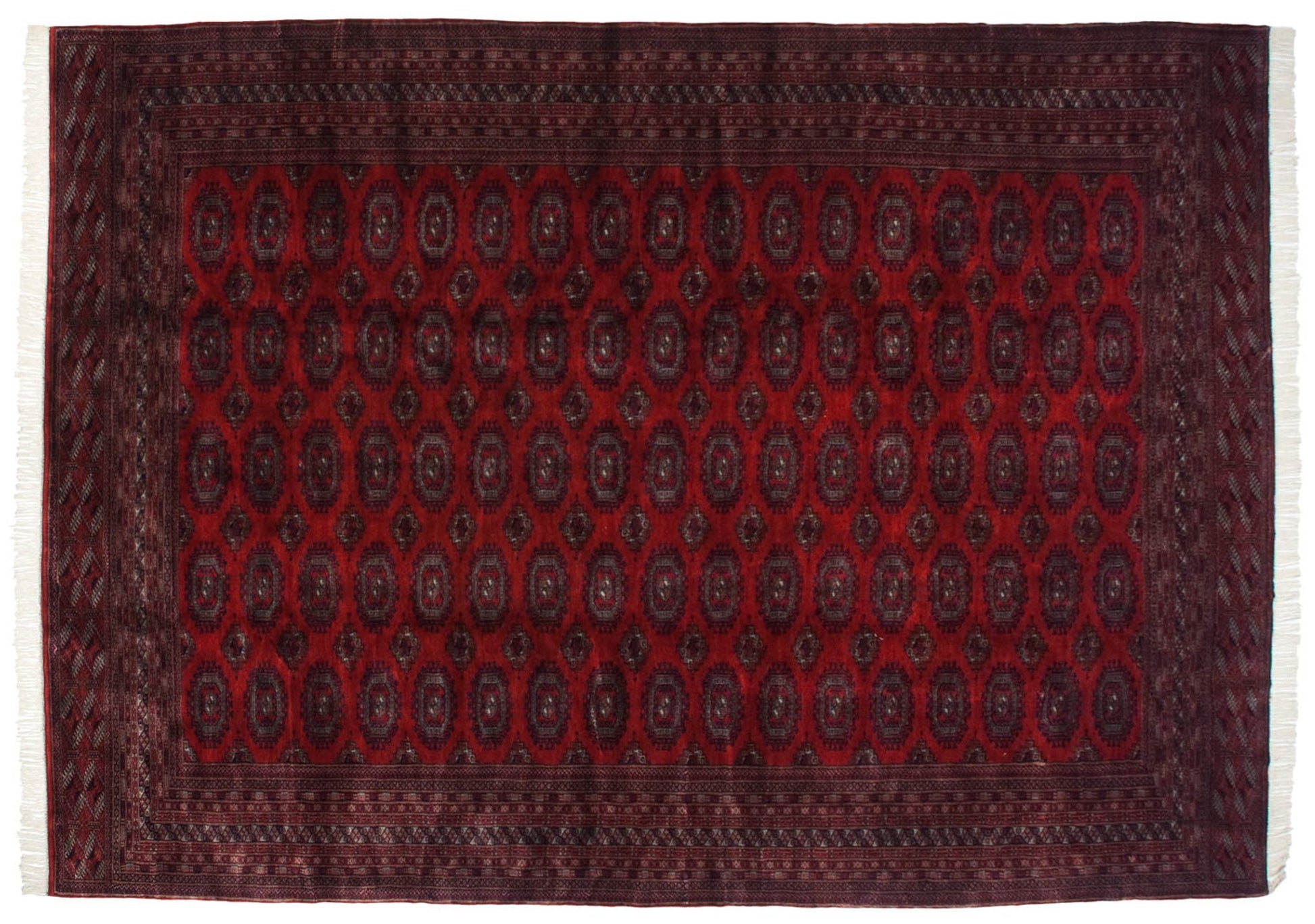:: Repeating columns and rows of floral guls in detailed geometric relief, buffered by minor medallions reciprocating the contour of the main guls. Wrapped by multiple minor borders in exquisite detail, rhythm, and implied movement throughout. Colors and shades include: Cherry red, navy blue, silver platinum blue, and more. Condition notes: Like-new, original full pile height even across. Original side cord selvages intact. Fully secured sides and ends. Recently professionally cleaned ready for in-home use! Many years of enjoyment to come with this hand knotted Pakistani Turkmen design carpet made in Pakistan circa 1980's vintage. Size measures 10'2" x 14'5".