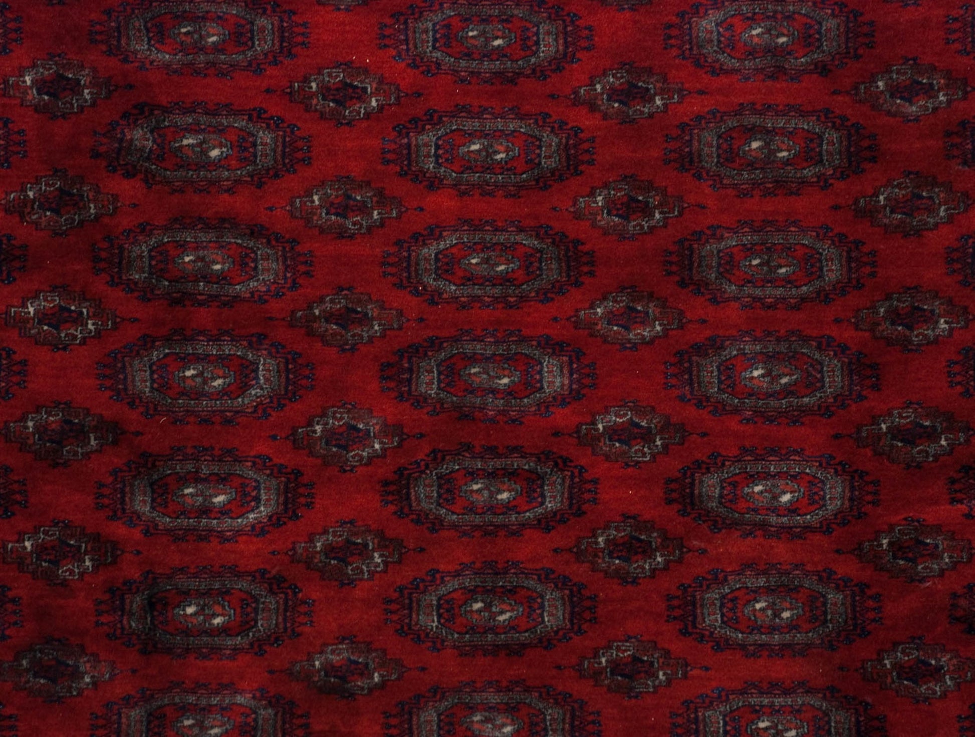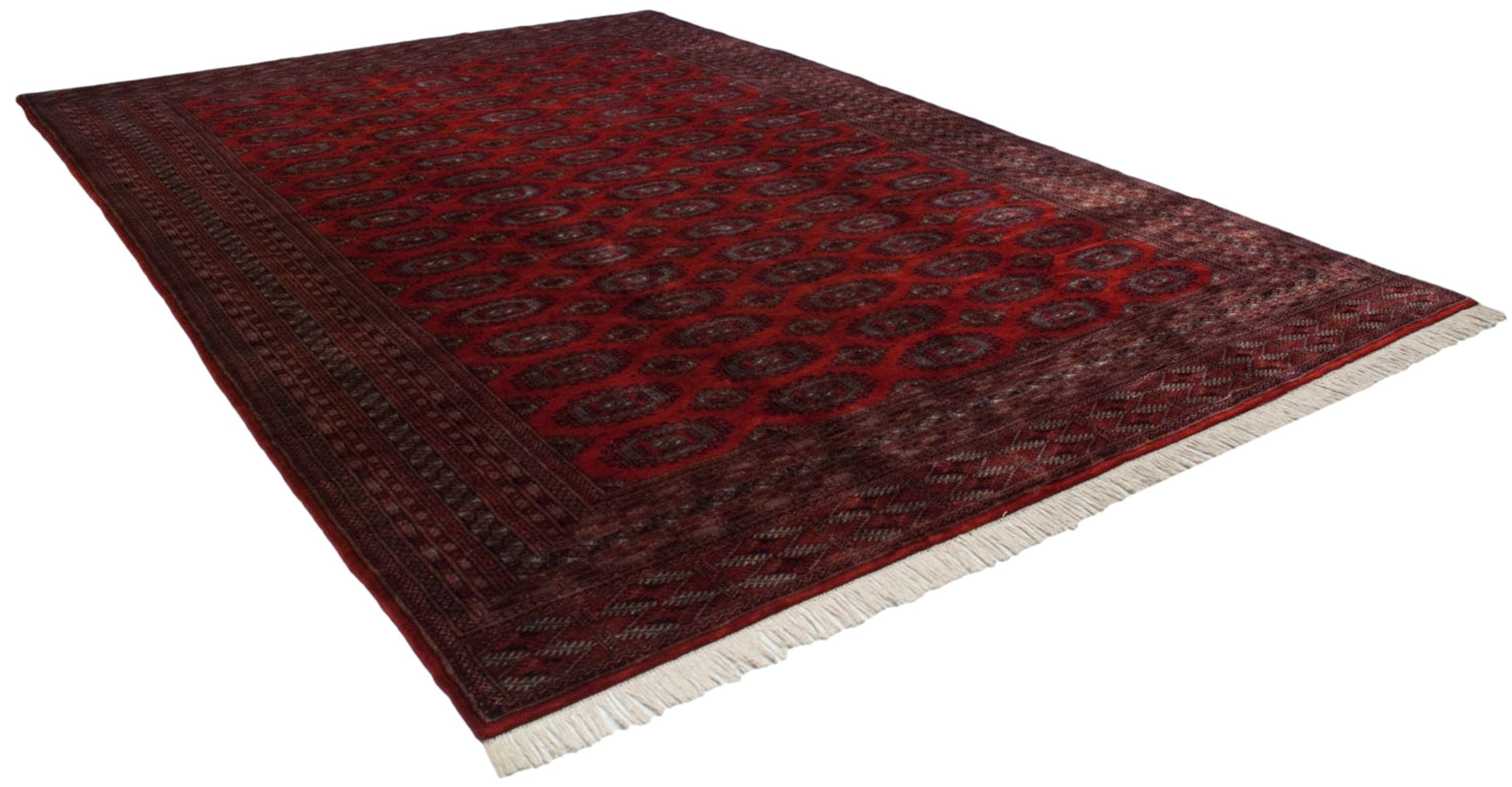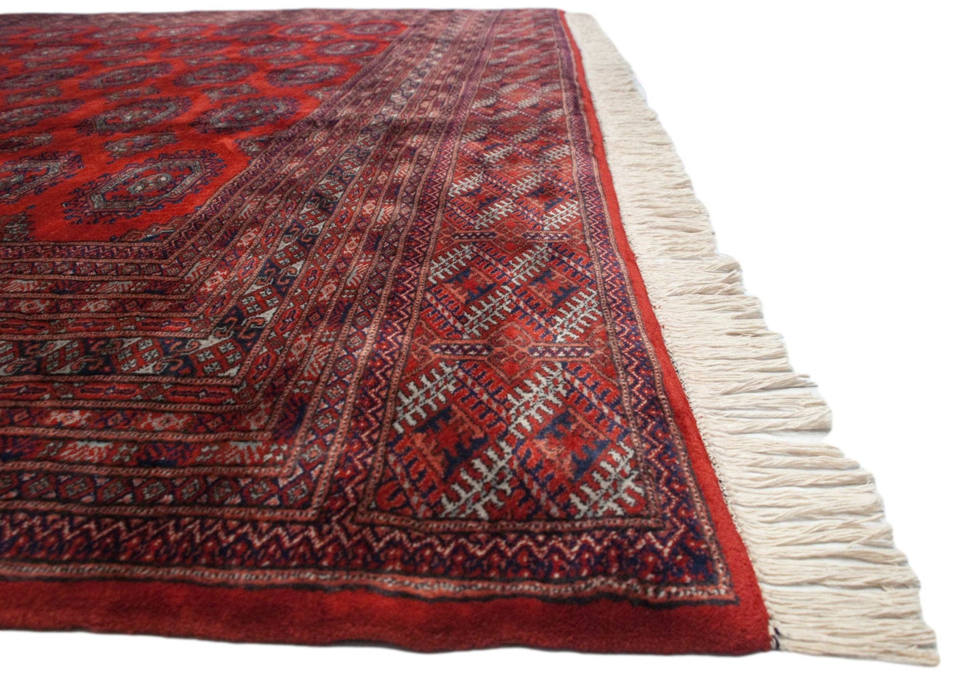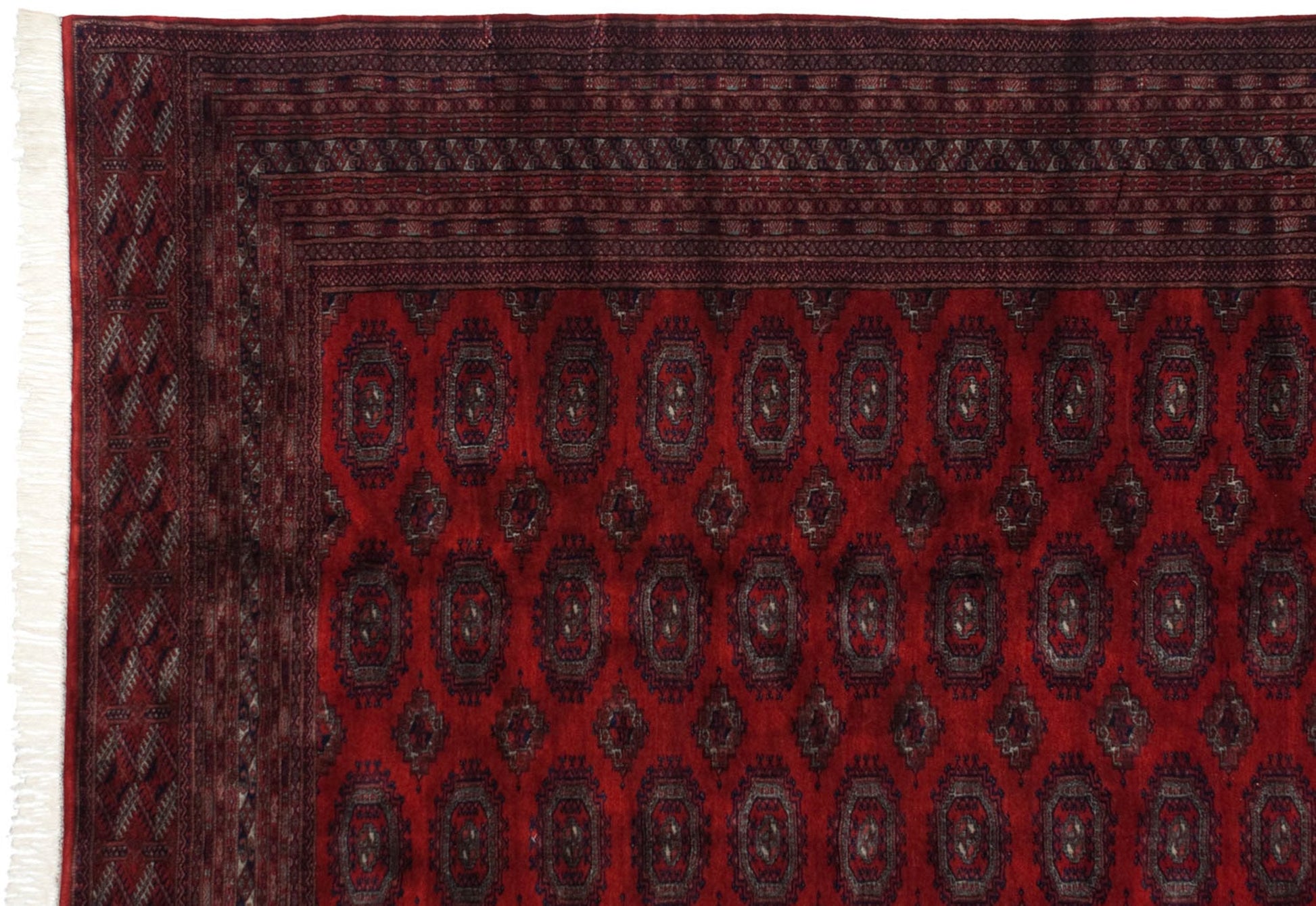 :: Repeating columns and rows of floral guls in detailed geometric relief, buffered by minor medallions reciprocating the contour of the main guls. Wrapped by multiple minor borders in exquisite detail, rhythm, and implied movement throughout. Colors and shades include: Cherry red, navy blue, silver platinum blue, and more. Condition notes: Like-new, original full pile height even across. Original side cord selvages intact. Fully secured sides and ends. Recently professionally cleaned ready for in-home use! Many years of enjoyment to come with this hand knotted Pakistani Turkmen design carpet made in Pakistan circa 1980's vintage. Size measures 10'2" x 14'5".