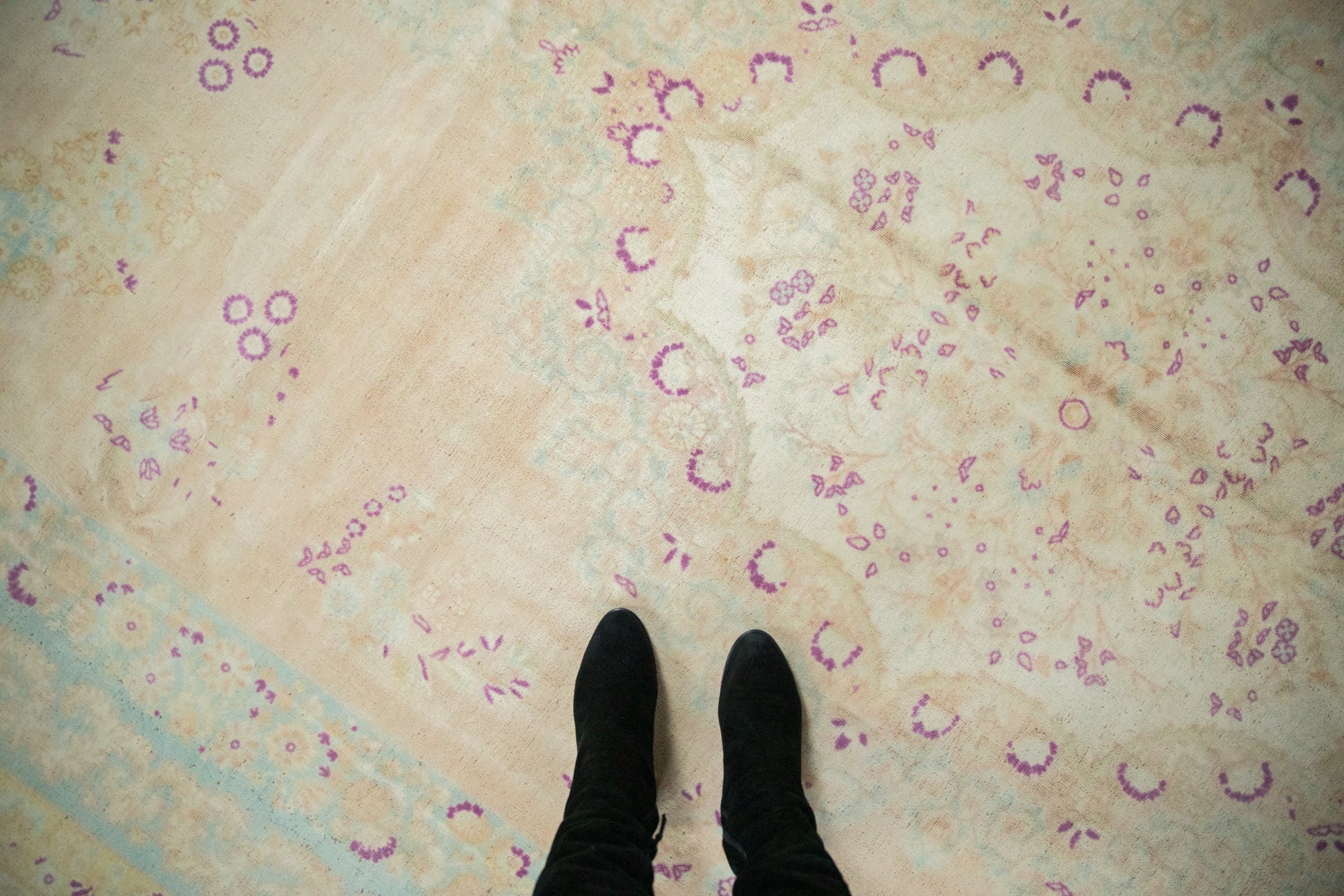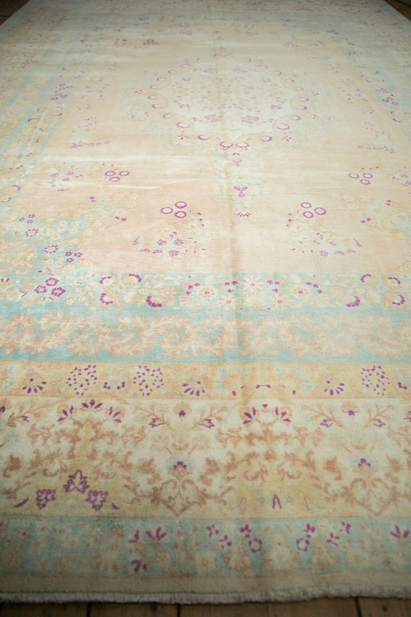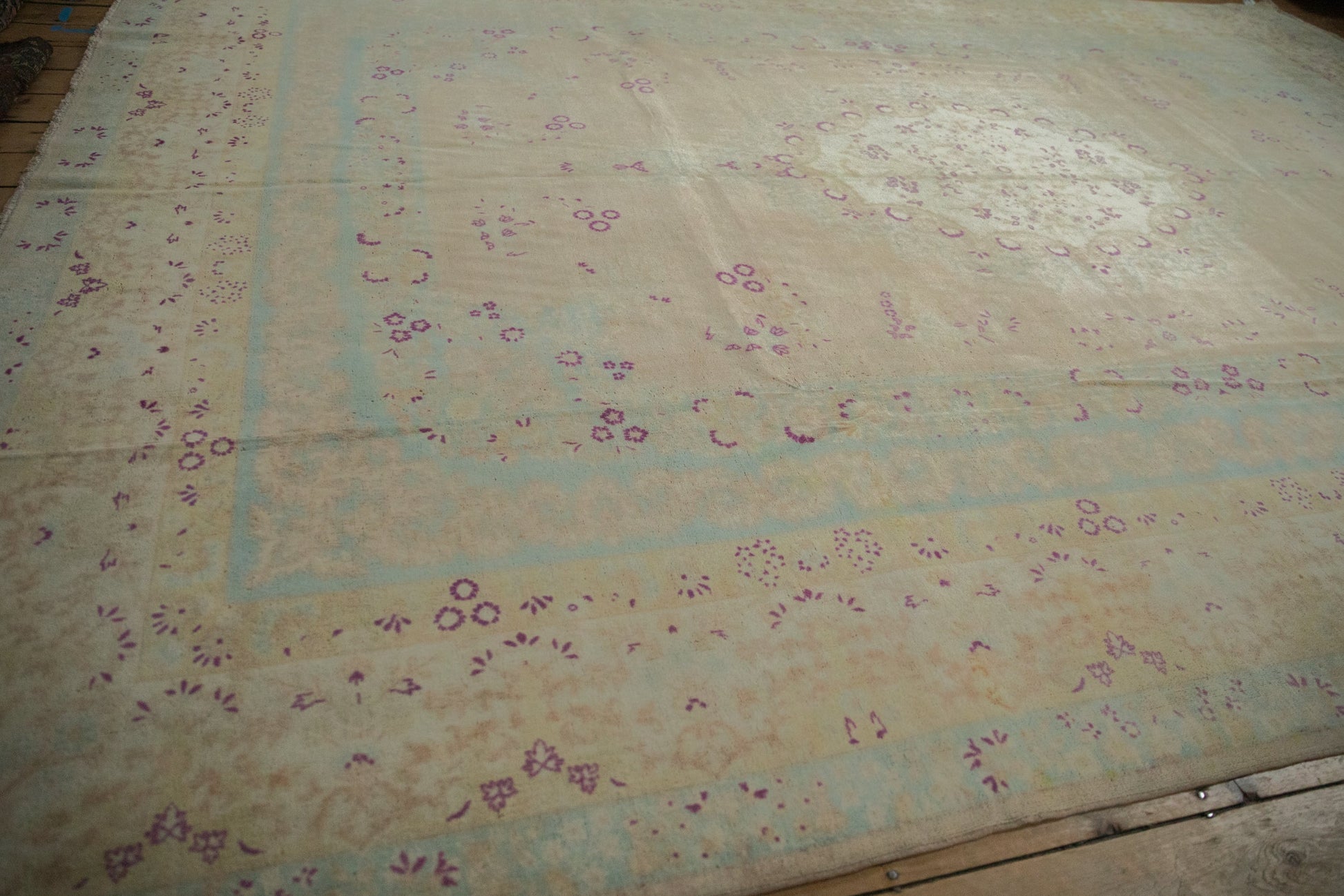 :: Sharp scalloped center medallion with interior millefleur "thousand flower" design motif wrapped by Rococo stylized shadow medallion with trefoil end finials atop a predominantly open field and scattered floral sprays. Dragon inspired reciprocating direction blossom main border and European influenced field overlay scrolling vinery. Colors and shades include: Ivory, cream, powder blue, deep magenta, and more. Condition notes: Even wear across to knot heads with faint foundation showing through. Most of the original side cord selvages are intact or restored. Fully secured sides and ends. Some areas of speckled low pile and adjacent knot heads scattered throughout. Recently professionally cleaned ready for in-home use! Many years of enjoyment to come with this hand knotted Bulgarian Kerman design carpet made in Bulgaria circa 1950's vintage. Size measures 9'10" x 13'11".