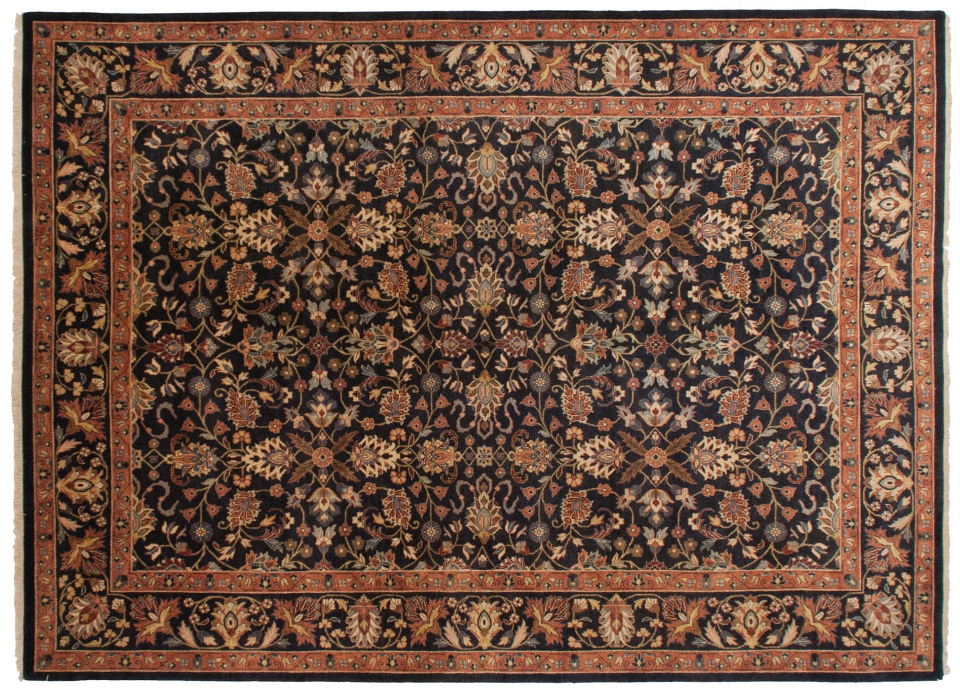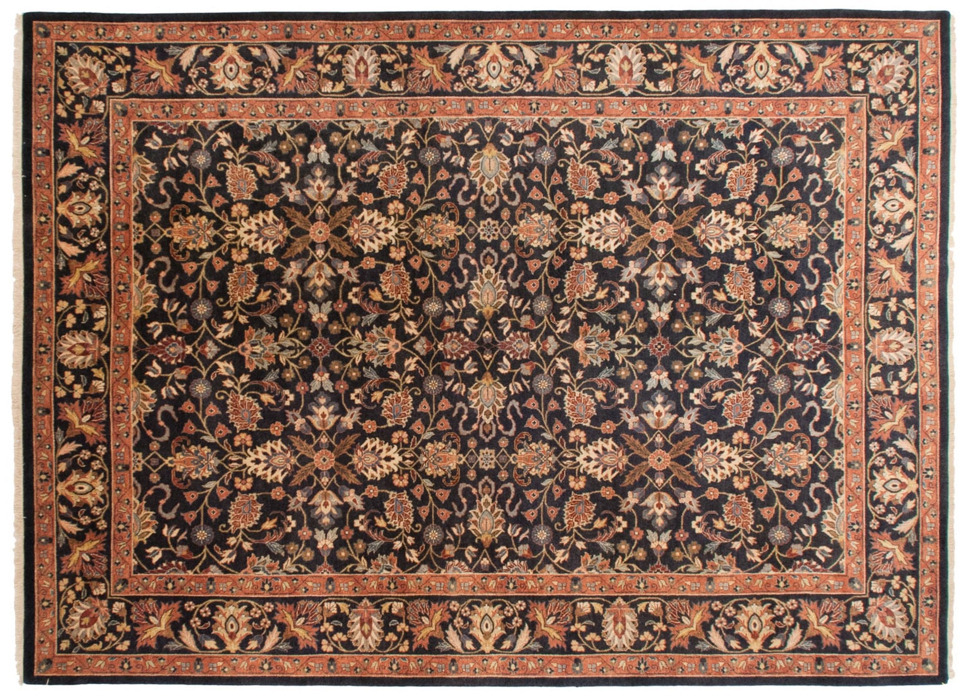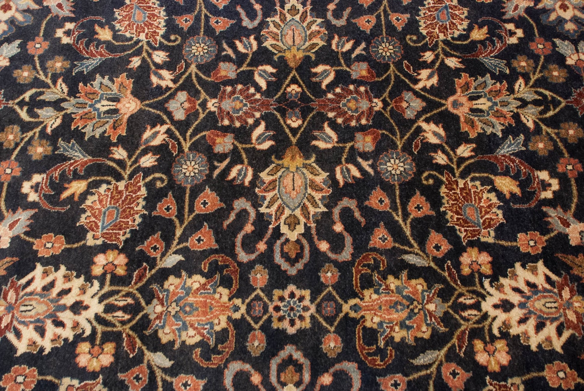 :: Allover covered field in splayed floral cross-sections and lotus and cloud band design elements, all interconnected by delicate scrolling vinery. Colors and shades include: Dusty navy blue, terracotta, copper, wine red, dusty powder blue, silver, sky blue, pale gold, and more. Condition notes: Like-new, original full pile height even across. Original side cord selvages intact. Fully secured sides and ends. Recently professionally cleaned ready for in-home use! Many years of enjoyment to come with this hand knotted Indian Yezd design carpet made in India circa 1990's vintage. Size measures 10'1" x 13'11".