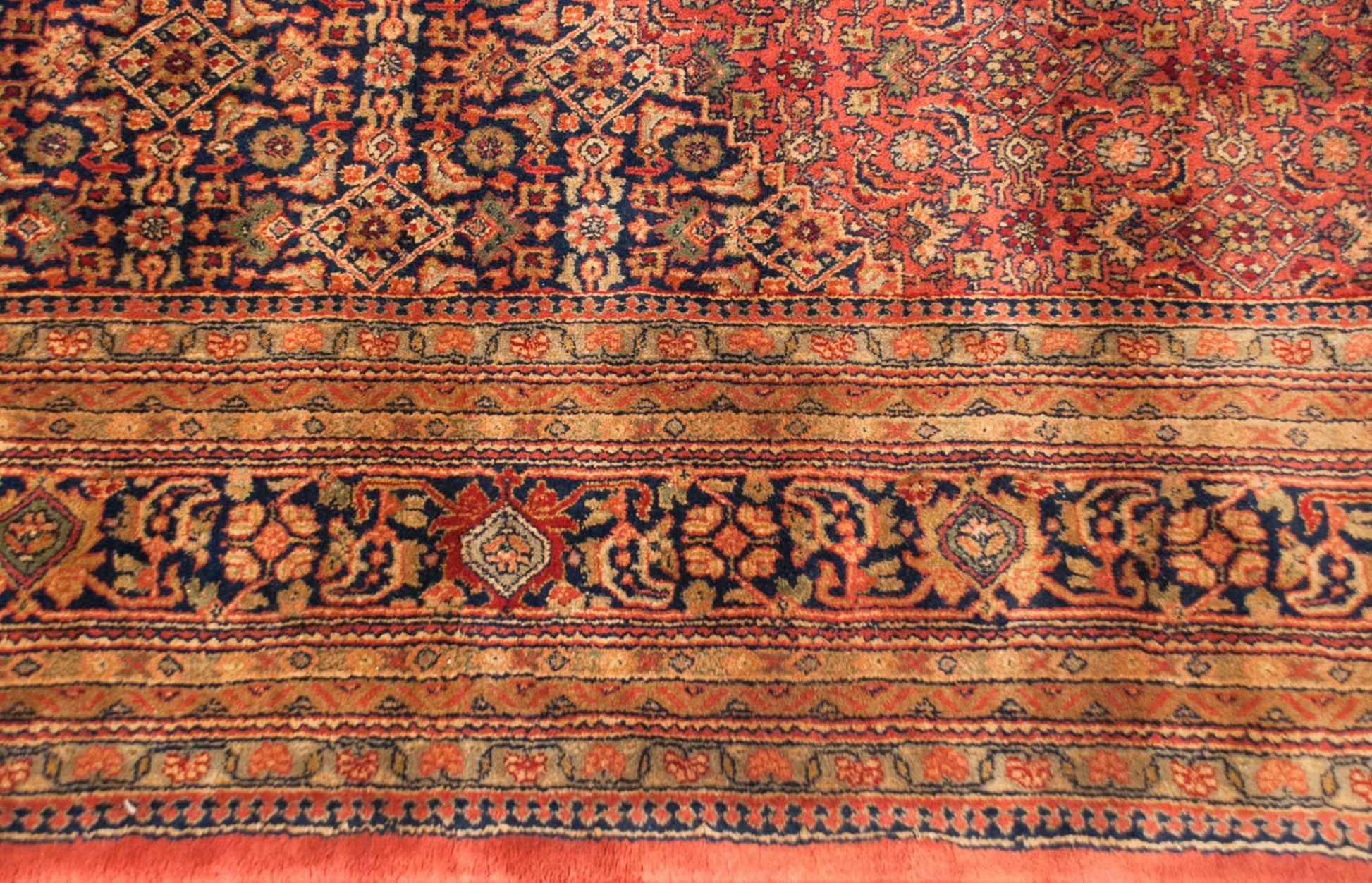 :: Diamond shaped center medallion atop a covered field in a Herati motif. Excellent balance between positive and neutral spacing. Thick plush pile and great detail with clarity in design. Colors and shades include: Dusty brick red, dusty raspberry, navy blue, gold, antique ivory, and more. Condition notes: Like-new, original full pile height even across. Original side cord selvages intact. Fully secured sides and ends. Some light buckling isolated to the one edge, as seen in photos, which may release through use and time, although we have priced this carpet reflecting the uncertainty of such. Recently professionally cleaned ready for in-home use! Many years of enjoyment to come with this hand knotted Indian Bijar design carpet made in India circa 1980's vintage. Size measures 9'11" x 13'11".