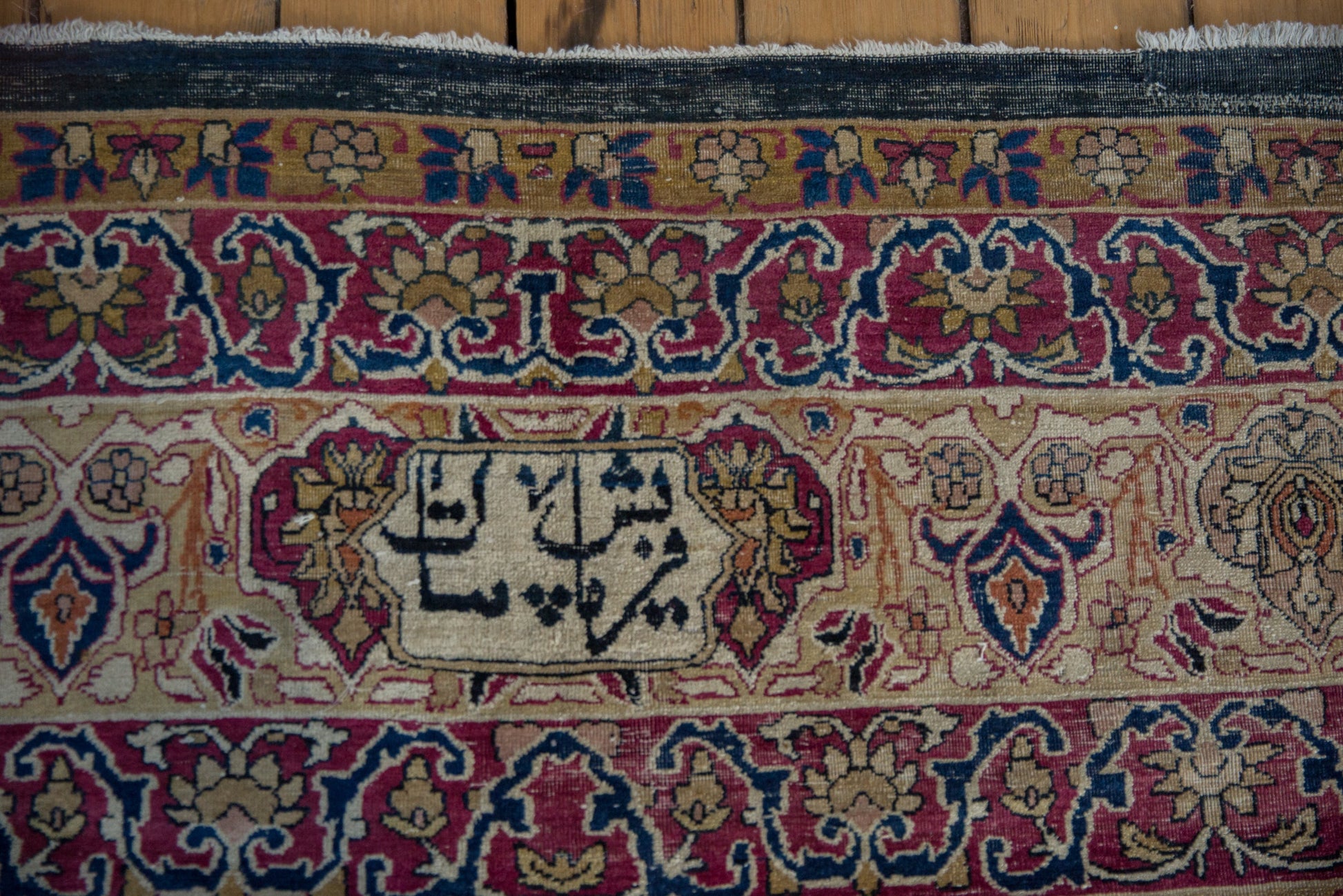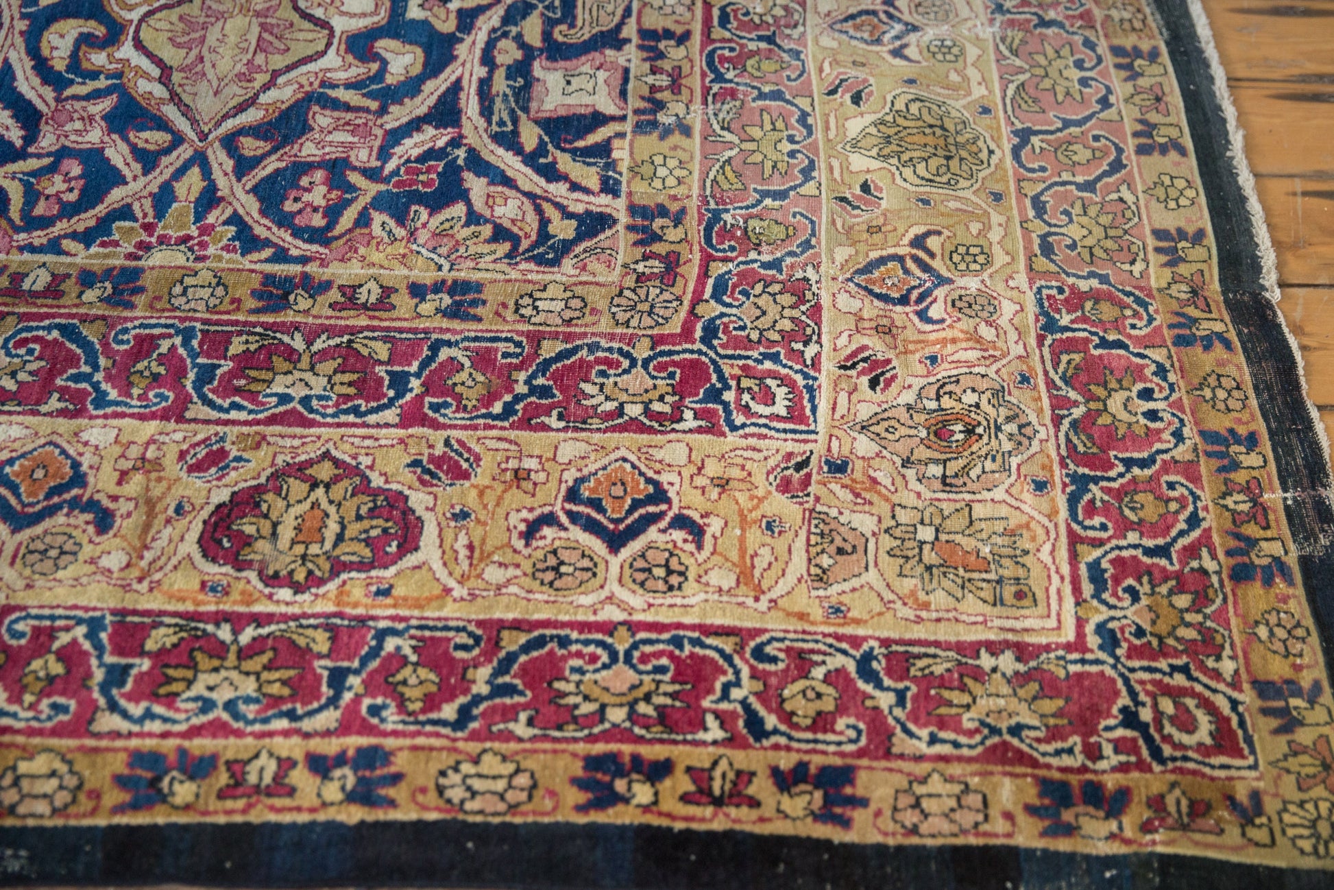 :: Allover covered field Kerman carpet in classic scrolling contour. Excellent balance between positive and neutral spacing. A small signature cartouche woven at the top of the carpet. Colors and shades include: Navy blue, antique ivory, sand, beige, cochineal red, pale dusty gold, and more. Condition notes: Mostly even wear across to knot heads and areas of light exposed foundation. Large areas of mending and reweave in varying degrees of expertise. Recently professionally cleaned ready for in-home use! Many years of enjoyment to come with this hand knotted Persian Kerman carpet made in Persia circa 1910's vintage. Size measures 10'1" x 14'11".