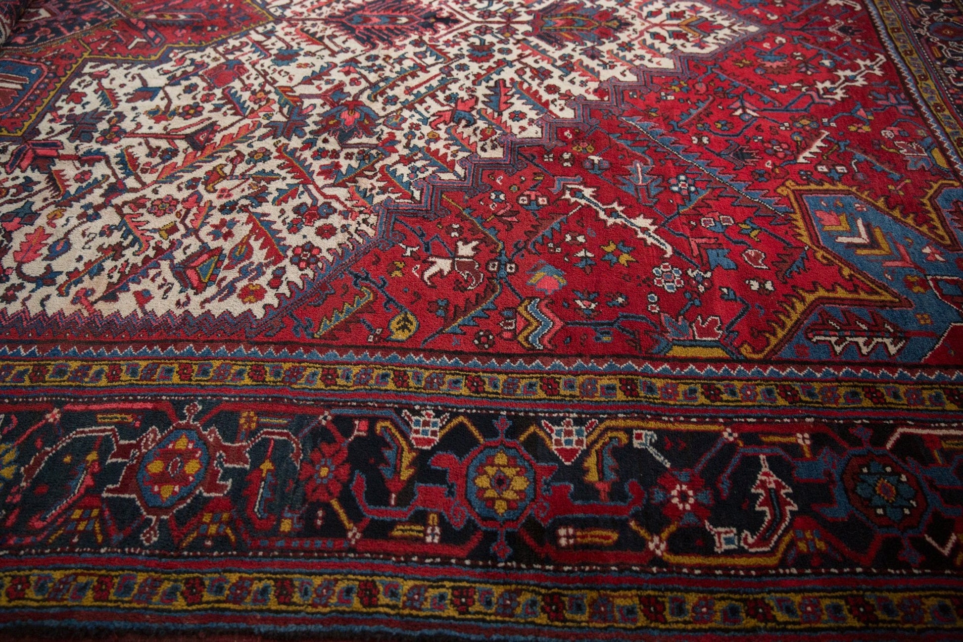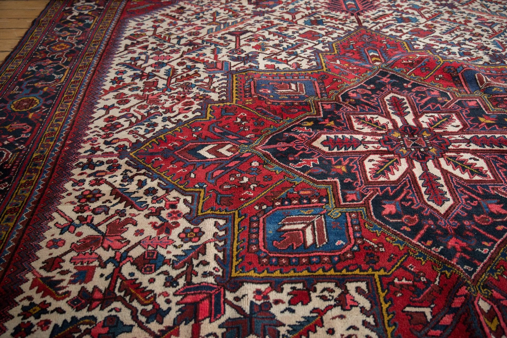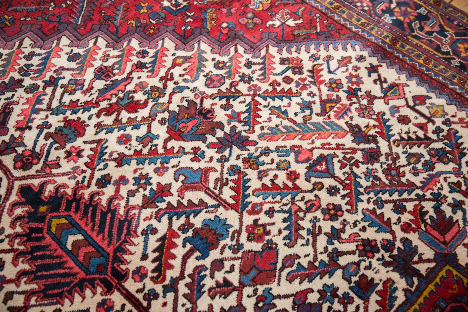 :: Oversized center medallion with double end finials atop a covered field of serrated leaves in lattice orientation. Colors and shades include: Ivory, sapphire blue, gold, wine red, blush, and more. Condition notes: Even original pile height across. Original side cord selvages intact. Fully secured sides and ends. Recently professionally cleaned ready for in-home use! Many years of enjoyment to come with this hand knotted Persian Mehrivan carpet made in Persia circa 1960's vintage. Size measures 11'8" x 21'4".
