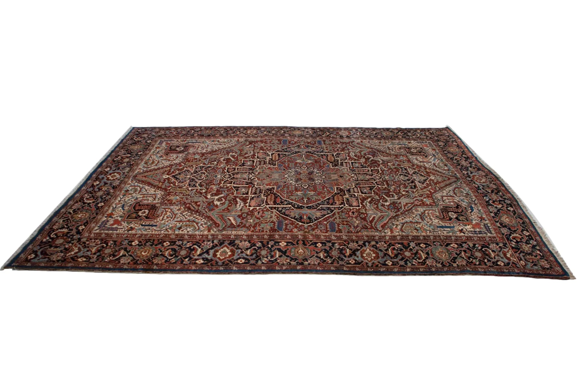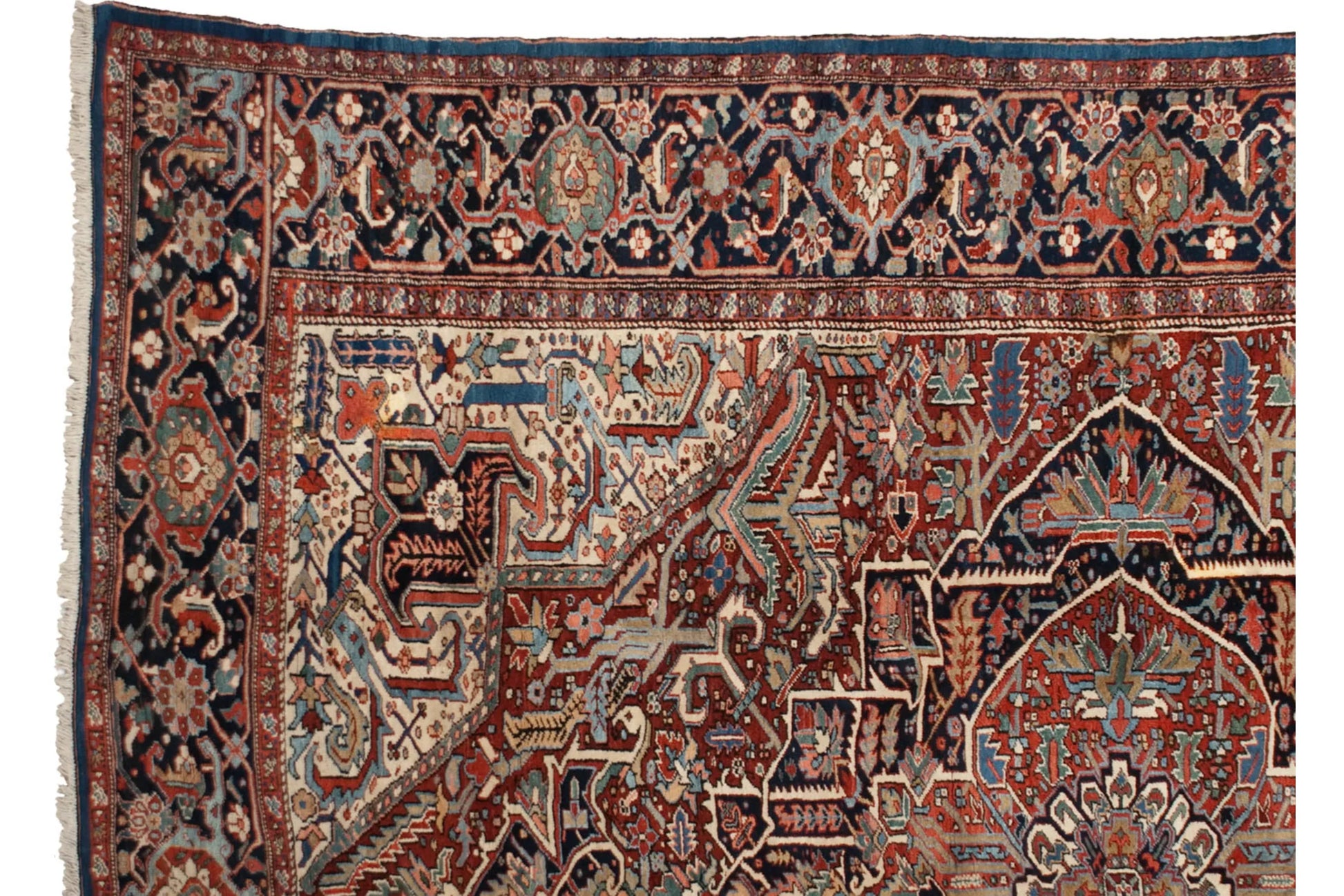 :: Phenomenal example in exceptional condition bearing a large oversized medallion with shield like partial samovar stylized finials at either opposing end. Oversized serrated leaves in germinating plant formations interconnected by highly detailed finned character vines and lightning style leaves at either opposing ends. Sprawling floral arabesques adorn the main corner spandrels with a rainbow effect of shades in a highly sophisticated example of an unusually high color count and use thereof. Unique outer strip border in a solid abrashed sapphire blue. Colors and shades include: Cherry red, brick red, navy blue, indigo blue, sapphire blue, powder blue, jade green, emerald green, beige, wine red, pale rose and more. Condition notes: Even original pile height across. Original side cord selvages intact. Fully secured sides and ends. A few very minor areas of subtle and light discoloration isolated and photographed. Recently professionally cleaned ready for in-home use! Many years of enjoyment to come with this hand knotted Persian Bakshaish carpet made in Persia circa 1930's vintage. Size measures 11'2" x 14'4".