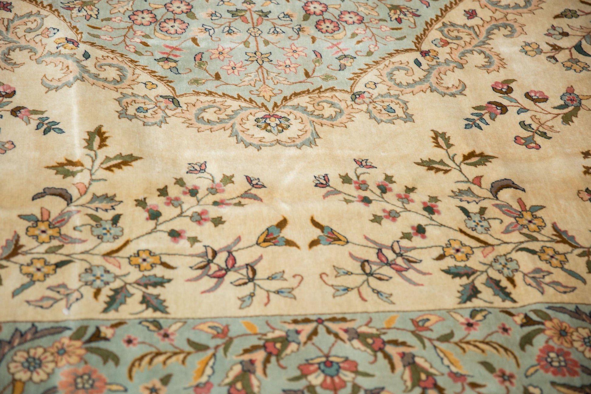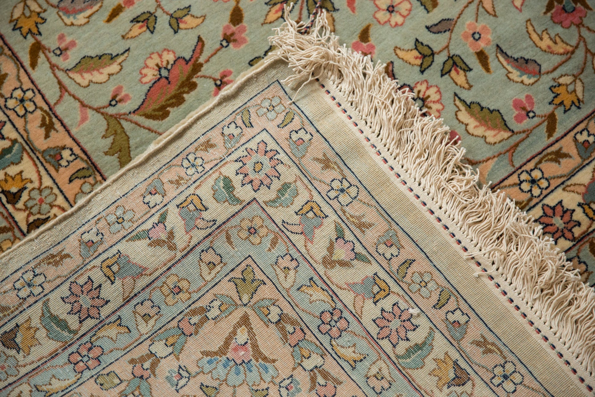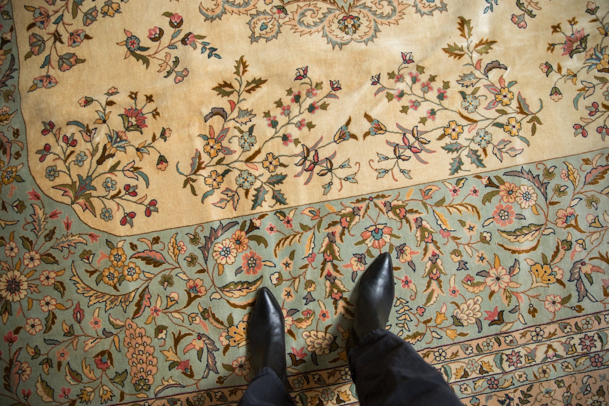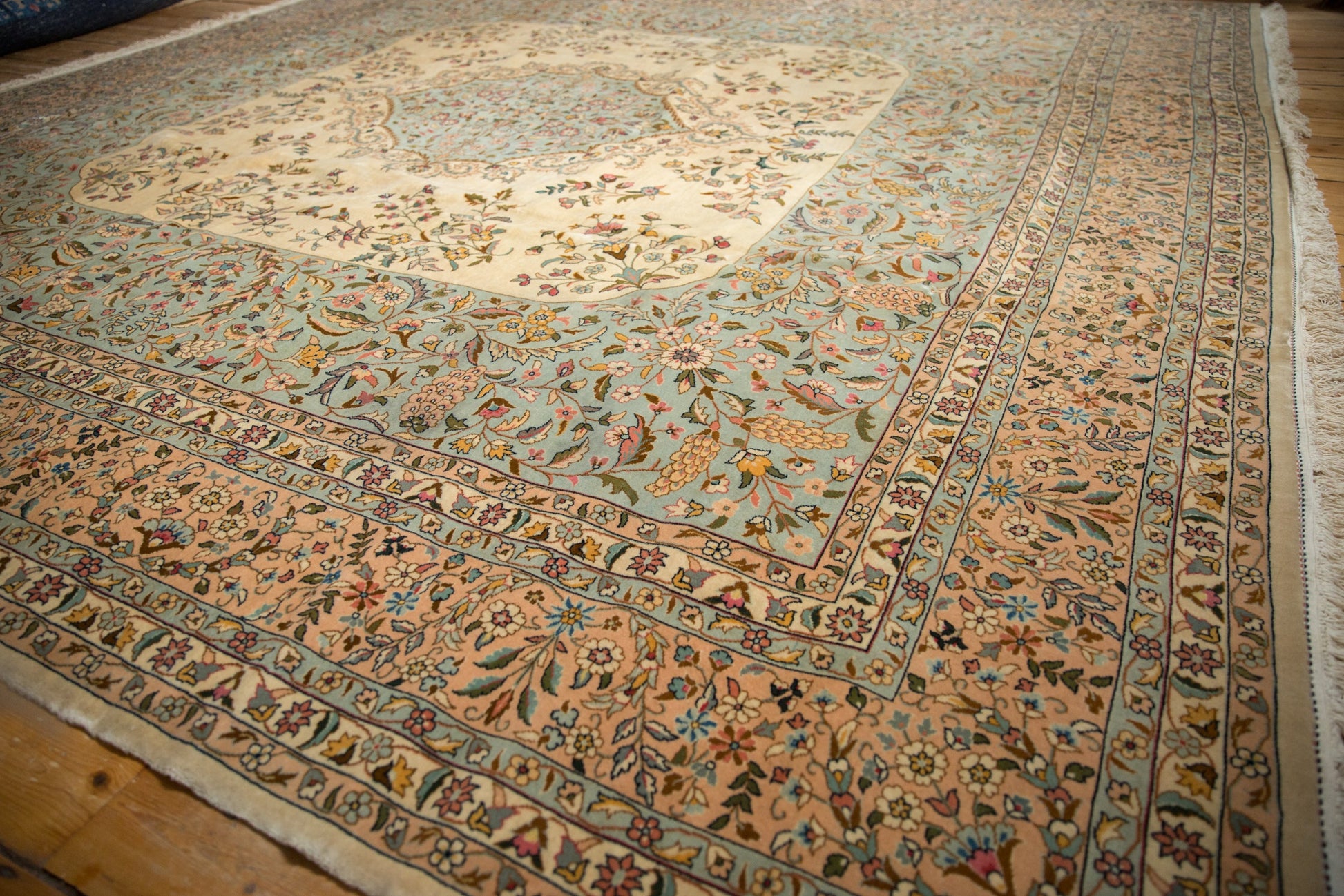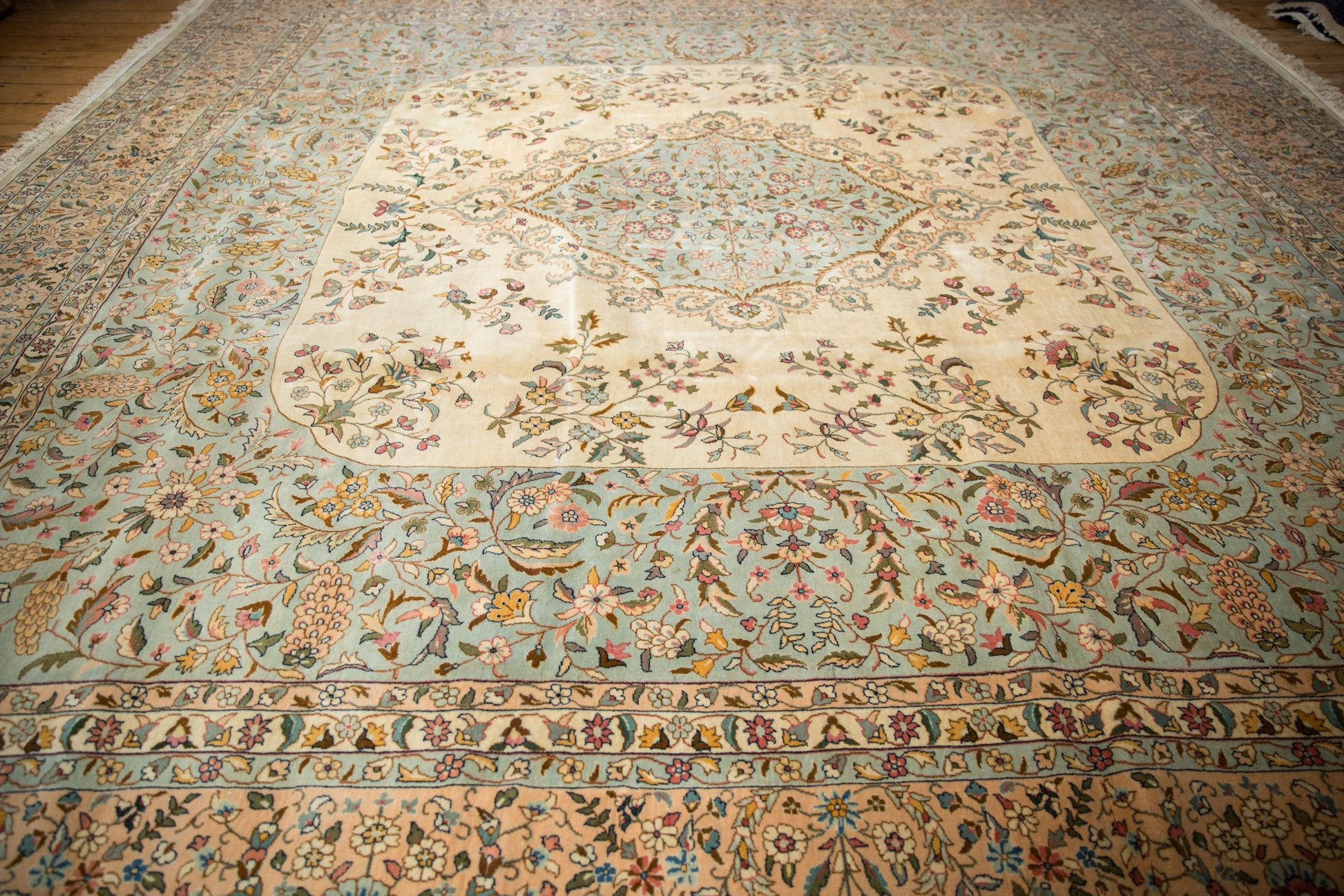 :: Center medallion with interior detailed floral vine motif wrapped by Rococo stylized scrolling atop a covered field of floral sprays and bouquets. Immensely detailed and ornate field overlay in a playful and happy celebration of blossomed buds, scrolling vinery and intricate leaves. Colors and shades include: Ivory, pale powder blue, dusty rose, beige, sand, copper, saffron yellow, coffee brown, oxidized silver, olive green, and more. Condition notes: Like-new, original full pile height even across. Original side cord selvages intact. Fully secured sides and ends. Recently professionally cleaned ready for in-home use! Many years of enjoyment to come with this hand knotted Bulgarian Kerman design square carpet made in Bulgaria circa 1960's vintage. Size measures 11'11" x 11'11".