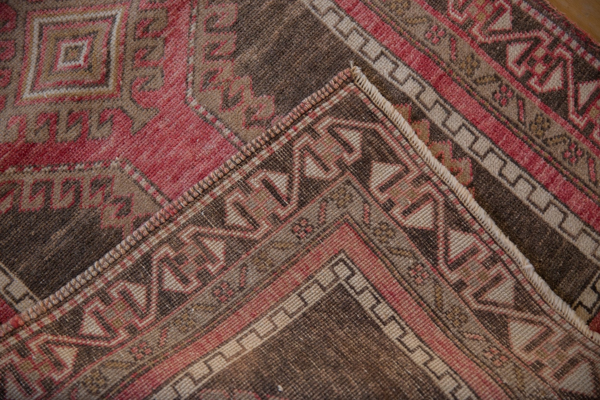 :: Repeating single column center medallion gul motif wrapped by hook and latch design elements atop an abrashed open field. Colors and shades include: Oxidized silver, cochineal red, raspberry red, beige, sand, ivory, and more. Condition notes: Even wear across to knot heads with faint foundation showing through. Original side cord selvages intact. Fully secured sides and ends. For processing purposes, this and other rugs of the type may have painted numbers on the reverse side. Recently professionally cleaned ready for in-home use! Many years of enjoyment to come with this hand knotted Turkish Oushak rug runner made in Turkey circa 1970's vintage. Size measures 2'8" x 9'11".