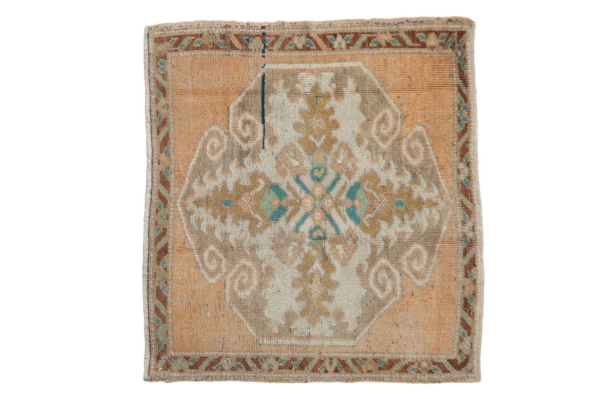 :: Oversize center medallion with outwardly directed large scale serrated buds in quatrefoil orientation and scrolled ram's horn main medallion outline. Colors and shades include: Pale tangerine orange, oxidized silver, dusty turquoise blue, celadon green, copper, ivory, navy blue, and more. Condition notes: Wear across to foundation and knot heads. Most of the original side cord selvages are intact or restored. Fully secured sides and ends. This rug is wider than it is long, and sizes have been inverted from our normal convention to ensure presence in our size range search filter. For processing purposes, this and other rugs of the type may have painted numbers on the reverse side. Recently professionally cleaned ready for in-home use! Many years of enjoyment to come with this hand knotted Turkish Oushak square rug mat made in Turkey circa 1980's vintage. Size measures 2'4" x 2'7".