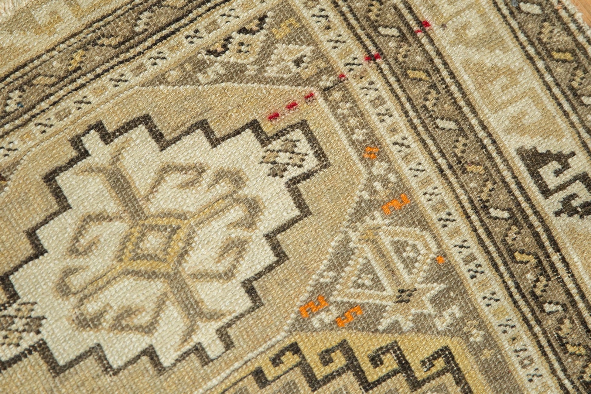 :: Triple gul with inner geometric blossoming plant motif wrapped by stepped / hook and latch motif. Awesome serpent main border with great details in the minor borders. Colors and shades include: Antique ivory, beige, sand and more. Condition notes: Even wear across to knot heads with faint foundation showing through. Loss to either end, although fully secured sides and ends. Recently professionally cleaned ready for in-home use! Many years of enjoyment to come with this hand knotted Caucasian square rug mat made in the Caucasus region circa 1910's vintage. Size measures 2' x 2'4".