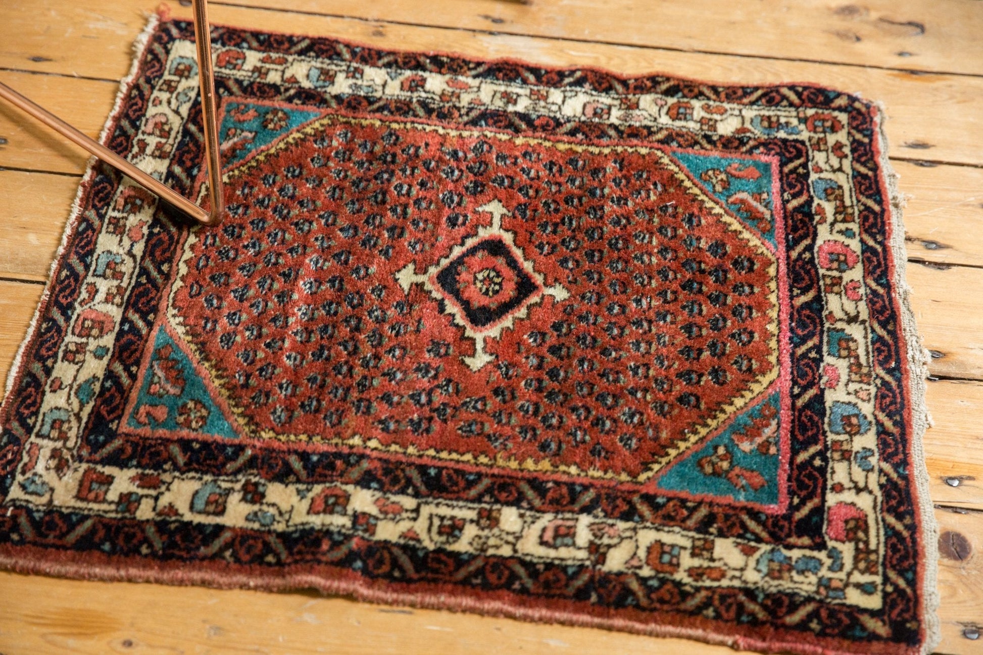 :: Small center medallion bearing stepped contour and arrow head end finials at each point atop a covered field of germinating botehs (seeds!). Colorful and richly saturated shades, many in the hard to achieve gem tones. Colors and shades include: Ruby red rust, sapphire blue, yellow diamond, ivory, navy blue, blush, pink and more. Condition notes: Mostly even low pile with some areas of knot heads showing. Fully secured sides and ends. Recently professionally cleaned ready for in-home use! Many years of enjoyment to come with this hand knotted Persian Engelas square rug mat made in Persia circa 1930's vintage. Size measures 2'3" x 2'5".