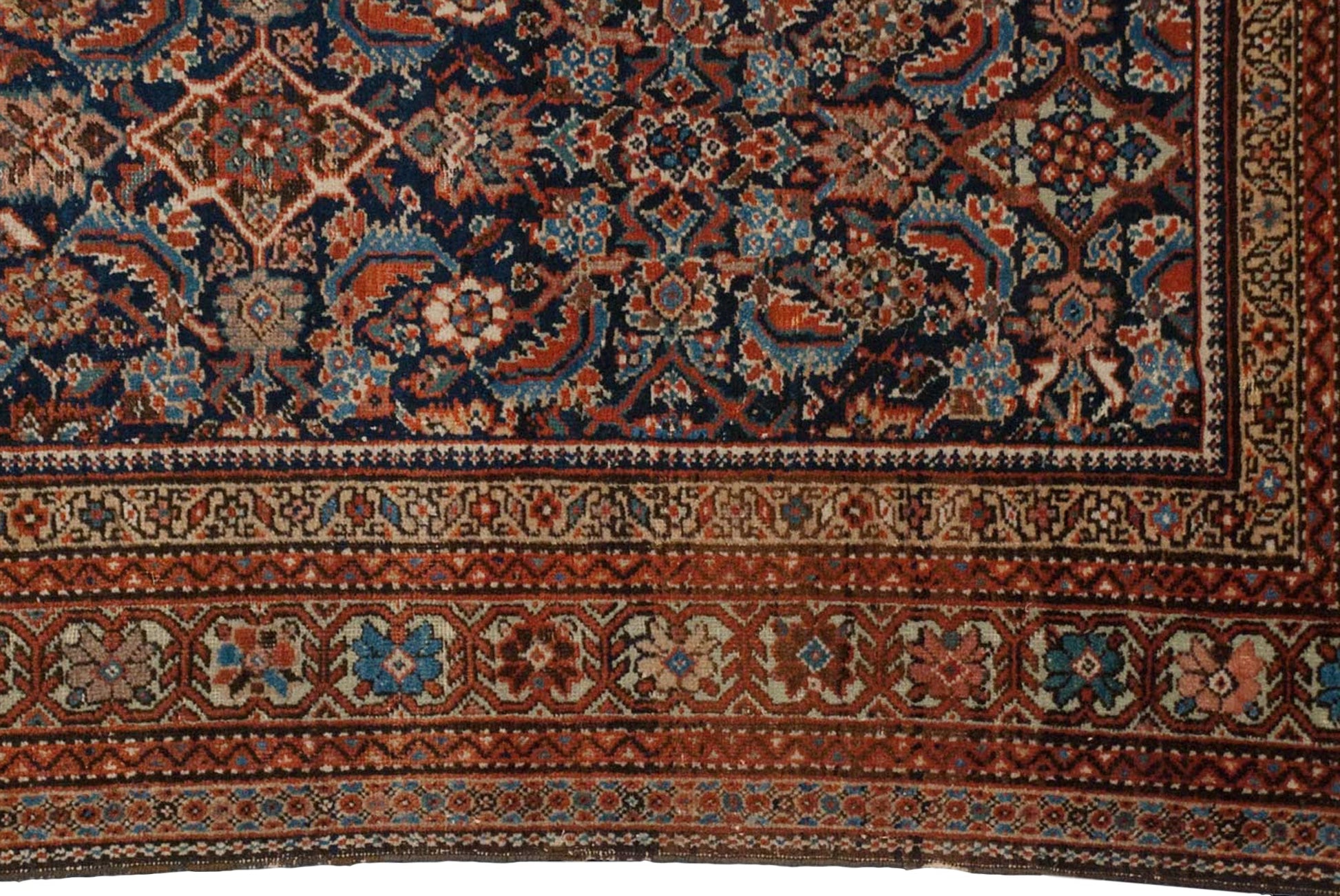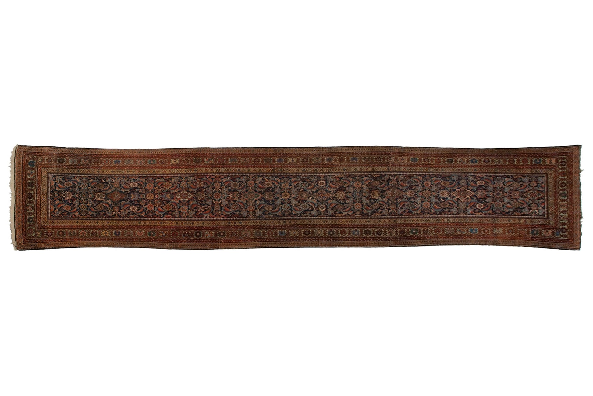 :: Allover covered field in a Herati motif in fantastic palette saturation. Excellent balance between positive and neutral spacing with nuanced unique color fill character throughout and densely ornamented design rendering with unique character with artistic merit. Unusual, rare, unreduced example with original character intact, and hallmark signature Fereghan green main border ground. Scarce example for the type! Colors and shades include: Navy blue, sky blue, oxidized copper green, rust, terra cotta, beige, and more. Condition notes: Even, short pile height across. Most of the original side cord selvages are intact or restored. Fully secured sides and ends. Some recess to the green border color pile based on age and mordants. Recently professionally cleaned ready for in-home use! Many years of enjoyment to come with this hand knotted Persian Fereghan rug runner made in Persia circa 1870's vintage. Size measures 3'5" x 16'6".