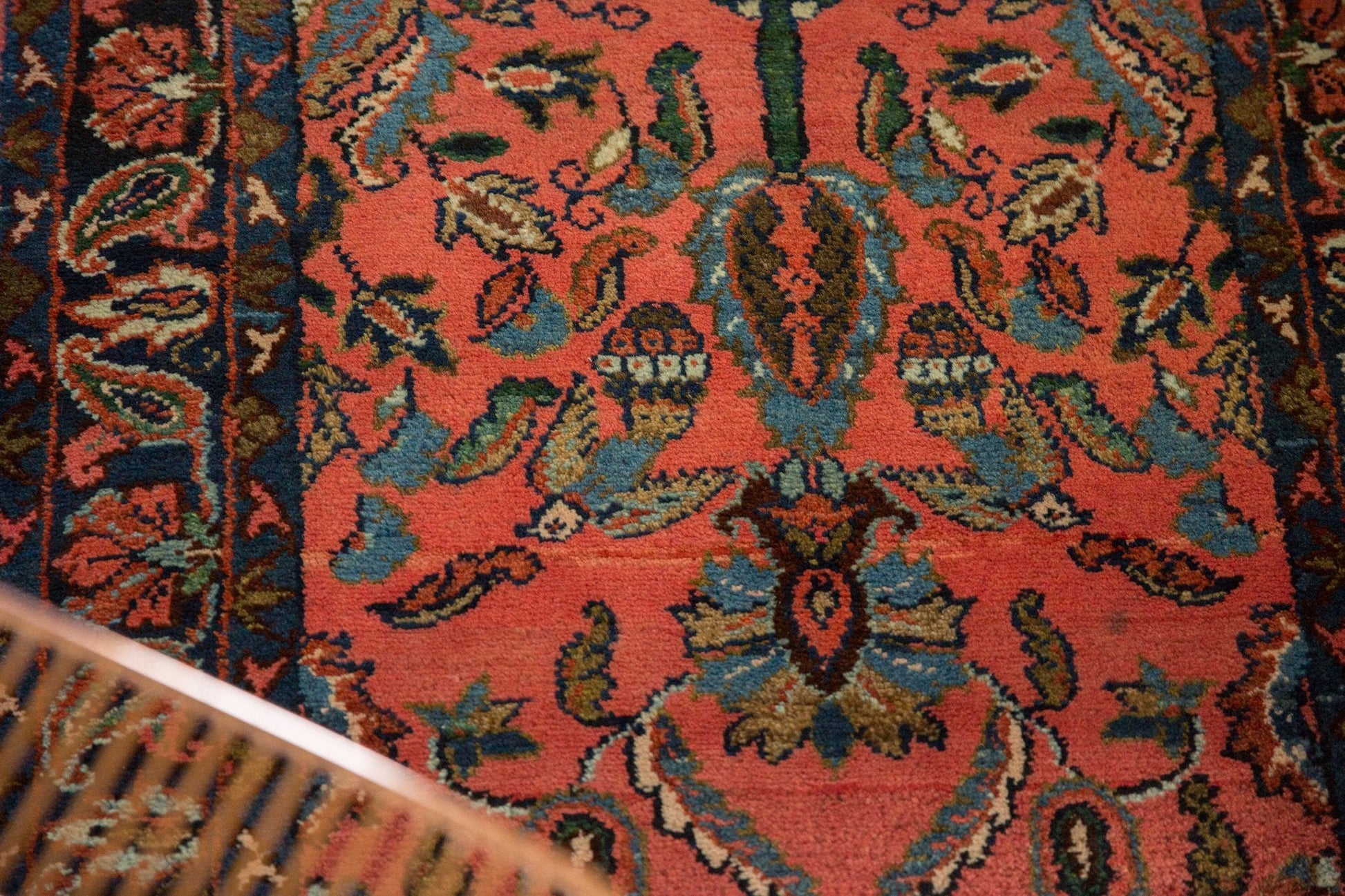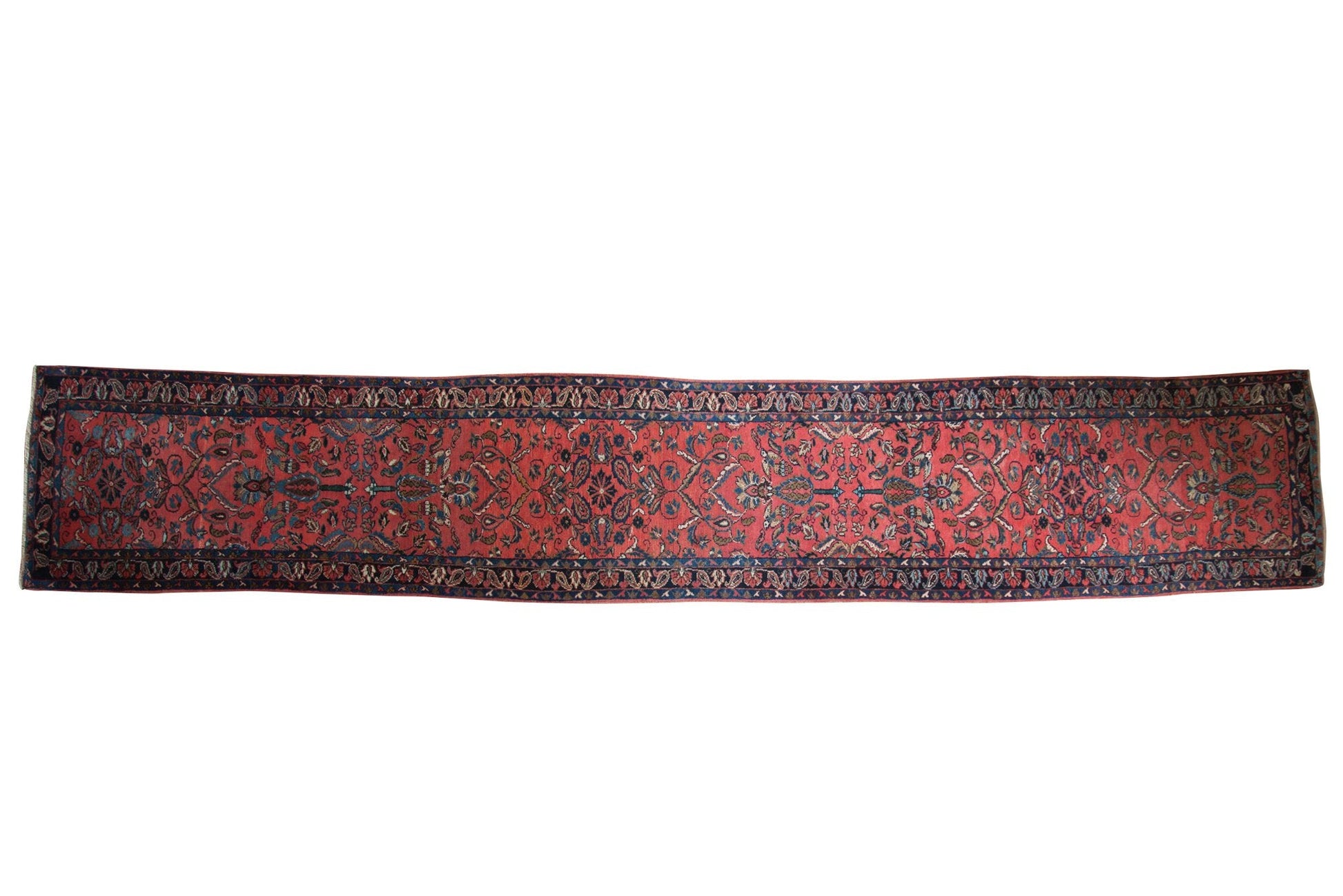 :: Allover covered field in germinating tree of life motif paired with birds and floral design elements including botehs symbolizing rebirth and germination. Colors and shades include: Deep Blush, dark rose, navy blue, powder blue, coffee brown, beige, sand, ivory and more. Condition notes: Even low pile across with fully secured sides and ends. Recently professionally cleaned ready for in-home use! Many years of enjoyment to come with this hand knotted Persian Lilihan rug runner made in Persia circa 1940's vintage. Size measures 2'10" x 16'3".