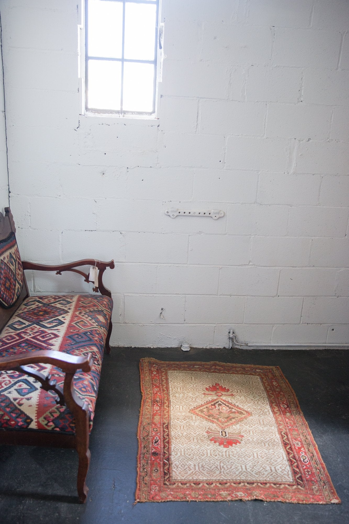 :: Diamond shaped center medallion with oversized palmette end finials atop a shadow design lattice oriented design motif with inner outlined guls bearing rams horn relief. Meandering vine inner and outer borders, boteh main border. Colors and shades include: Ivory, beige, fuchsia red, cherry red, coffee brown, sky blue, and more. Condition notes: Even wear across to knot heads with faint foundation showing through. Loss to one outer minor border on one end. Fully secured sides and ends. Recently professionally cleaned ready for in-home use! Many years of enjoyment to come with this hand knotted Persian Malayer square rug made in Persia circa 1910's vintage. Size measures 3' x 3'7".
