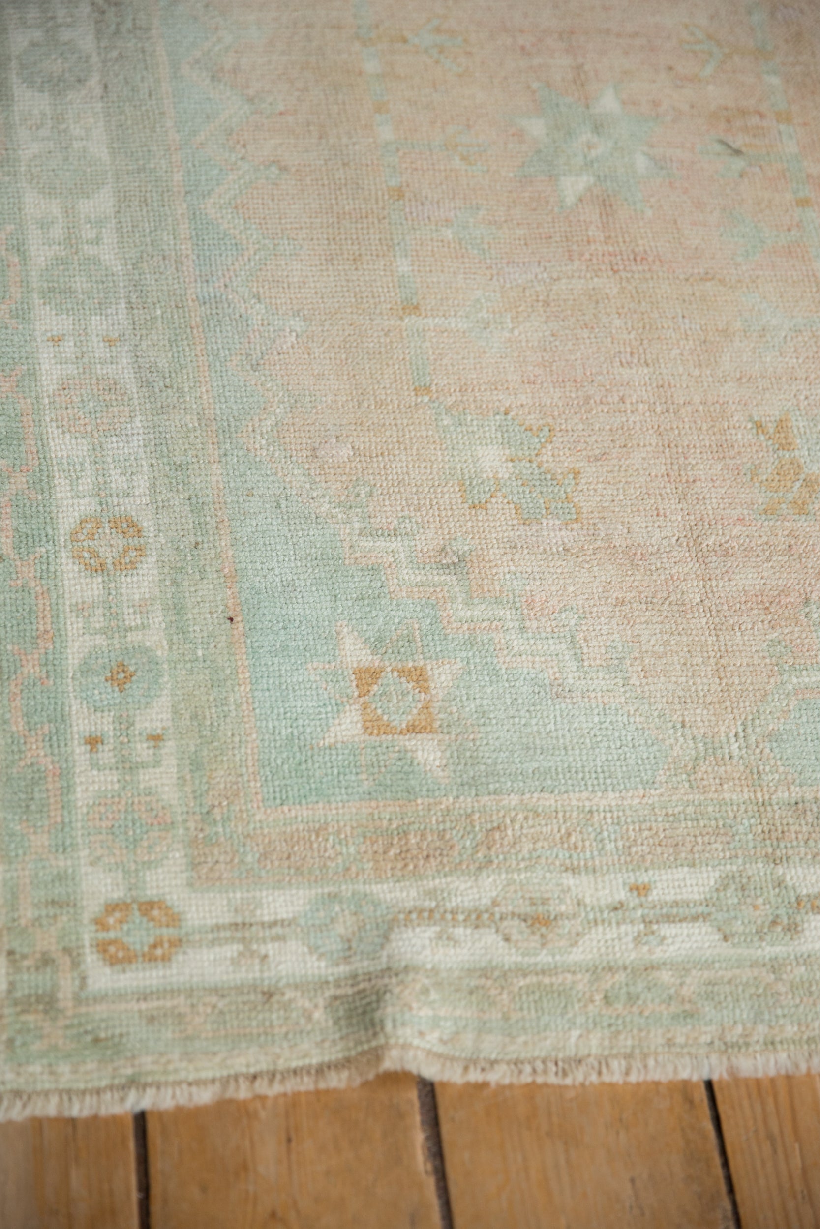 :: Pinwheel style center minor medallion atop an open abrashed field with parallel vines of germinating plants. Main border in a vine and floral gul design motif. Colors and shades include: Pale melon, soft seafoam green, powder blue, sand, copper bronze, mint green, silver, ivory, and more. Condition notes: Even wear across to knot heads. Most of the original side cord selvages are intact or restored. Fully secured sides and ends. For processing purposes, this and other rugs of the type may have painted numbers on the reverse side. Recently professionally cleaned ready for in-home use! Many years of enjoyment to come with this hand knotted Turkish Oushak square rug made in Turkey circa 1970's vintage. Size measures 2'10" x 3'11".