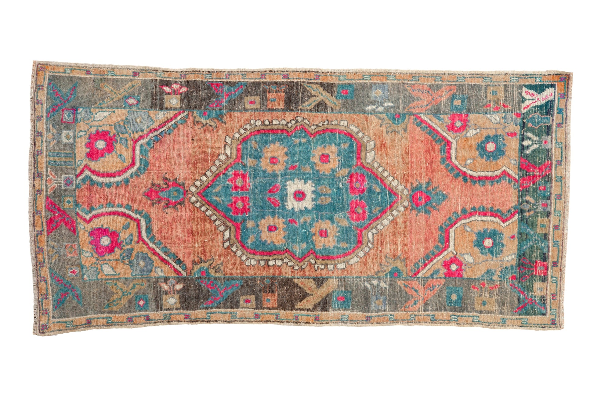 :: Oversized center medallion with floral top views and minor delicate vines interconnecting. Adorned at either opposing end by floral cross-section finials atop an abrashed field with corner spandrel overlays reciprocating the contour of the main medallion with inverted coloration and design. Colors and shades include: Cantaloupe melon, dusty teal, dusty turquoise blue green, fuchsia, magenta, charcoal, oxidized silver, beige, dusty saffron yellow, pale ruby red grapefruit, and more. Condition notes: Even wear across to knot heads. Most of the original side cord selvages are intact or restored. Fully secured sides and ends. One small are of expert repile. For processing purposes, this and other rugs of the type may have painted numbers on the reverse side. Recently professionally cleaned ready for in-home use! Many years of enjoyment to come with this hand knotted Turkish Oushak rug made in Turkey circa 1960's vintage. Size measures 2'11" x 5'8".