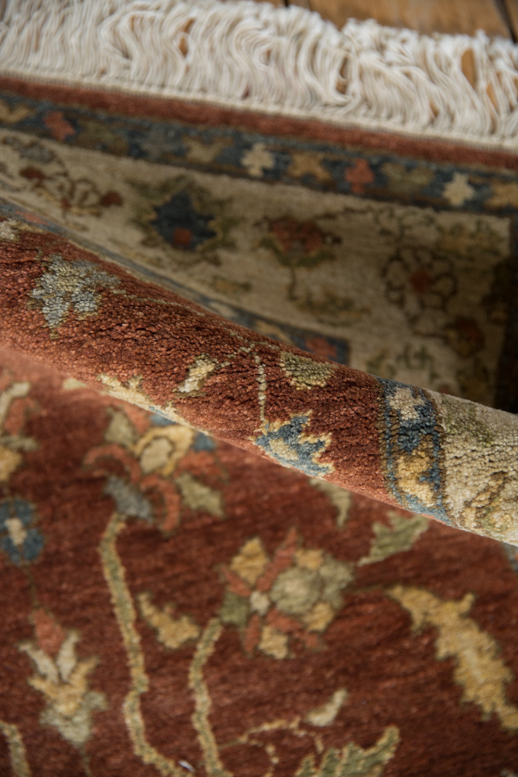 :: Elaborate center palmette with sprawling vinery stemming therefrom finished in intricate floral blossoms and serrated leaves bearing unique artistic merit throughout. Weaver insignia in the main border and the interior. Very fine quality wool. Colors and shades include: Deep copper, chestnut brown, ivory, dusty teal, pale saffron beige, oxidized silver, silver, pale terracotta, pale sandalwood, and more. Condition notes: Like-new, original full pile height even across. Original side cord selvages intact. Fully secured sides and ends. Recently professionally cleaned ready for in-home use! Many years of enjoyment to come with this hand knotted Armenian Lilihan design rug made in Armenia circa 1990's vintage. Size measures 3'2" x 5'.