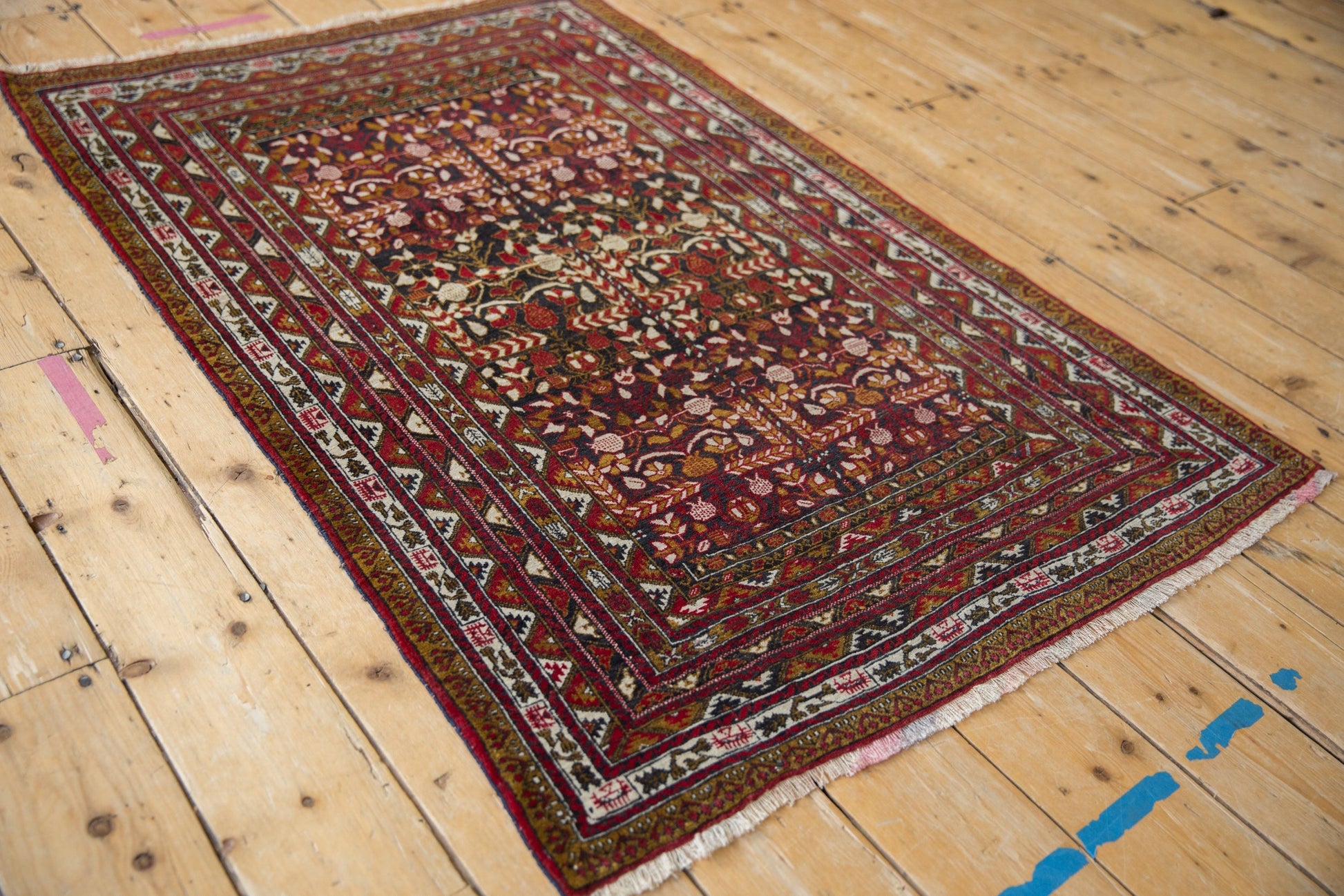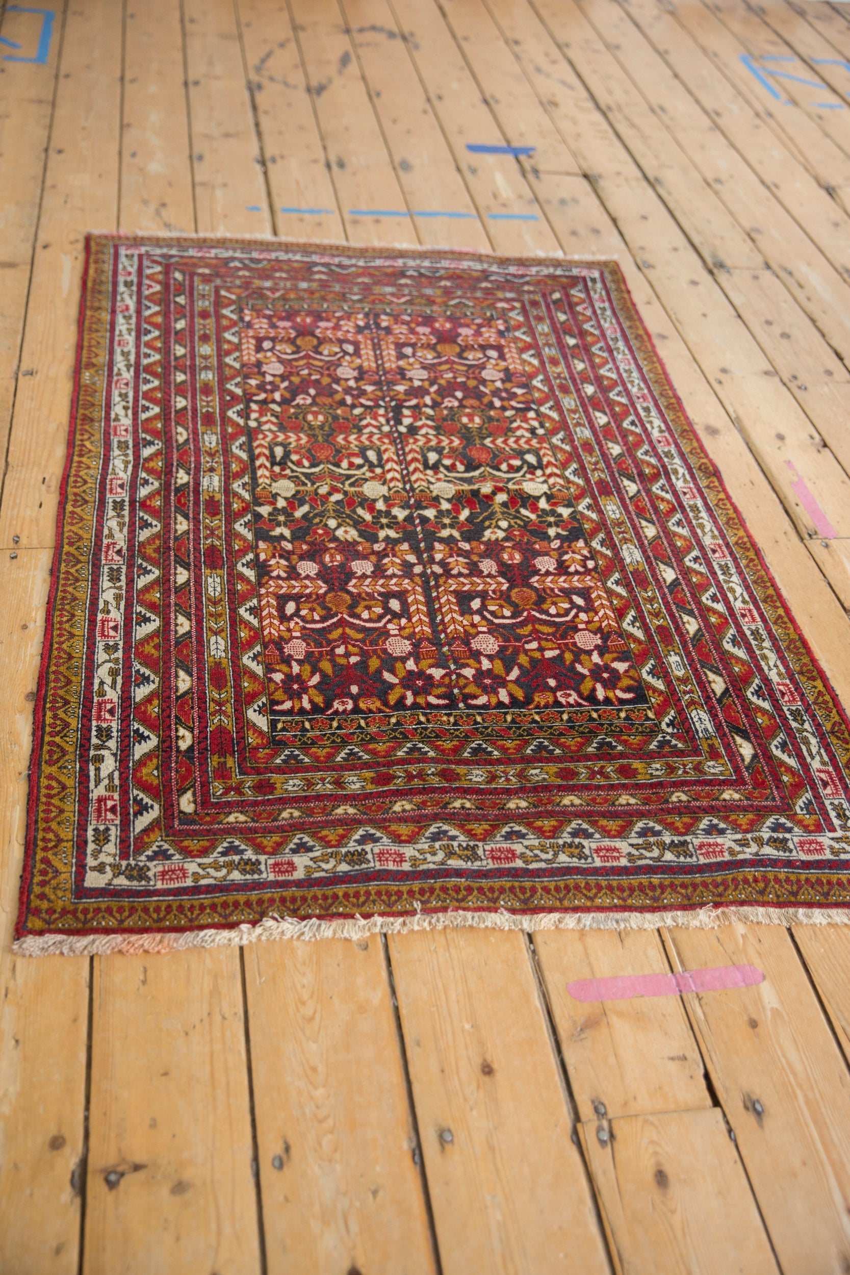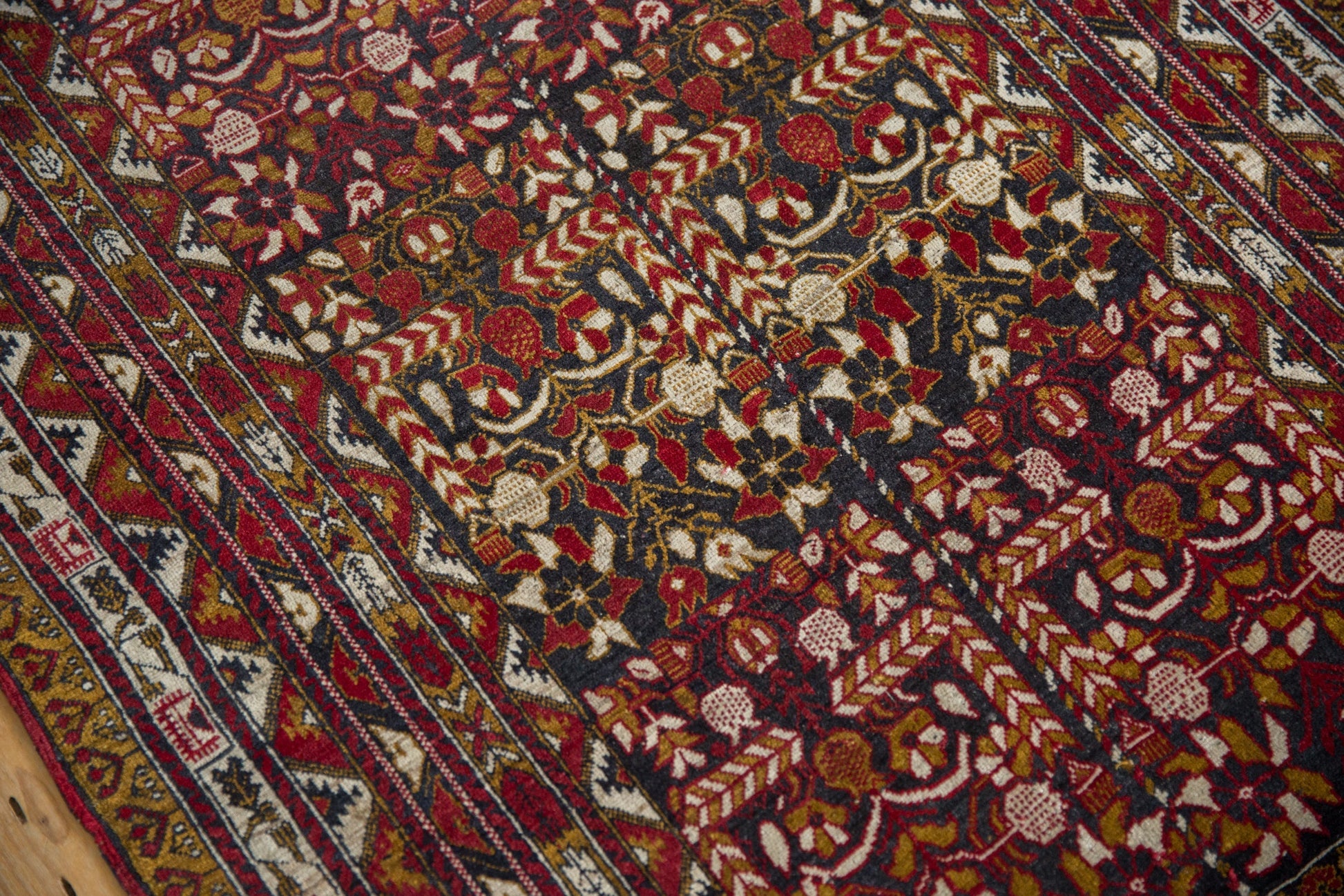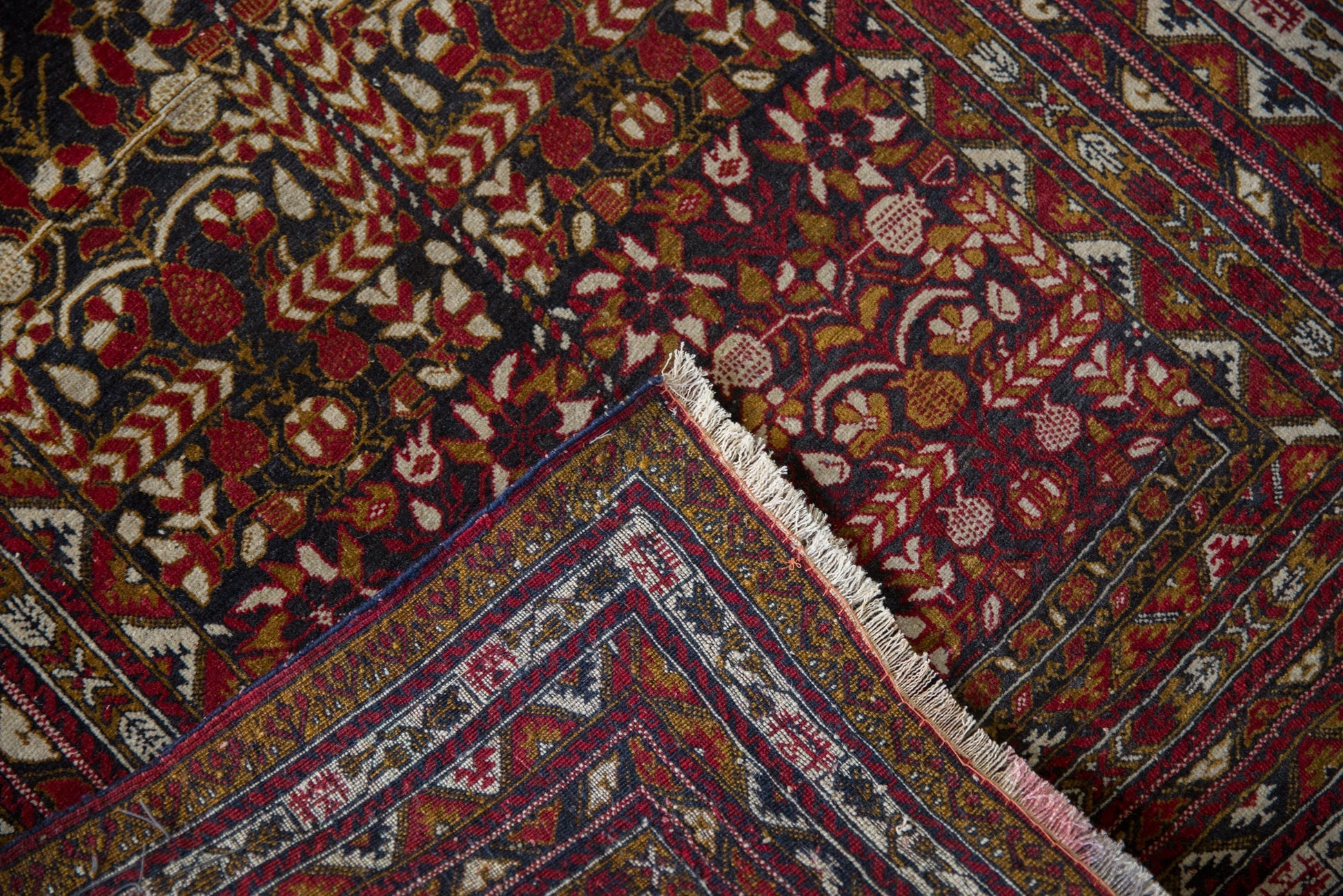 :: Partially compartmentalized panels with ribboned vines and leaves buffering the main motif of a pomegranate garden. Wrapped by multiple borders in intricate serrated geometric design relief. Colors and shades include: Charcoal, cherry red, dark gold, and more. Condition notes: Even original pile height across. Original side cord selvages intact. Fully secured sides and ends. Light color migration of the red shades to the fringe. Recently professionally cleaned ready for in-home use! Many years of enjoyment to come with this hand knotted Persian Belouch rug made in Persia circa 1980's vintage. Size measures 3'3" x 4'10".