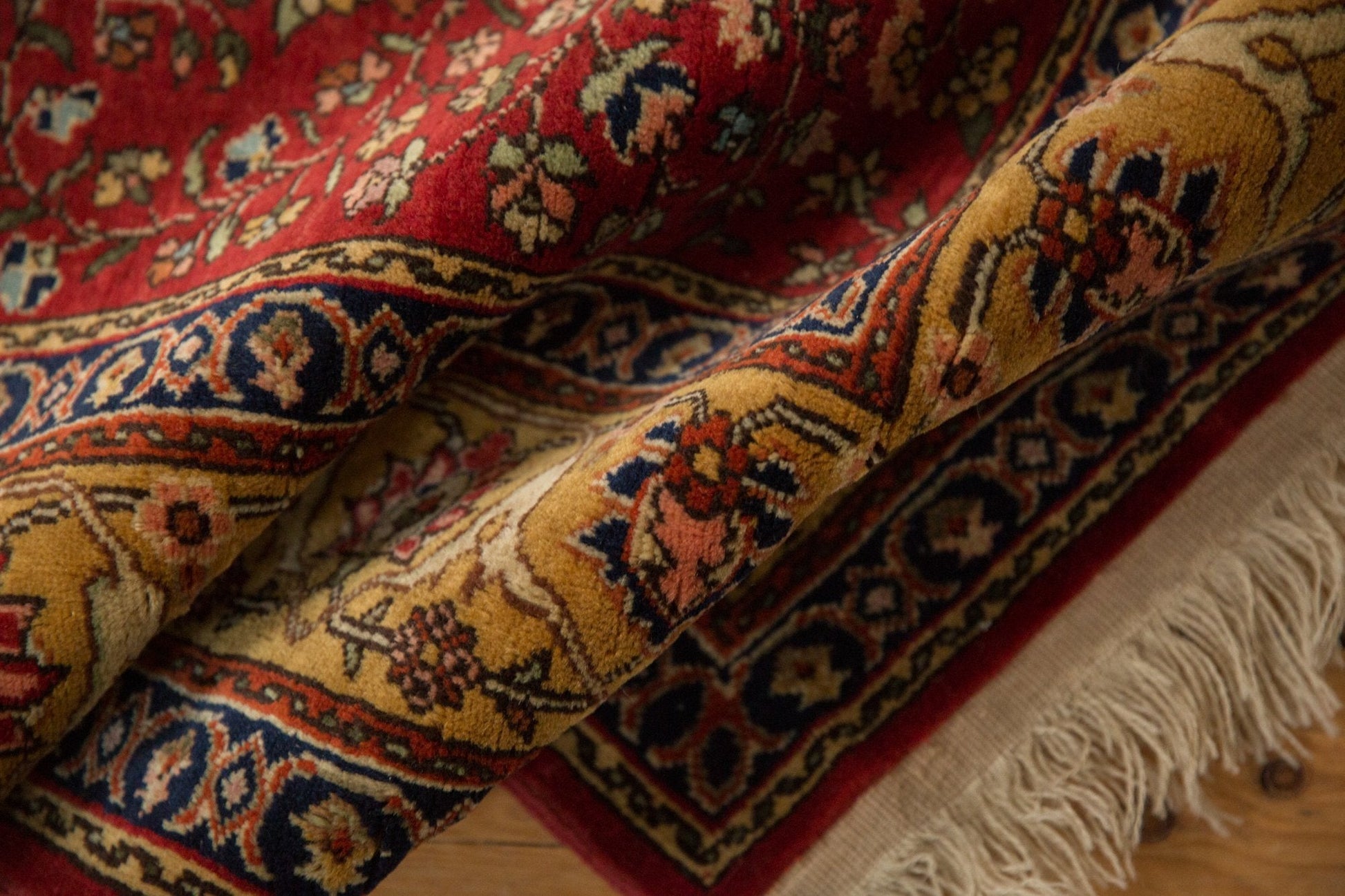 :: Intricate unidirectional tree of life design motif inspired in part by antique Hereke carpets with a fusion of a millefleur design motif. Phenomenal main border in blossomed floral arabesques. Colors and shades include: Cherry red, ivory, sand, beige, powder blue, forest green, and more. Condition notes: Like-new, original full pile height even across. Original side cord selvages intact. Fully secured sides and ends. Recently professionally cleaned ready for in-home use! Many years of enjoyment to come with this hand knotted Romanian Hereke design rug made in Romania circa 1970's vintage. Size measures 4'8" x 6'7".