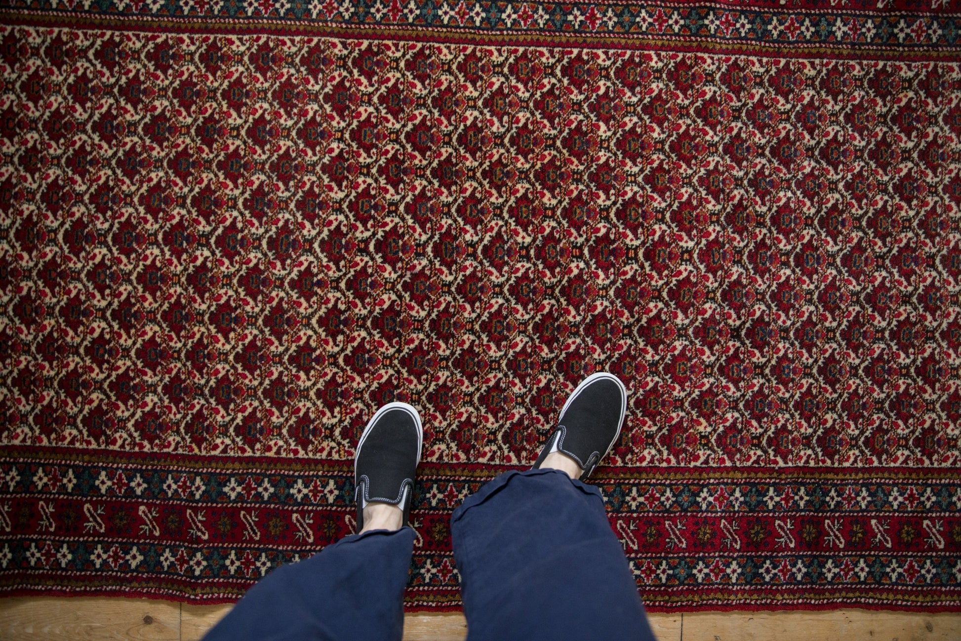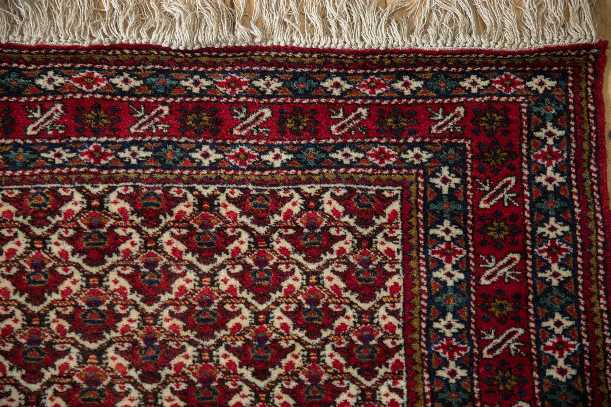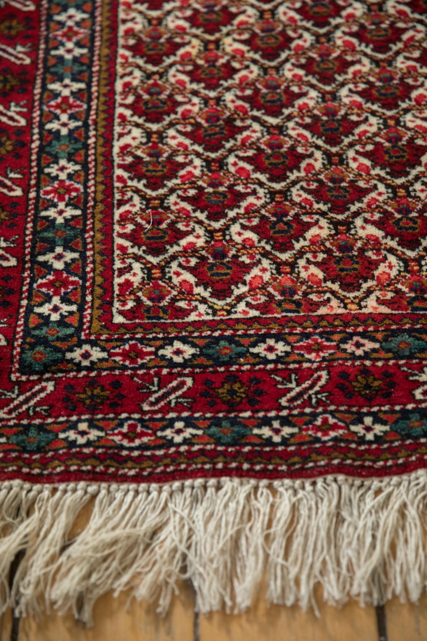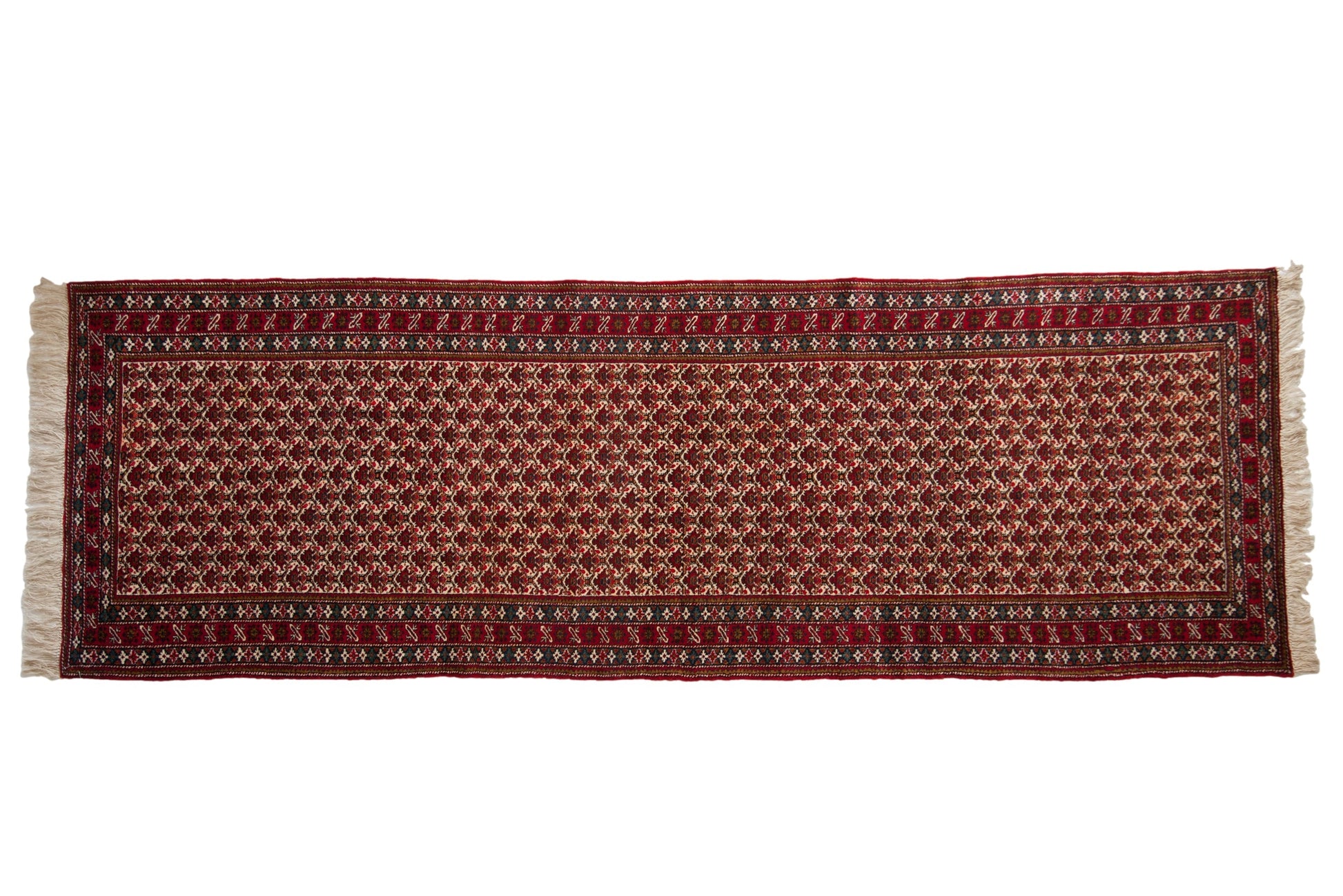:: Allover covered field of floral palmettes in lattice orientation repeating across the field with delicate vinery in cartouche stylized relief. Colors and shades include: Cherry red, ivory, dark navy blue, teal, pale saffron yellow, and more. Condition notes: Like-new, original full pile height even across. Original side cord selvages intact. Fully secured sides and ends. Recently professionally cleaned ready for in-home use! Many years of enjoyment to come with this hand knotted Persian Ardebil rug runner made in Persia circa 1960's vintage. Size measures 3'11" x 11'9".