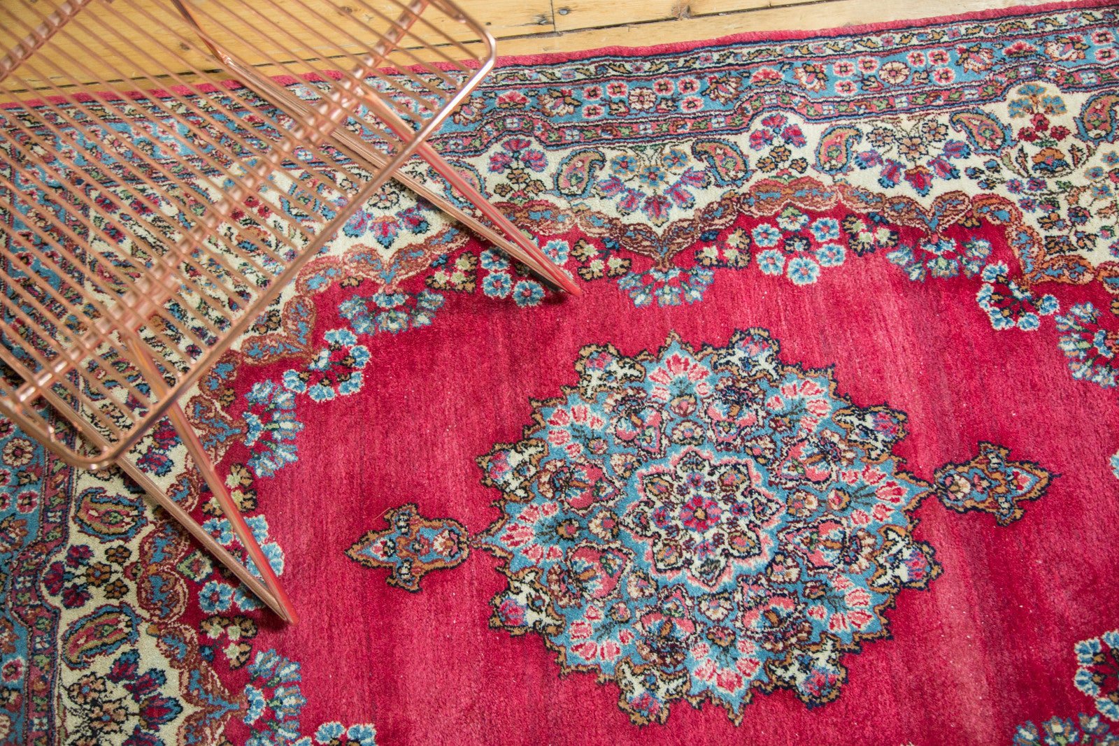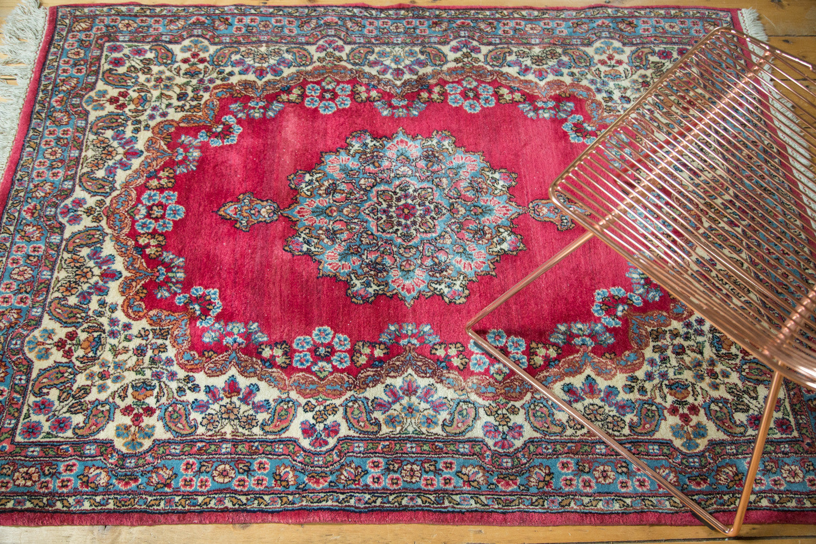 :: Roundel medallion atop a medallion with scalloped rococo contouring, floating on an open field of abrashed cochineal red. Bursting floral bouquets enveloping in an overlay filled with paisley botehs emulating germinating seed with flower therein. Heavily inspired by millefleur carpets of yesteryear. This particular rug is part of the import of Mehdi Dilmaghani & Co., Inc. Based on the coloration, style, and quality, this is likely attributed to the firm's mid-1950's manufacturing, in and around Kerman, Iran. Colors and shades include: Natural cochineal red, indigo blue, ivory, sea foam green, beige, terracotta, apricot, peach, rich gold, and more. Condition notes: Mostly even wear across with minimal signs of use within the interior. Recently professionally cleaned ready for in-home use! Many years of enjoyment to come with this hand knotted vintage Persian Kerman rug made in Persia circa 1950's vintage. Size measures 3'10" x 5'4".