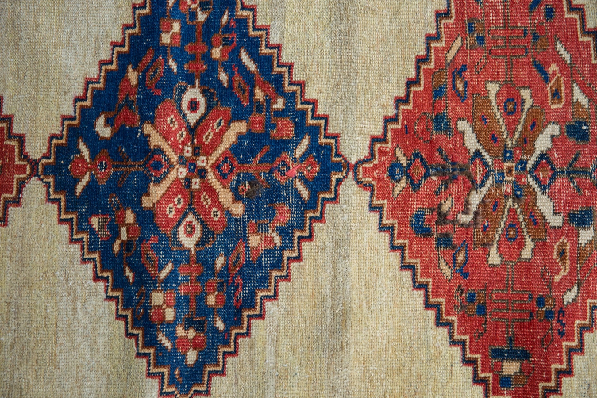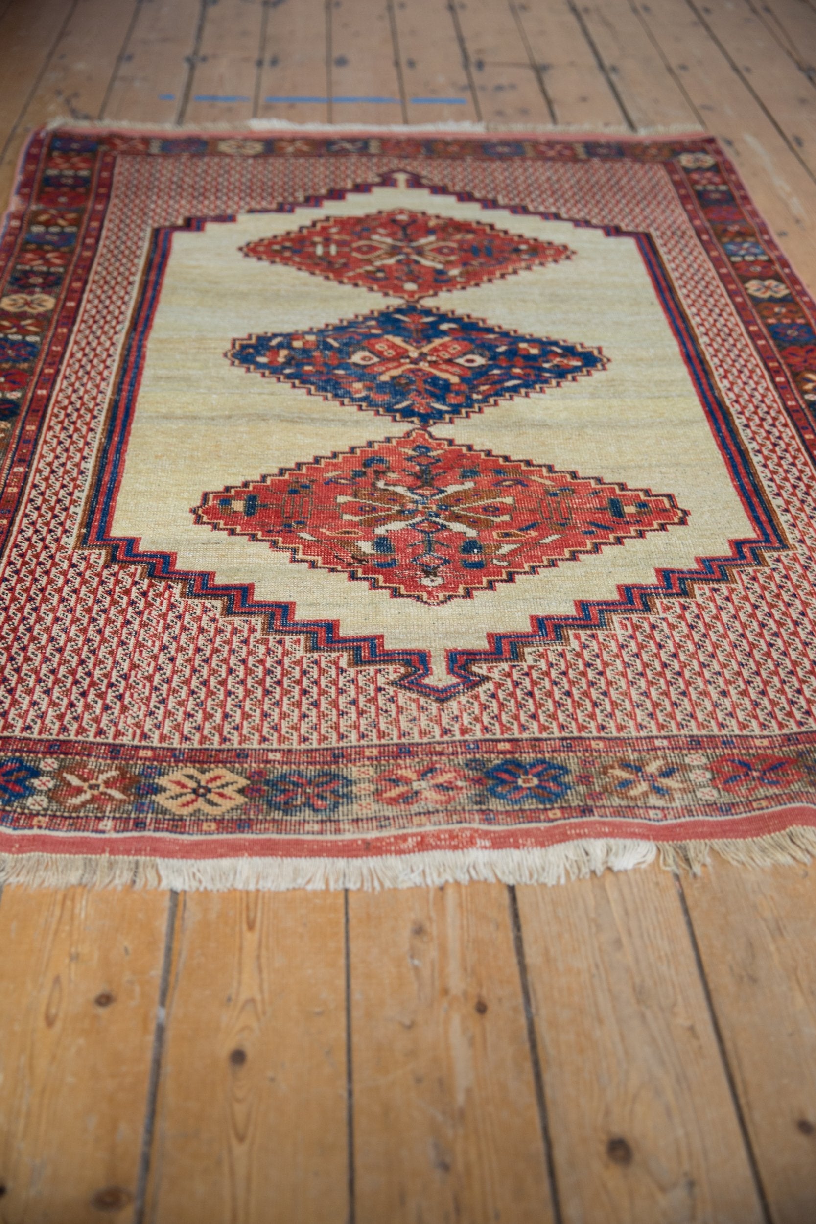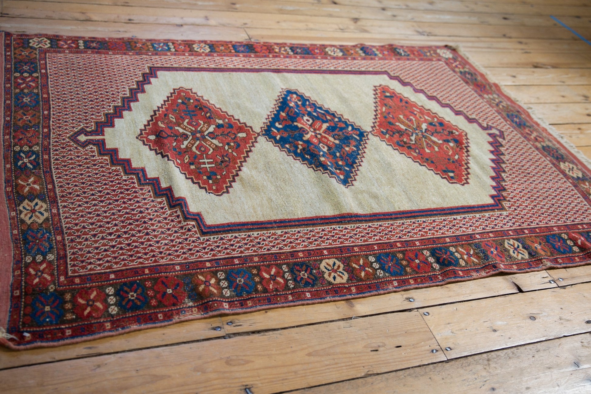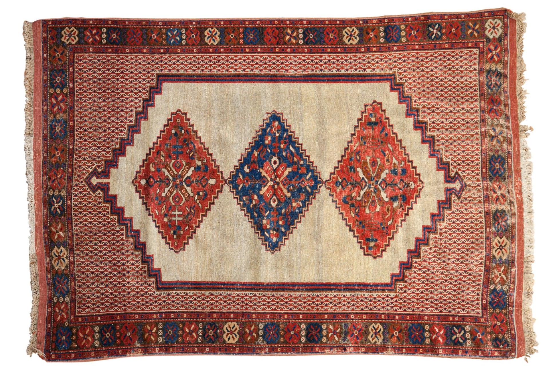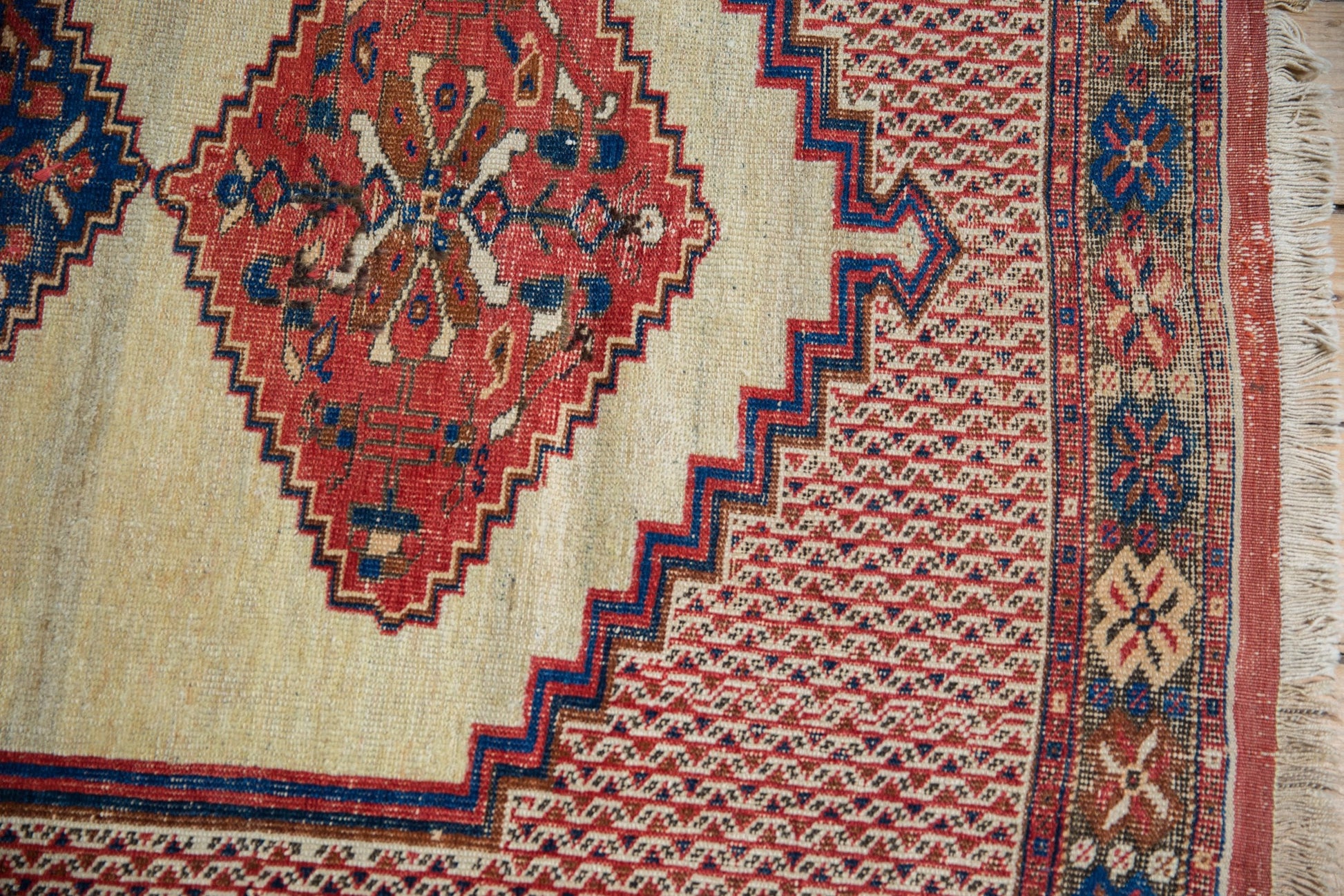 :: Triple center medallion with stepped serrated border and interior detailed celebratory blossoms atop an unusual ivory ground in a larger multi-banded stepped border. Unusual ribboned and highly intricate ground motif with great detail, wrapped by a colorful main border of floral top views. Colors and shades include: Ivory, madder root red, sapphire blue, dusty bronze, ivory, pale saffron yellow and more. Condition notes: Mostly even wear across to knot heads with small isolated areas of foundation showing through. Most of the original side cord selvages are intact or restored. Fully secured sides and ends. Areas of oxidation with recess to knot heads, especially in the tones of brown and charcoal families. Recently professionally cleaned ready for in-home use! Many years of enjoyment to come with this hand knotted Persian Afshar rug made in Persia circa 1895-1910 vintage. Size measures 4' x 5'9".