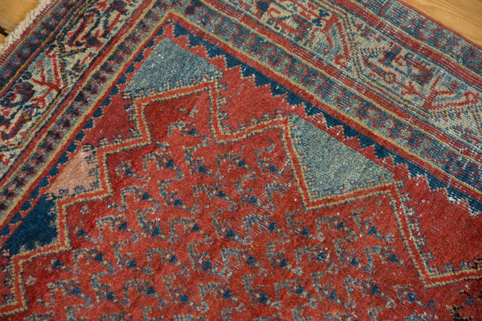 :: Diamond shaped center medallion atop a covered field of botehs. Outer floating framed zigzag design panels in un-patterned color alternation. Colors and shades include: Cherry red, navy blue, ivory, sky blue, powder blue and more. Condition notes: Mostly even wear across to knot heads with faint foundation showing through. Fully secured sides and ends. For processing purposes, this and other rugs of the type may have painted numbers on the reverse side. Recently professionally cleaned ready for in-home use! Many years of enjoyment to come with this hand knotted Persian Serbend rug made in Persia circa 1930's vintage. Size measures 4'3" x 7'.