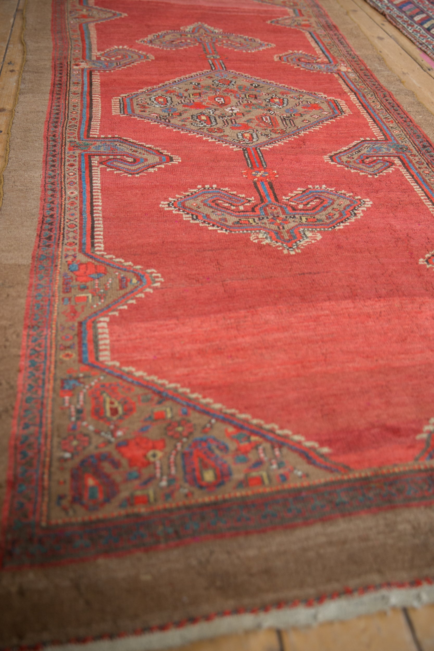 :: Hexagonal center medallion with interior botehs interconnected by checkered vines. Adorned at either opposing end by ram's horn stylized oversize finials atop an open abrashed field. Colors and shades include: Cherry red, tomato red, camel, sky blue, pale gold, sand, jade green, and more. Condition notes: Areas of pile and knot heads. Most of the original side cord selvages are intact or restored. Fully secured sides and ends. Length on one side measures approximately four inches shorter than the other at 7'10", within normal margins for type and age. Recently professionally cleaned ready for in-home use! Many years of enjoyment to come with this hand knotted Persian Camel Hair Serab rug runner made in Persia circa 1920's vintage. Size measures 3'11" x 8'2".