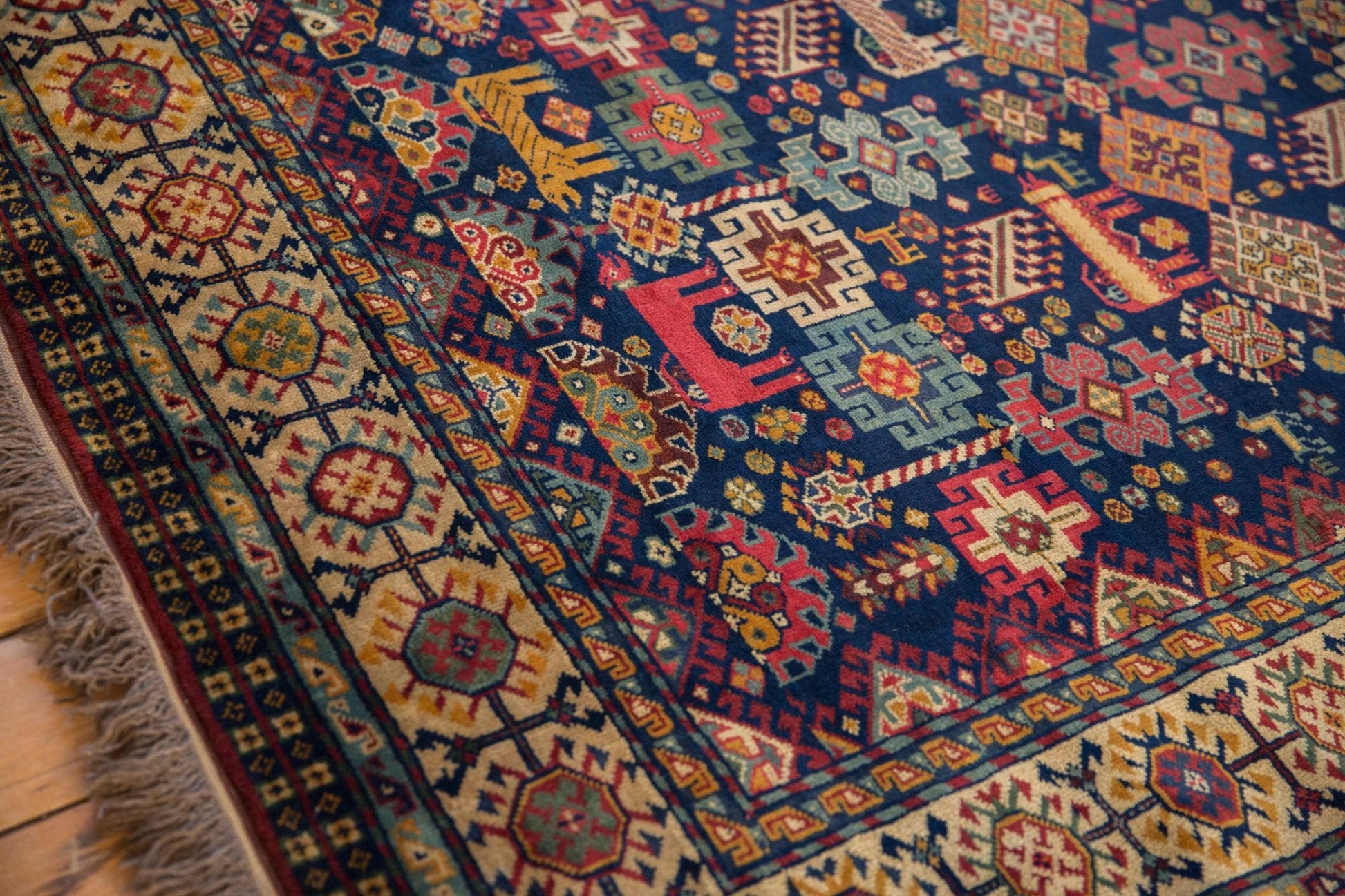 :: Allover covered field in a bounty of colorful plants, animals and floral designs! Colors and shades include: Cobalt blue, antique ivory, cherry red, sky blue, powder blue, gold and more. Condition notes: Like-new, original full pile height even across. Original side cord selvages intact. Fully secured sides and ends. Recently professionally cleaned ready for in-home use! Many years of enjoyment to come with this hand knotted Indian Shiraz design carpet made in India circa 1990's vintage. Size measures 5'4" x 6'5".