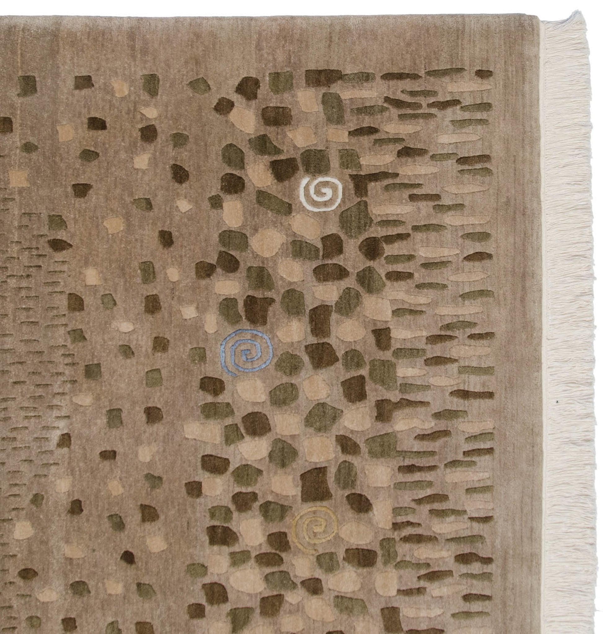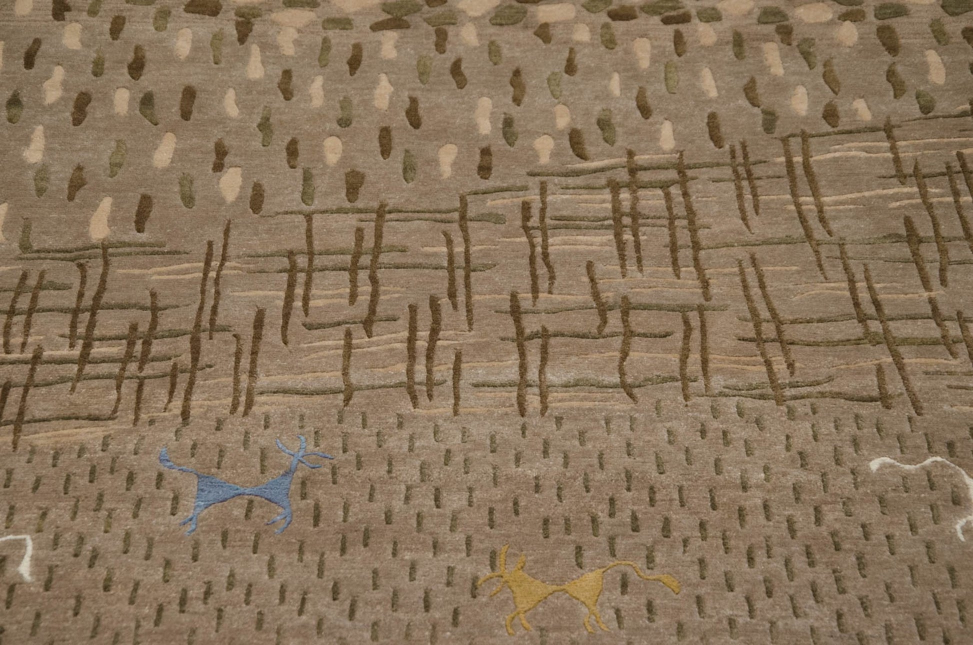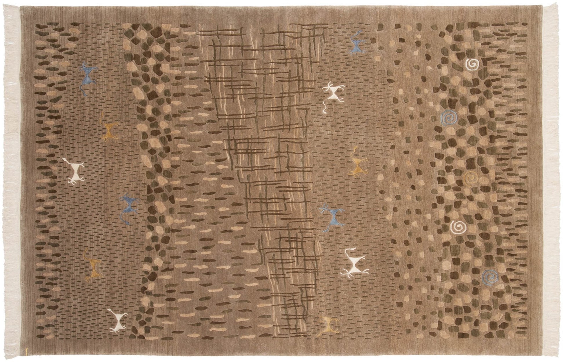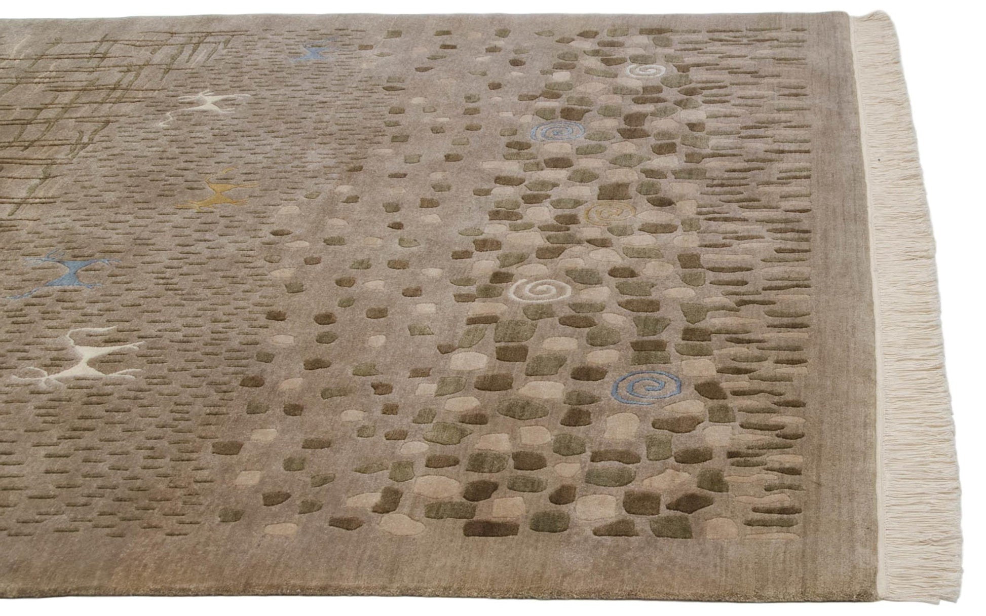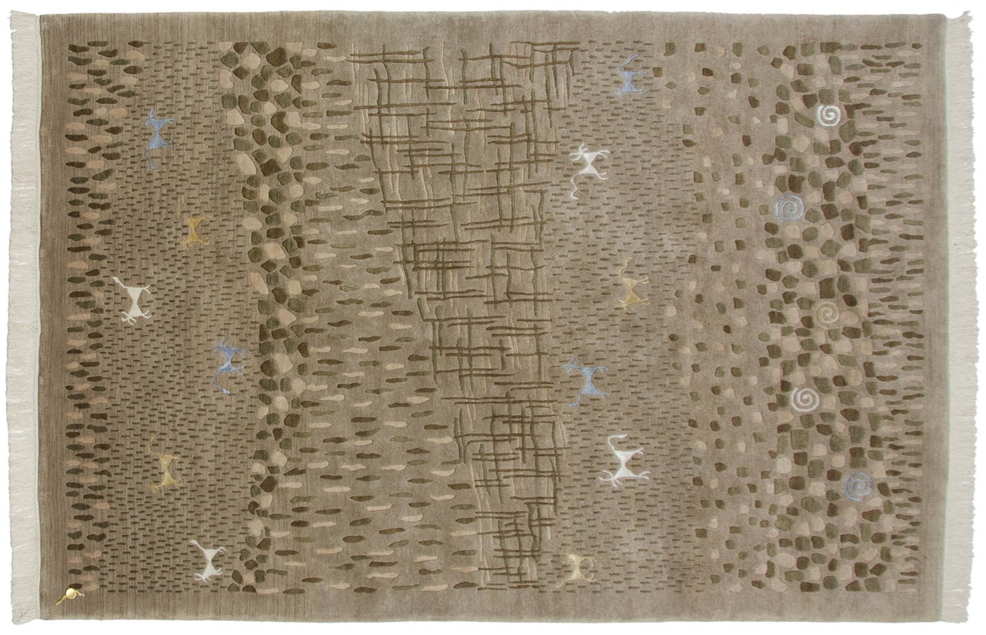 :: Kindly note the photos show fringe, although we've since expertly removed the fringe. Fringe tassels are now docked to the end of the plain weave kilim, which is secured to the back of the carpet. The finish now shows as clean and modern with proper anchoring and securing with stitching and no glue. Pictorial interpretation of a landscape complete with a tree line, rocky areas, cross-hatched water area, pinwheel spirals, and four-legged animals, all in a folk art rendering with simplistic and somewhat primitive character, albeit filled with subtle details and nuances. All animals and pinwheel spirals are woven in art silk. Colors and shades include: Natural gray, beige, dark olive green, ivory, dusty gold, and pale slate blue. Condition notes: Like-new, original full pile height even across. Original side cord selvages intact. Fully secured sides and ends. Recently professionally cleaned ready for in-home use! Many years of enjoyment to come with this hand woven Indian Folk Art design carpet made in India circa 2000-2010 vintage. Size measures 6' x 9'.