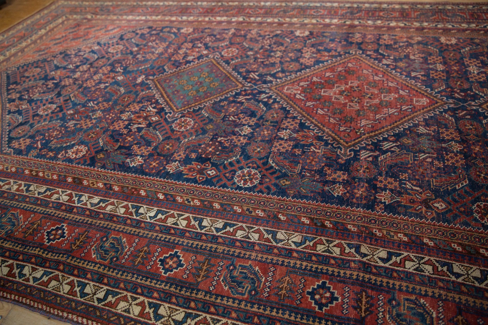 :: Unusually large proportioned afshar / tribal weaving. Triple center medallion atop an allover covered field in a herati inspired motif. Excellent contrast and unique motif for the type, while still embodying many of the traditional design elements, such as birds and animals throughout. Colors and shades include: Cherry red, mallard green, saffron yellow, sky blue, indigo, ivory, and more. Condition notes: Mostly even wear across to knot heads with faint areas of foundation showing through. Fully secured sides and ends. Recently professionally cleaned ready for in-home use! Many years of enjoyment to come with this hand knotted Persian Afshar made in Persia circa 1920's vintage. Size measures 7'6" x 16'2".