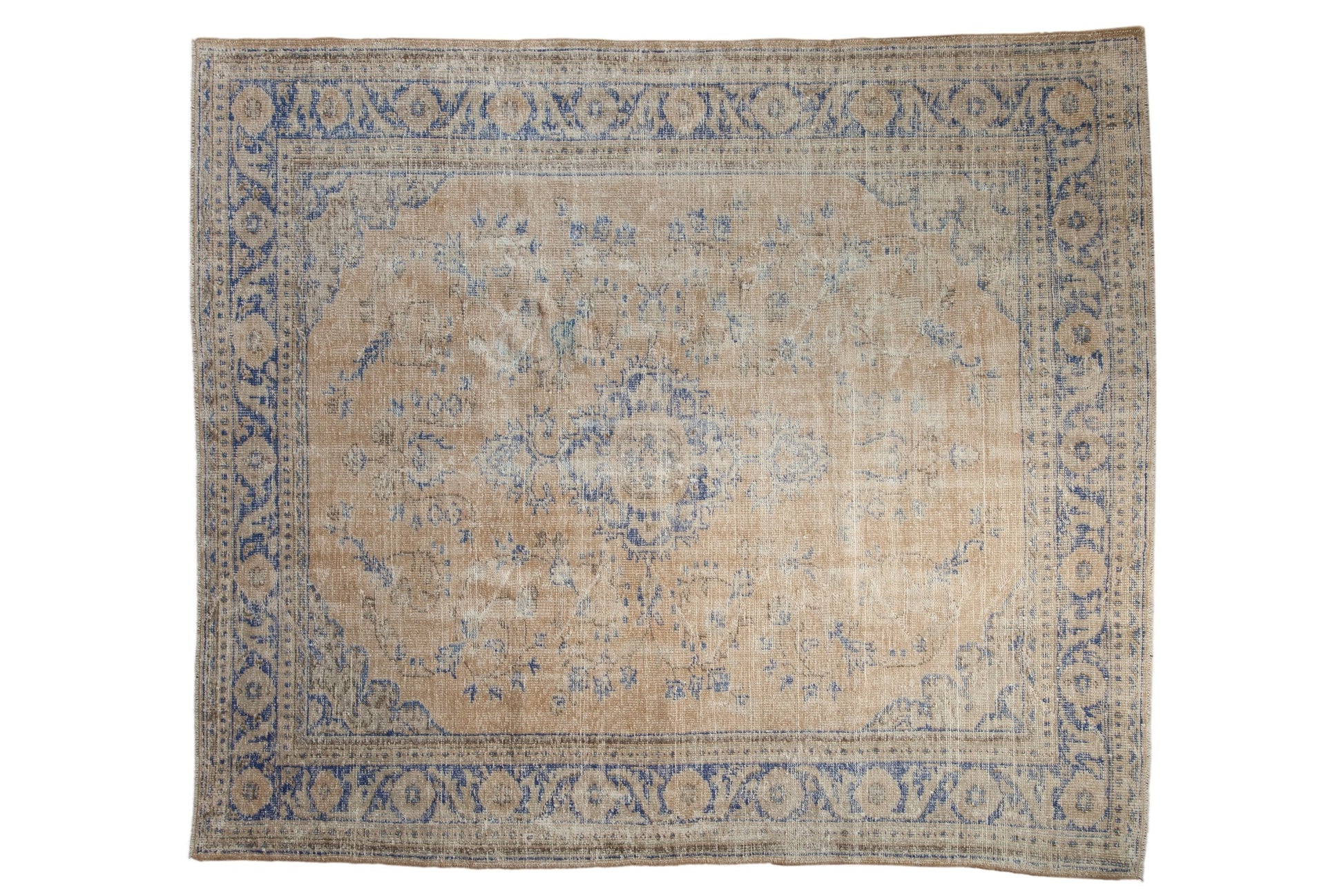 :: Roundel center medallion with quatrefoil starburst interior floral design motif wrapped by minor scalloped Rococo stylized outlines surrounded by long stemmed blossoms with minor buds, flowers, and serrated leaves. Unusual size and proportions. Colors and shades include: Dark cream, beige, sand, ivory, cobalt blue, pale coffee brown, and more. Condition notes: Wear across to foundation and knot heads. Most of the original side cord selvages are intact or restored. Fully secured sides and ends. For processing purposes, this and other rugs of the type may have painted numbers on the reverse side. Recently professionally cleaned ready for in-home use! Many years of enjoyment to come with this hand knotted Turkish Oushak carpet made in Turkey circa 1950's vintage. Size measures 7'9" x 8'9".