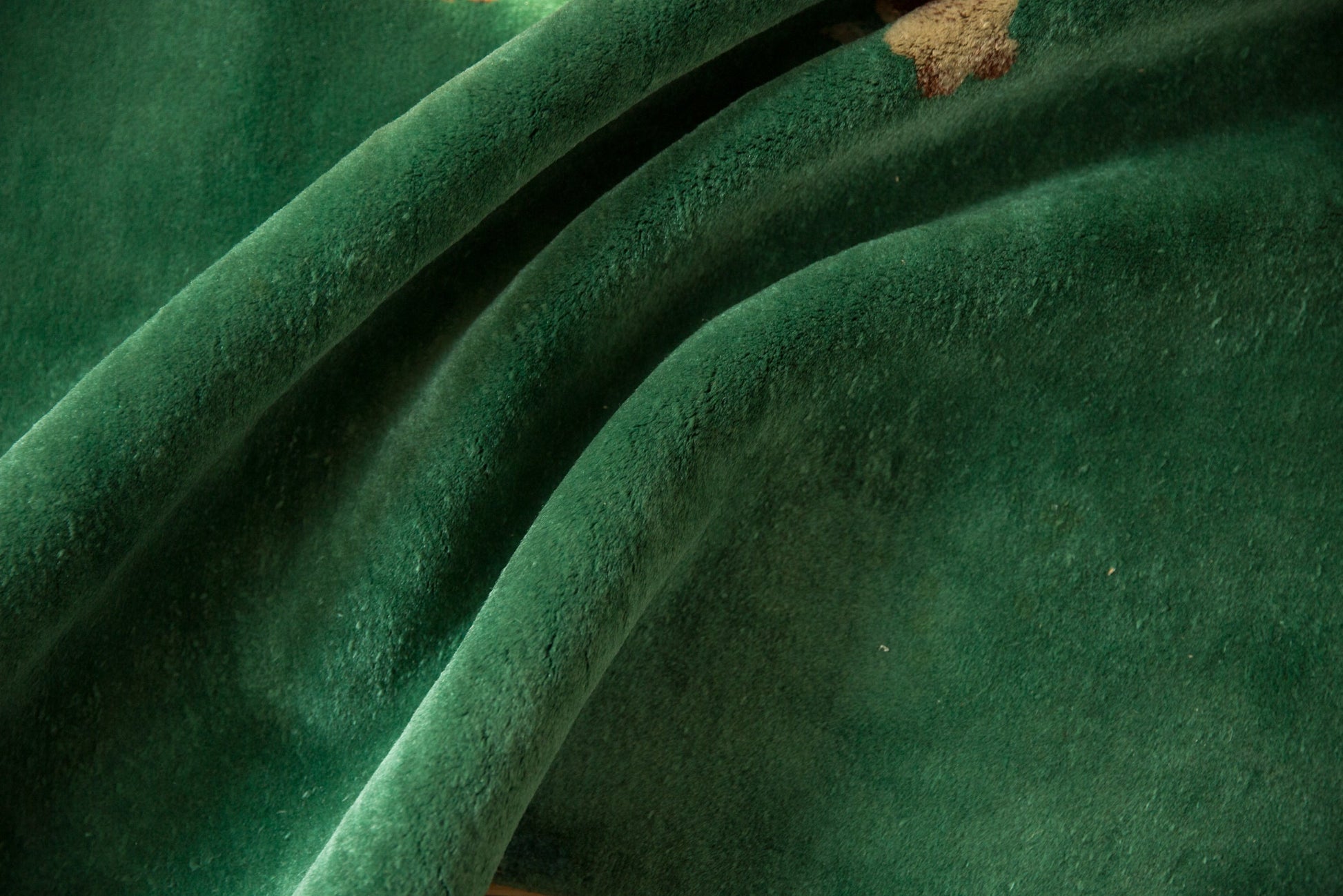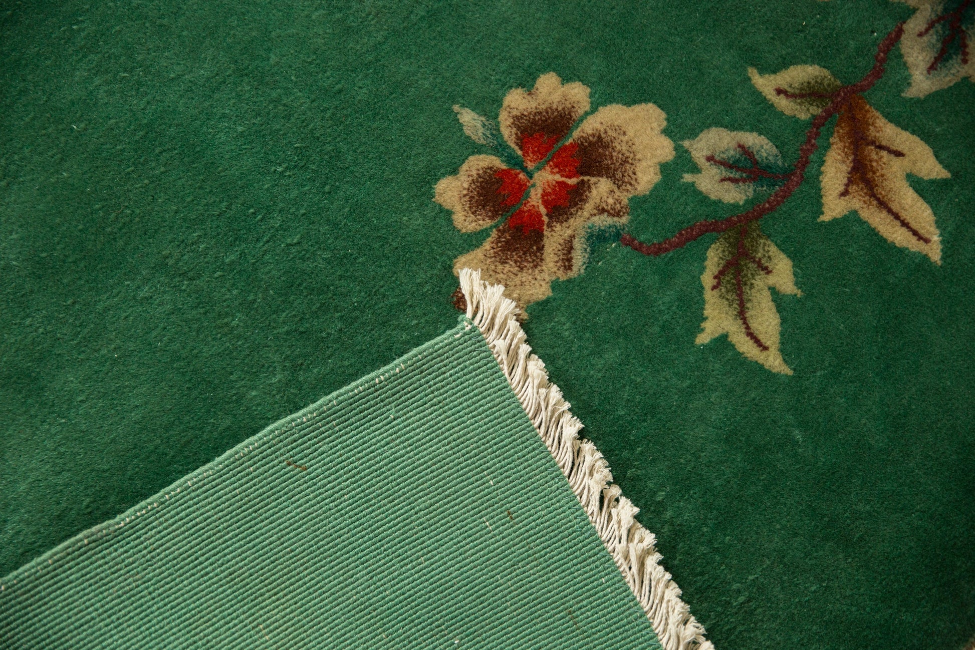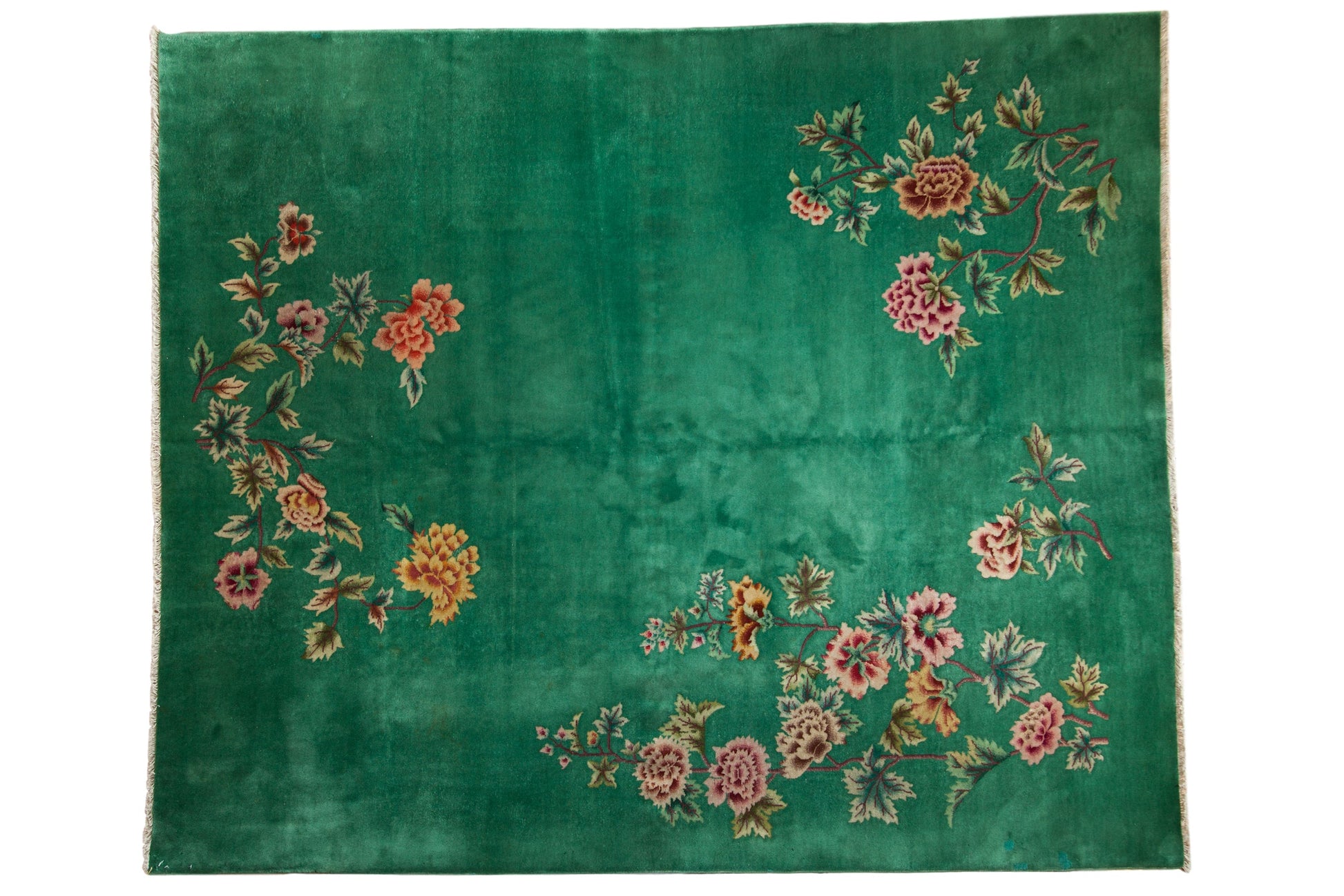 :: Predominantly open field with expressive oversized floral sprays in highly intricate detail. Colors and shades include: Emerald green, ivory, blush, wine red, saffron yellow, and more. Condition notes: Mostly even short pile across. Most of the original side cord selvages are intact or restored. Fully secured sides and ends. Recently professionally cleaned ready for in-home use! Many years of enjoyment to come with this hand knotted Chinese Nichols Art Deco carpet made in China circa 1920's vintage. Size measures 7'10" x 9'4".